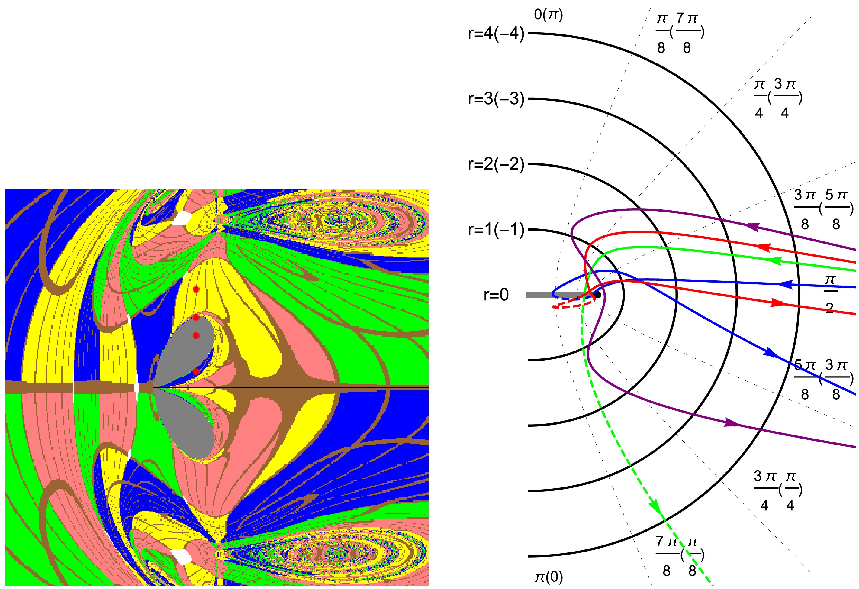 Figure 6.  (color online) Photon trajectories in the $ (r-\theta) $ plane for the Brans-Dicke-Kerr spacetime with $ a=1.05,\omega=10 $ under different initial conditions. Black half-ellipses denote surfaces of constant Boyer-Lindquist radius r(with $ r<0 $ cases indicated in parentheses), while black dashed hyperbolas correspond to surfaces of constant latitude coordinate θ(with the distribution of these surfaces for $ r<0 $ shown in parentheses). The colored curves represent photon trajectories for $ x=-0.3 $ with different values of β(purple, red, green, and blue correspond to $ y=1.5, 1.074, 0.8, 0.25 $), corresponding to the four red points marked on the image of the left panel. The solid portions of the curves correspond to radius $ r>0 $, while dashed portions correspond to $ r<0 $.