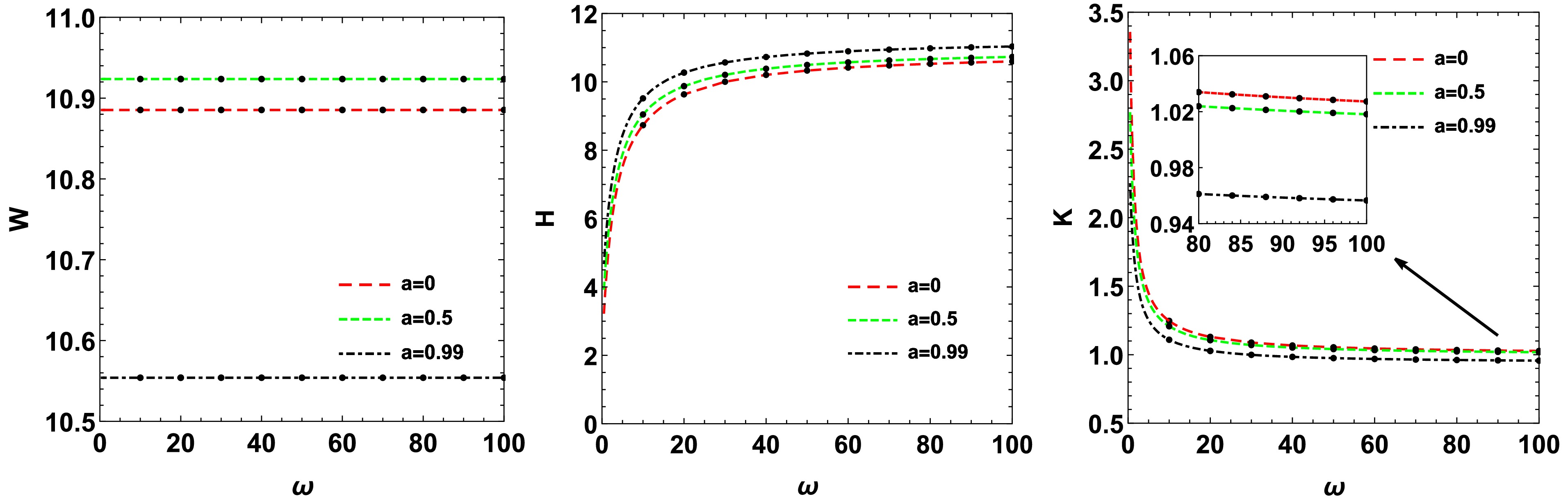 Figure 7.  (color online) The change in the shadow width W, the height H and the oblateness K with the Brans-Dicke parameter ω in the Brans-Dicke-Kerr spacetime for different rotation parameter a.