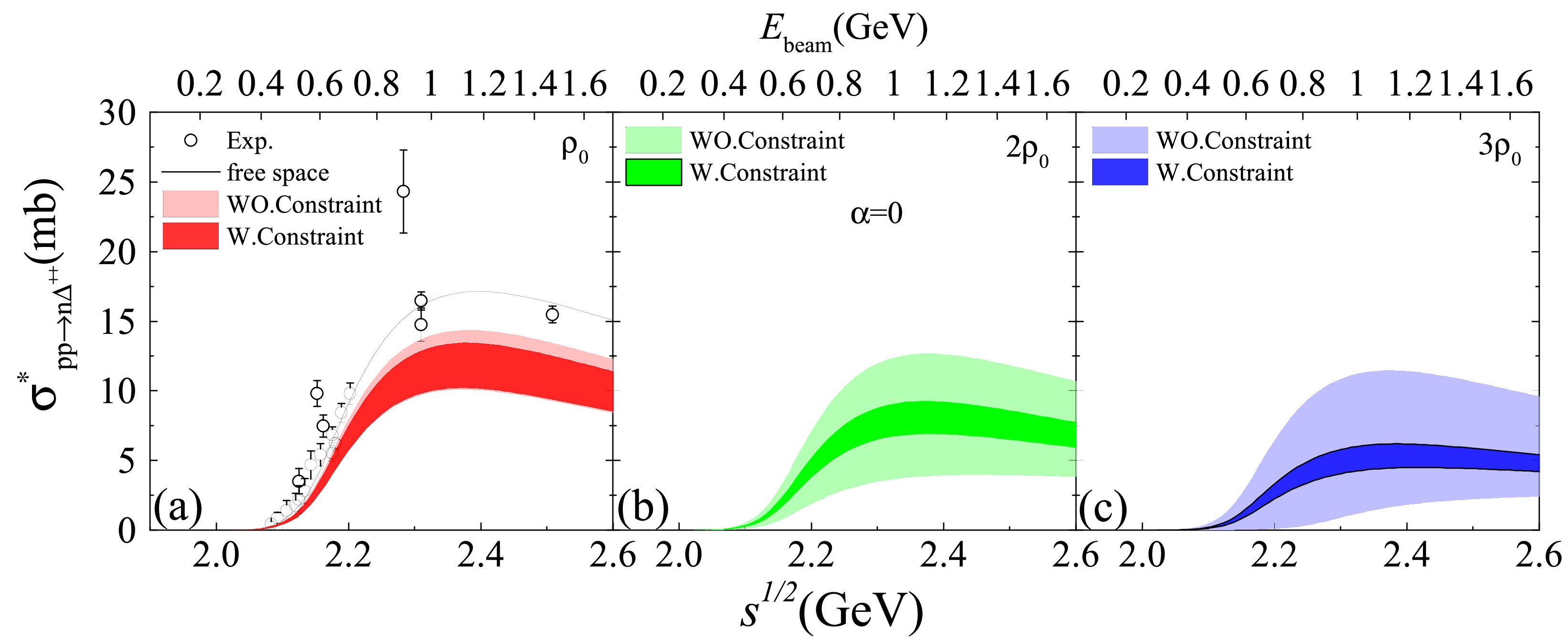 $pp \to n\Delta^{++}$ cross section as function of$ \sqrt{s} $ in symmetric nuclear matter. The left panel shows the cross section in free space and at$\rho_0 $ , while the middle and right panels present results at$ 2\rho_0 $ and$ 3\rho_0 $ , respectively. The experimental data are taken from Ref. [45].Since there is no isospin splitting of effective masses in symmetric nuclear matter, the in-medium cross section for