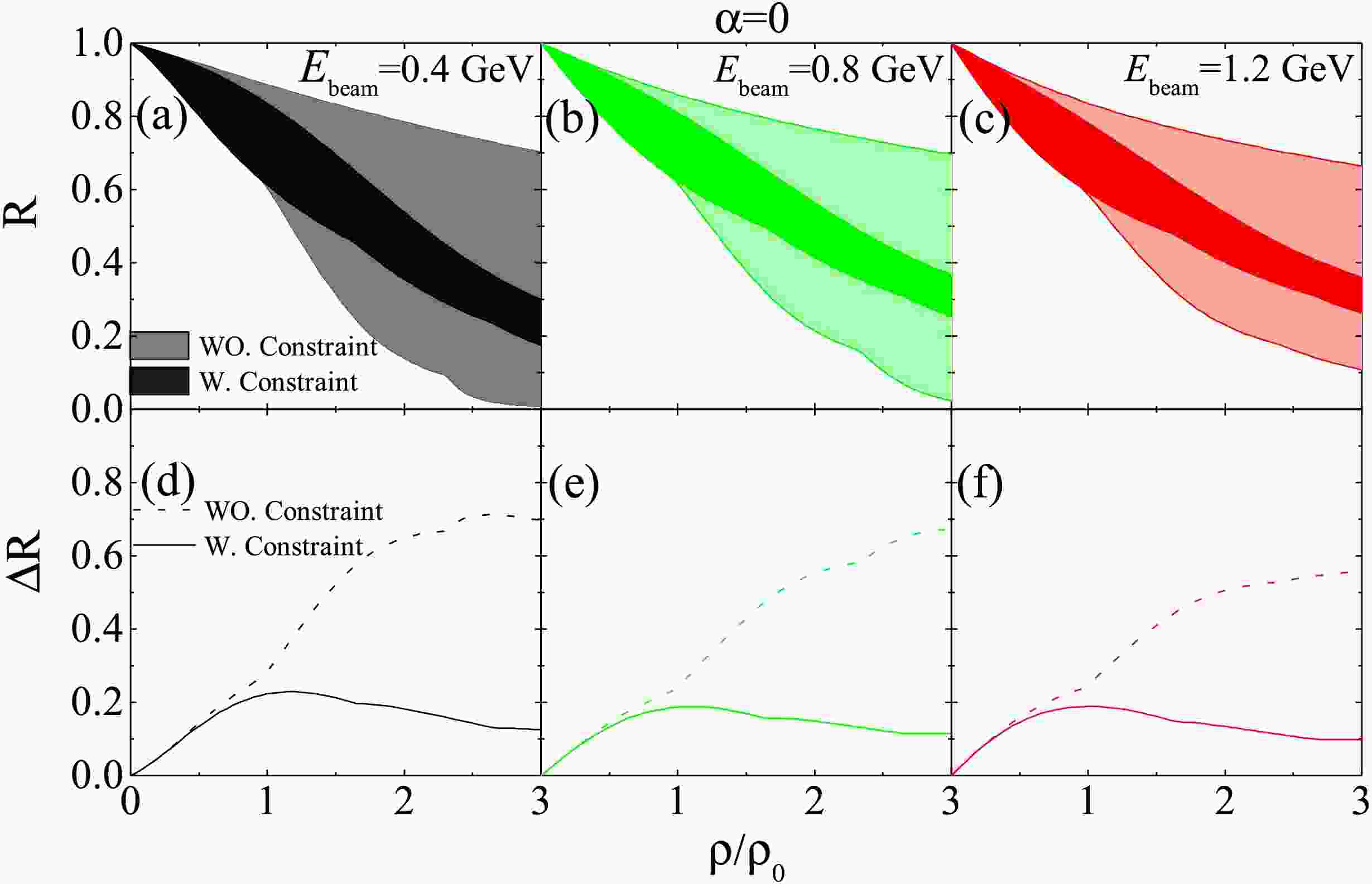 $\Delta R = R_{\max} - R_{\min}$ (bottom panels) as a function of$\rho/\rho_0$ for beam energies$E_{\mathrm{beam}} = 0.4, 0.8,$ and$1.2$ GeV in symmetric nuclear matter. The unconstrained$\Delta R$ increases with density, but once constraints are applied to the in-medium cross sections, the spread in R is notably reduced compared to the unconstrained results. For instance, at$E_{\mathrm{beam}} = 0.4$ GeV,$\Delta R$ decreases from$0.283$ to$0.219$ at$\rho_0$ , from$0.648$ to$0.182$ at$2\rho_0$ , and from$0.696$ to$0.125$ at$3\rho_0$ . This reduction stems from the decreased uncertainty in effective masses (see Fig. 1).