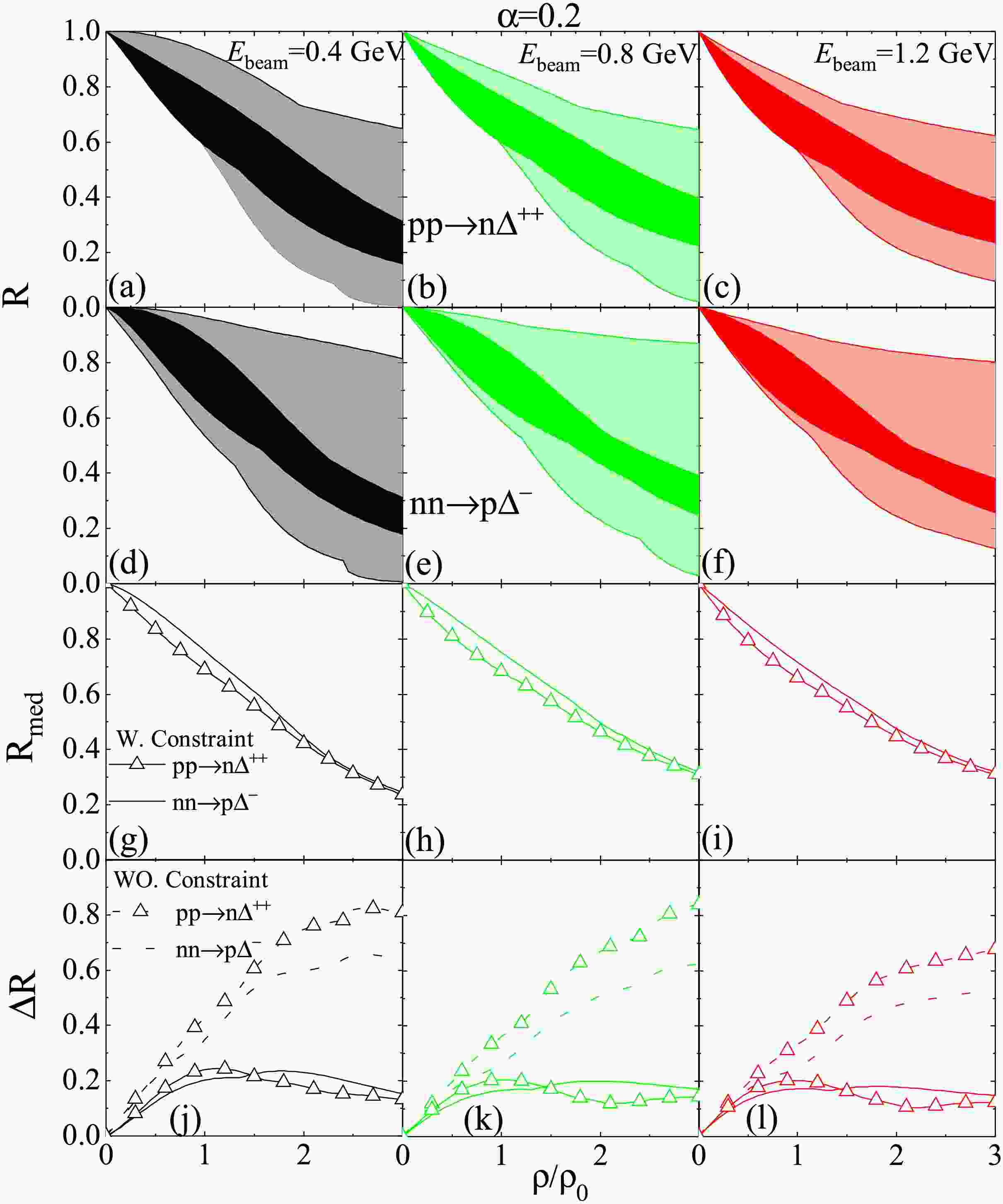$pp\to n\Delta^{++}$ and$nn\to p \Delta^{-}$ channels as examples to illustrate the in-medium cross sections in asymmetric nuclear matter. In Fig. 4, we plot R for$pp\to n\Delta^{++}$ (panels (a), (b), (c)) and$nn\to p \Delta^{-}$ (panels (d), (e), (f)), the constrained median values$R_{\mathrm{med}}$ (panels (g), (h), (i)), and the range$\Delta R$ (panels (j), (k), (l)) as functions of$\rho/\rho_0$ in asymmetric nuclear matter with$\alpha=0.2$ for$E_{\mathrm{beam}}=0.4$ , 0.8, and 1.2 GeV.