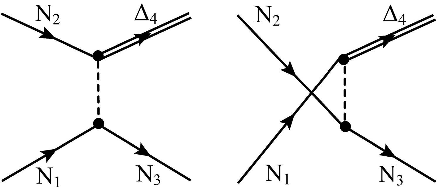 $ NN\rightarrow N\Delta $ processes are shown in Fig. B1, which include the direct and exchange processes. The$ {\cal{M}}^* $ -matrix derived from the interaction Lagrangian Eq. (A3) can be written by using the standard procedure [10],