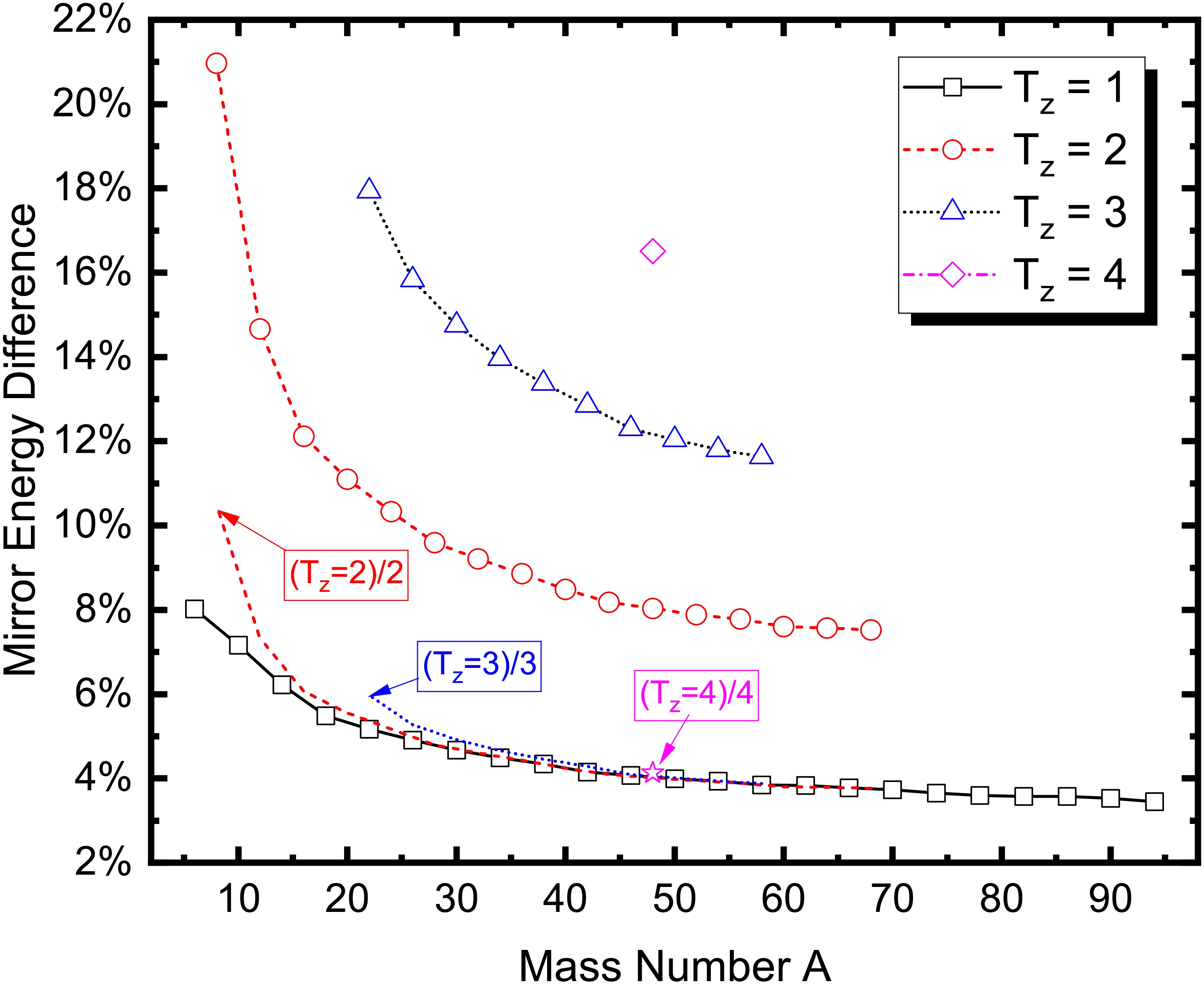 $ T_z $ represents the third component of isospin ($ \ T_z = \dfrac{N - Z}{2} $ , where the$ T_z $ of the proton is$ -1/2 $ , and that of the neutron is$ 1/2 $ [1]). Figure 1 shows the experiment mirror energy difference (MED) in the available 50 even-even nuclei [44], including four categories labelled$ T_z=1 $ ,$ T_z=2 $ ,$ T_z=3 $ , and$ T_z=4 $ . Indeed, the MED with ($ T_z $ =2)/2, ($ T_z $ =3)/3, and ($ T_z $ =4)/4 will nearly coincide with that of$ T_z=1 $ . As the mass number of mirror nuclei increases, the MED between the pairs tends to approach a constant value of approximately 3.6%. This finding is significant as it indicates a structural pattern closely linked to the intrinsic properties of protons and neutrons, rather than being a random or isolated phenomenon. Remarkably, this 3.6% difference closely matches the mass disparity between two protons and two neutrons, suggesting that the origin of the mass discrepancy lies fundamentally in the nucleons themselves. The mass difference in mirror nuclei primarily arises from the interplay between the masses of protons and neutrons and the electromagnetic interactions within the nucleus. Moreover, the Coulomb force plays a pivotal role in contributing to the MED between mirror nuclei. The$ ab $ $ initio $ calculations has investigated of isospin-symmetry breaking in MED, primarily arising from the dominate s-wave components. [45, 46] The observed 3.6% mass difference in Fig. 1 reflects this intrinsic nucleon mass difference magnified by the nuclear environment.