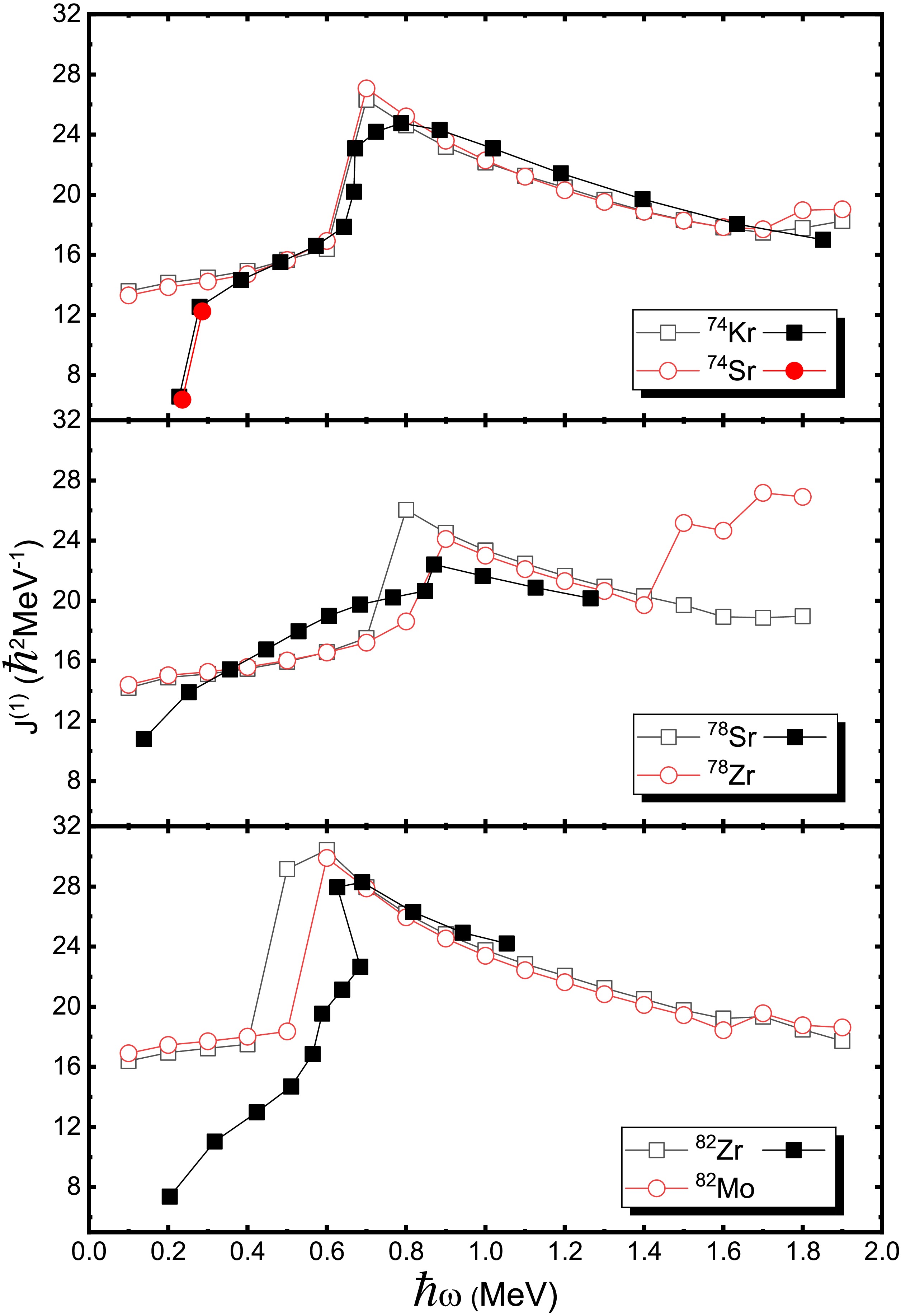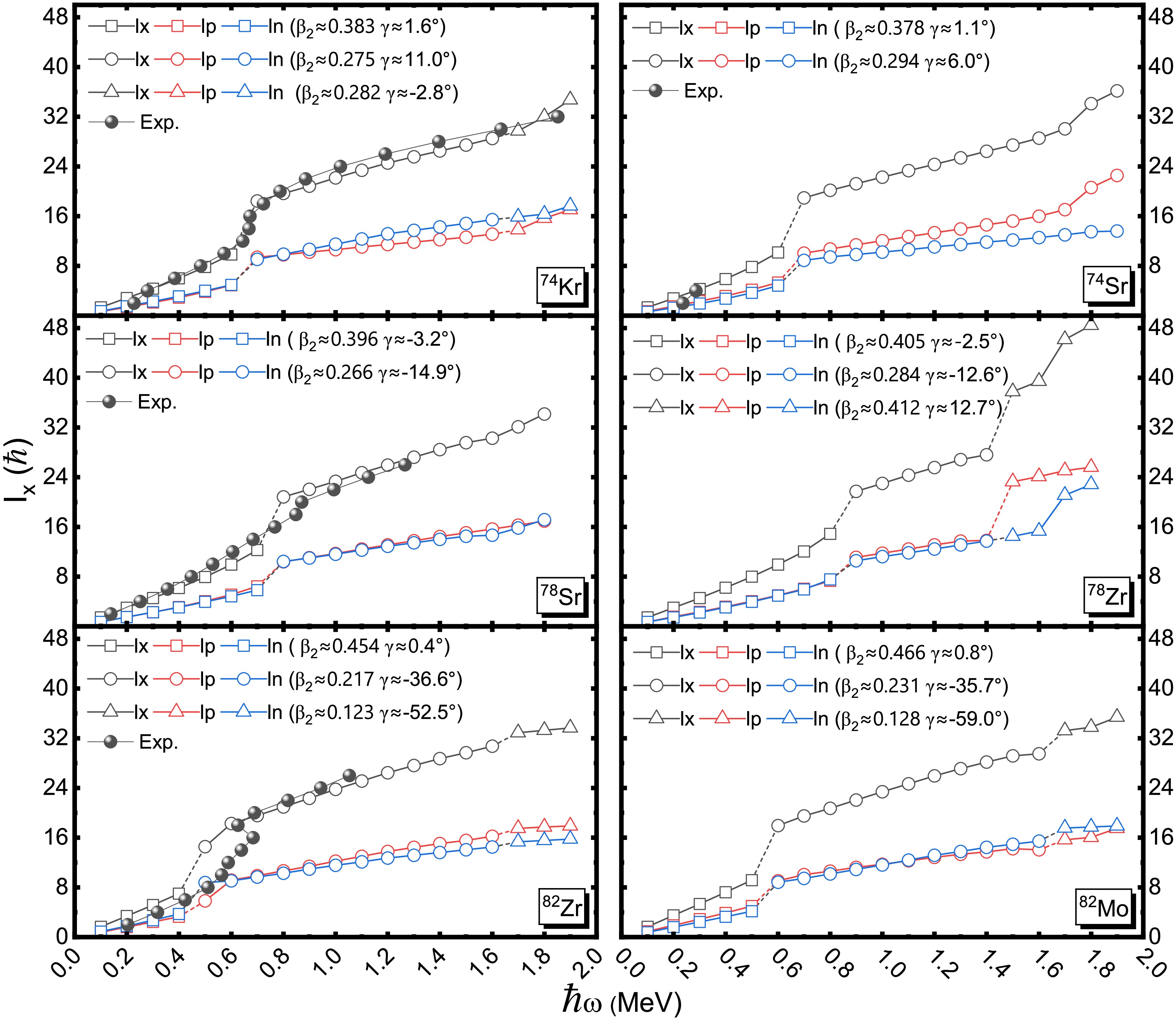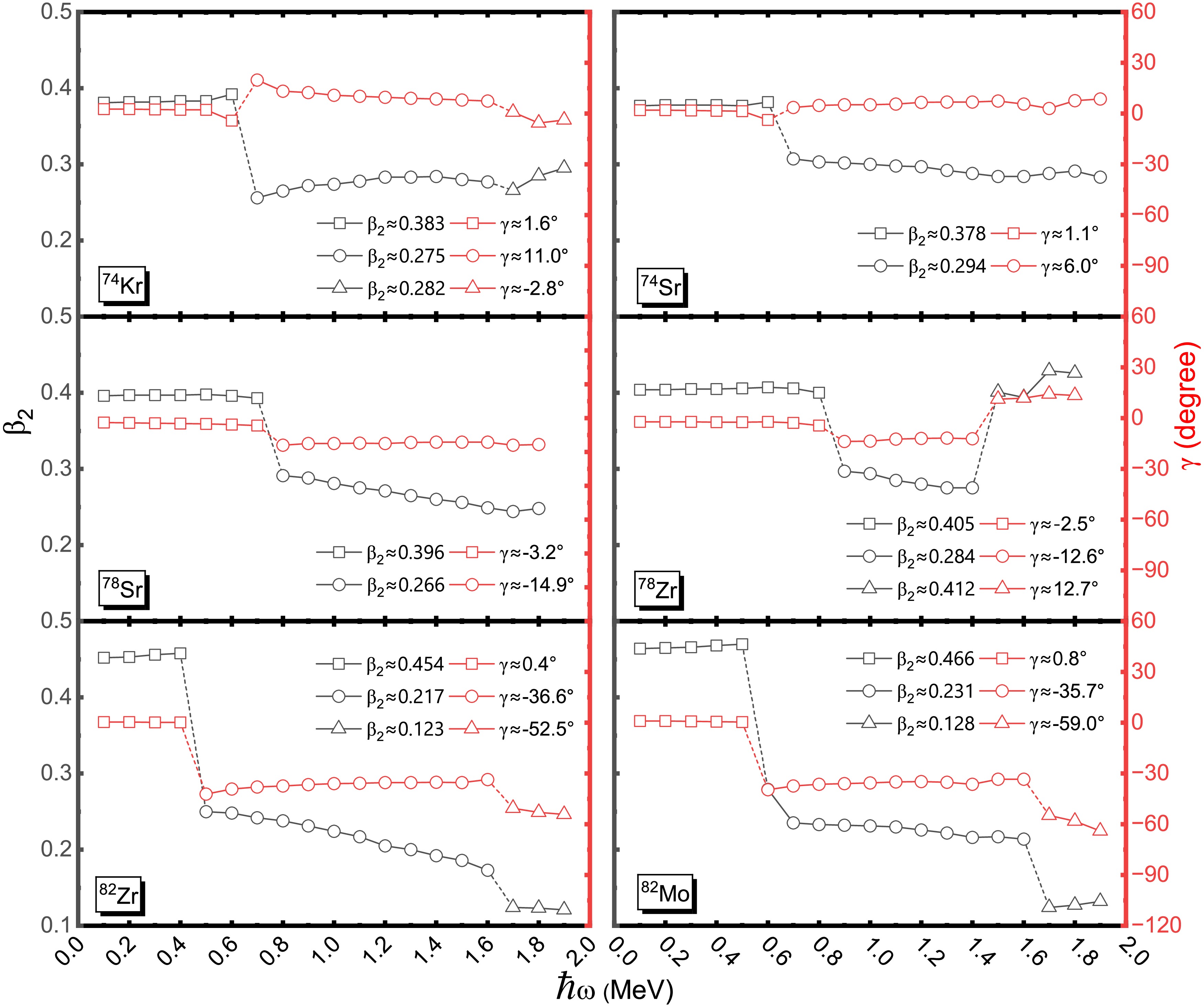 $\beta_4$ deformation at each given ($\beta_2,\gamma$ ) point. The neighboring energy contours is 200 keV. The solid circle, square and triangle represent the first, second, and third minima, respectively. Note that the first minima has been shifted to zero.Figure 3 illustrates the evolution of the MOIs as functions of rotational frequency for three pairs of mirror nuclei: 74Kr-74Sr, 78Sr-78Zr and 82Zr-82Mo. Though the experimental data are lacking for these mirror nuclei, the mirror symmetry could also be discussed to some extent based on the present computational results. Generally, our calculations successfully reproduce the experimentally observed upbending phenomenon in the MOIs across all these nuclei. As discussed in Ref. [21], high-spin structures of 74Kr and 78Sr are dominated by the shell gaps at large prolate deformation while 82Zr seems to exhibit shape coexistence for its anomaly behavior. The upbending, characterized by a sudden increase in the MOIs at certain rotational frequencies, reflects underlying changes in the nuclear structure, such as the alignment of nucleon pairs and shape transitions during rotation. In the case of 74Kr and 74Sr, the calculated changes in the MOIs show remarkable consistency between the mirror partners, demonstrating strong mirror symmetry in their rotational behavior. This agreement validates the reliability of our theoretical approach in capturing the rotational dynamics of these nuclei and highlights the symmetry between proton and neutron configurations in mirror systems at this mass region. However, deviations from perfect mirror symmetry emerge in the pairs 78Sr and 78Zr, as well as 82Zr and 82Mo. Specifically, the upbending in 78Sr and 82Zr occurs slightly earlier with increasing rotational frequency compared to their respective mirror counterparts, 78Zr and 82Mo. As can be seen from Fig. 3, the first two data points seriously deviate from the data of 74Kr and 74Sr. In the cases of 82Zr and 82Mo, our calculation results are also inconsistent with the experimental data before upward bending. This deviation may be attributed to the limitation of the adopted basis with fixed deformation, which is inadequate to characterize the near-ground-state properties dominated by shape coexistence [60]. This subtle asymmetry suggests that factors such as differences in proton and neutron interactions or shell effects may influence the rotational response differently in these nuclei, leading to observable discrepancies in their MOIs evolution. Regarding the rotational properties of 82Zr and 82Mo depicted in Fig. 3, a clarification is necessary. The calculated MOIs and deformations at rotational frequencies (e.g.,