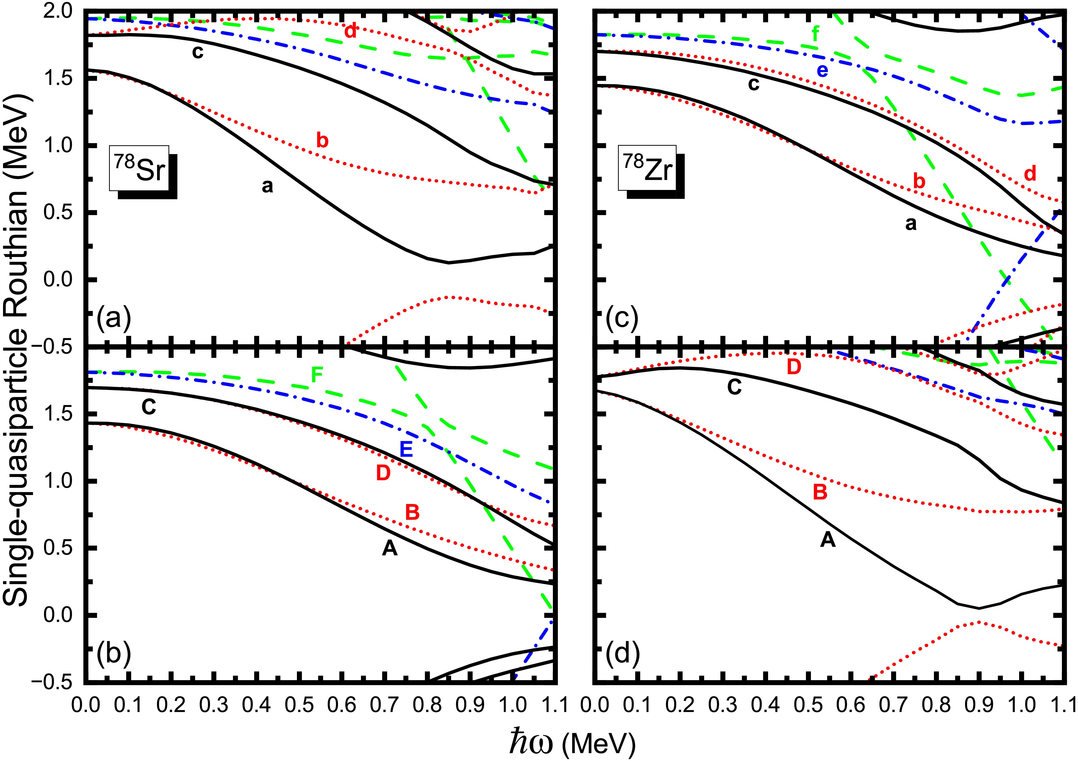 $ \hbar\omega $ . The deformation is taken from the ground-state equilibrium deformation$ (\beta_2, \gamma, \beta_4) = (0.396, -3.2, -0.013) $ in 78Sr and (0.405,$-$ 2.5,$-$ 0.016), respectively. The parity and signature ($\pi,\alpha$ ) are: black solid line$ (+, +1/2) $ , red dotted line$ (+, -1/2) $ , blue dot-dashed line$ (-, +1/2) $ , and green dashed line$ (-, -1/2) $ . The letters marking the quasiparticle orbits are consistent with those in Tables 3.78Sr $(\pi,\alpha)_n$ Label (p) Single-particle orbit $(\pi,\alpha)_n$ Label (n) Single-particle orbit $(+, +1/2)_1$ a $1g_{9/2}[431]3/2$ $(+, +1/2)_1$ A $1g_{9/2}[422]5/2$ $(+, -1/2)_1$ b $1g_{9/2}[431]3/2$ $(+, -1/2)_1$ B $1g_{9/2}[422]5/2$ $(+, +1/2)_2$ c $1g_{9/2}[422]5/2$ $(+, +1/2)_2$ C $1g_{9/2}[431]1/2$ $(+, -1/2)_2$ d $1g_{9/2}[422]5/2$ $(+, -1/2)_2$ D $1g_{9/2}[431]1/2$ $(-, +1/2)_1$ E $1f_{5/2}[301]3/2$ $(-, -1/2)_1$ F $1f_{5/2}[301]3/2$ 78Zr $(\pi,\alpha)_n$ Label (p) Single-particle orbit $(\pi,\alpha)_n$ Label (n) Single-particle orbit $(+, +1/2)_1$ a $1g_{9/2}[422]5/2$ $(+, +1/2)_1$ A $1g_{9/2}[431]3/2$ $(+, -1/2)_1$ b $1g_{9/2}[422]5/2$ $(+, -1/2)_1$ B $1g_{9/2}[431]3/2$ $(+, +1/2)_2$ c $1g_{9/2}[431]1/2$ $(+, +1/2)_2$ C $1g_{9/2}[422]5/2$ $(+, -1/2)_2$ d $1g_{9/2}[431]1/2$ $(+, -1/2)_2$ D $1g_{9/2}[422]5/2$ $(-, +1/2)_1$ e $1f_{5/2}[301]3/2$ $(-, -1/2)_1$ f $1f_{5/2}[301]3/2$ Table 3. At