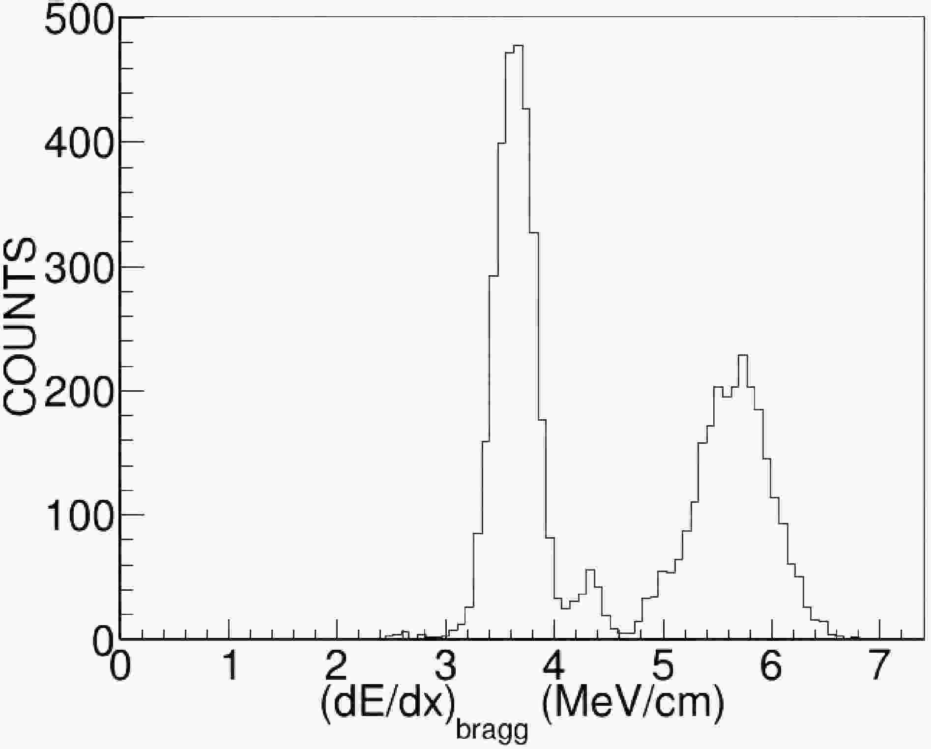 $(dE/dx)_{\mathrm{Bragg}}$ for events with track_e$> 10$ MeV and angle$< 10^{\circ}$ is shown in Fig. 11. A small peak appears just above the$^{19}{\rm{O}}$ peak, whose centroid is higher by a factor of 1.22 relative to that of$^{19}{\rm{O}}$ . According to energy-loss calculations, the ratios of the maximum$dE/dx$ values are 1, 1.15, and 1.28 for$^{19}{\rm{O}}$ ,$^{20}{\rm{F}}$ , and$^{23}{\rm{Ne}}$ , respectively. The corresponding complementary partners would be$^{11}$ B for$^{20}{\rm{F}}$ and$^{8}{\rm{Be}}$ for$^{23}{\rm{Ne}}$ . Examination of the reconstructed track images confirms that only$^{23}{\rm{Ne}}$ trajectories were present, without any accompanying heavy recoil ions Fig. 12. This behavior is readily explained if the complementary reaction product,$^{8}{\rm{Be}}$ in its ground or excited state, promptly decays into two α particles. These α particles remain undetected in our TPC because their deposited energies in TPC fall below the detection threshold of 0.12 MeV. Therefore this small peak is attributed to$^{23}{\rm{Ne}}$ . Unfortunately the resolution of$(dE/dx)_{\mathrm{Bragg}}$ gets worse at angles larger than$10^{\circ}$ . Therefore we can not obtain the total yield of$^{23}{\rm{Ne}}$ in this work.