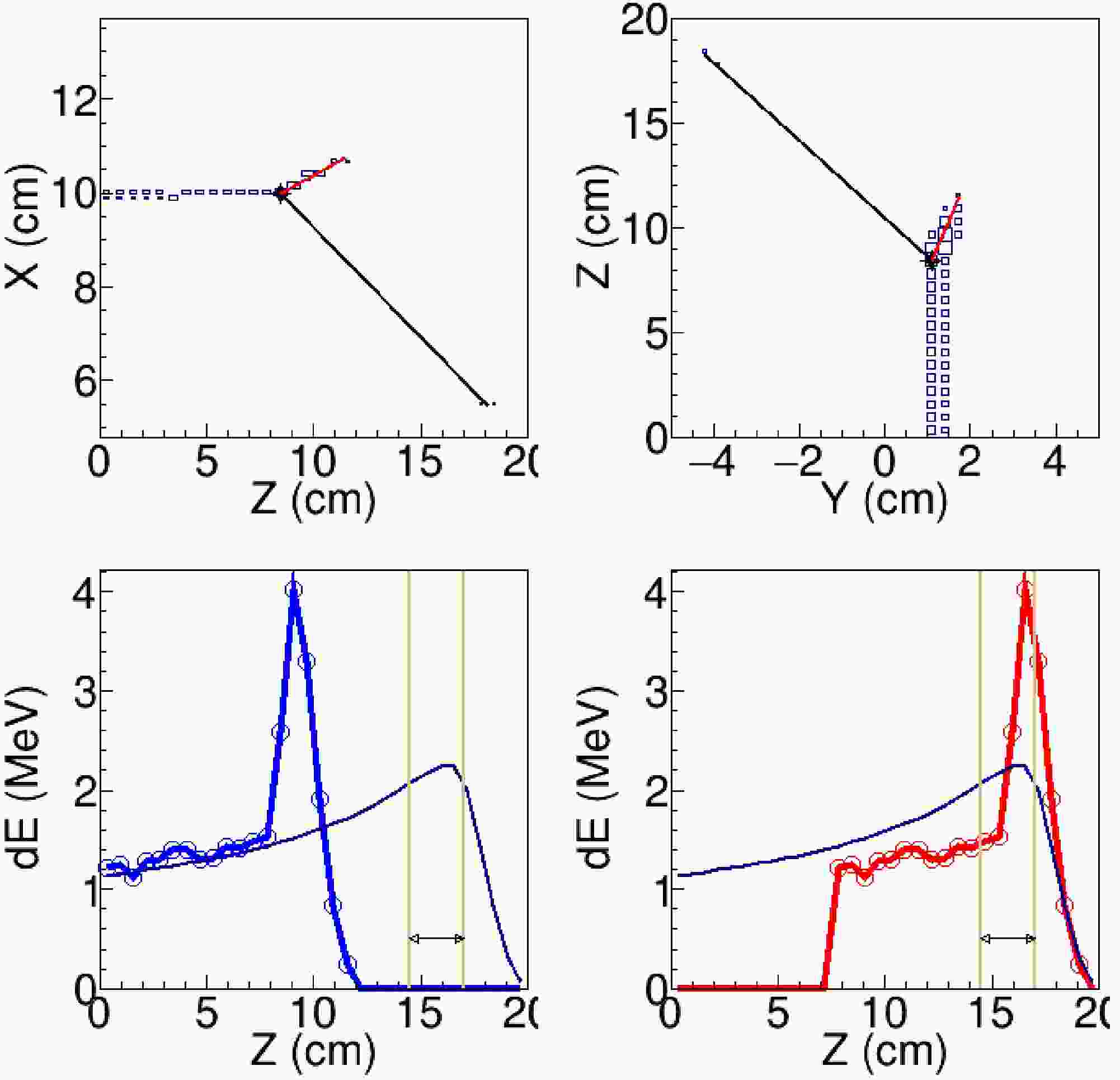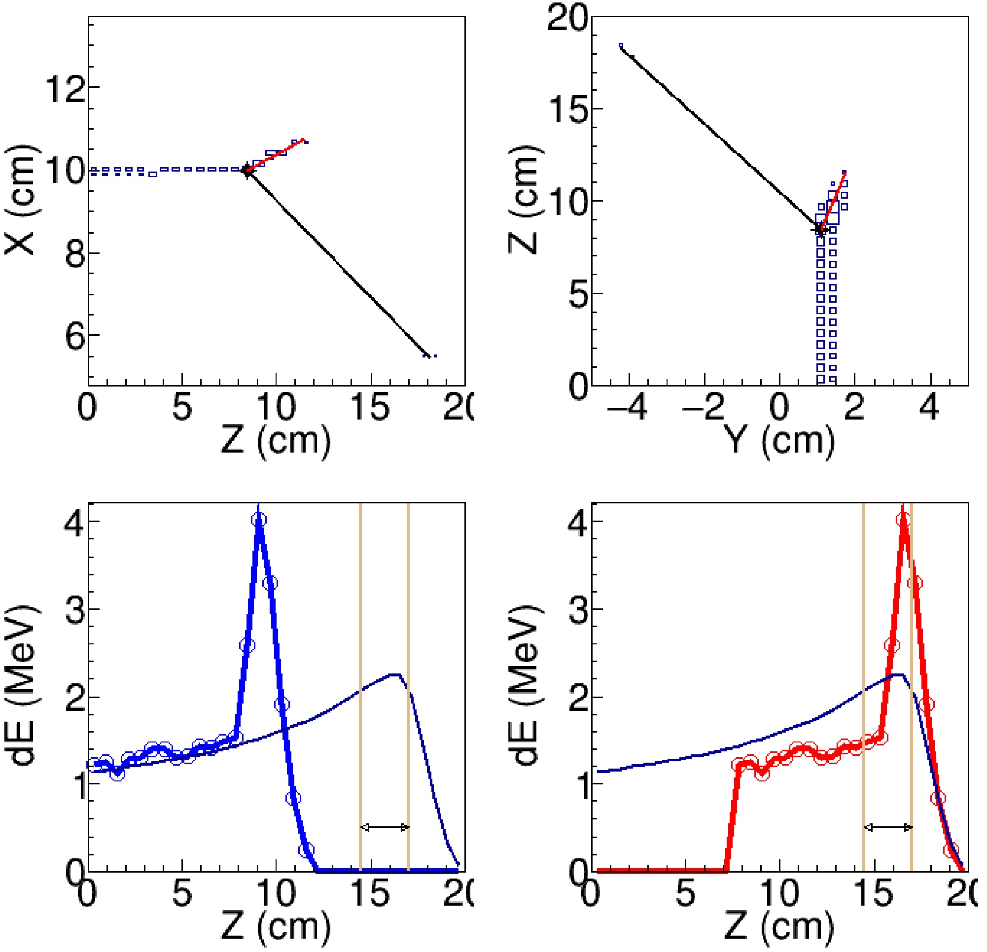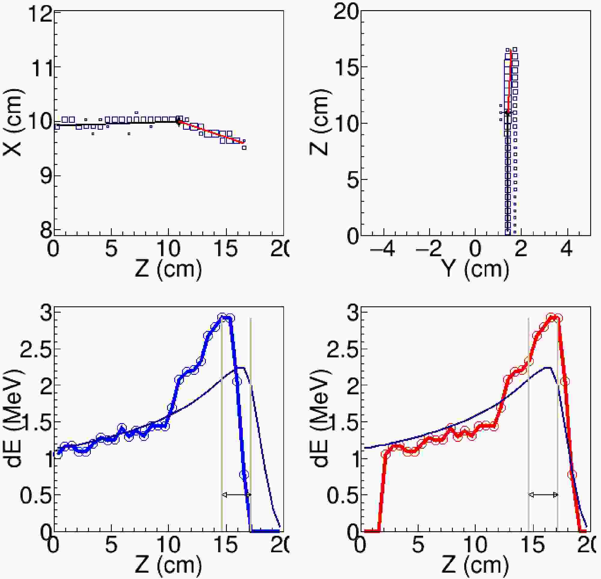 Figure 5. (color online) One-track fusion event. (Upper left) Track projection in the X–Z plane. (Upper right) Track projection in the Y–Z plane. (Lower left) Energy-loss curve along the Z-axis, with the measured energy-loss profile shown in blue and the template curve in black. (Lower right) Energy-loss curve after shifting to the position that yields the minimum