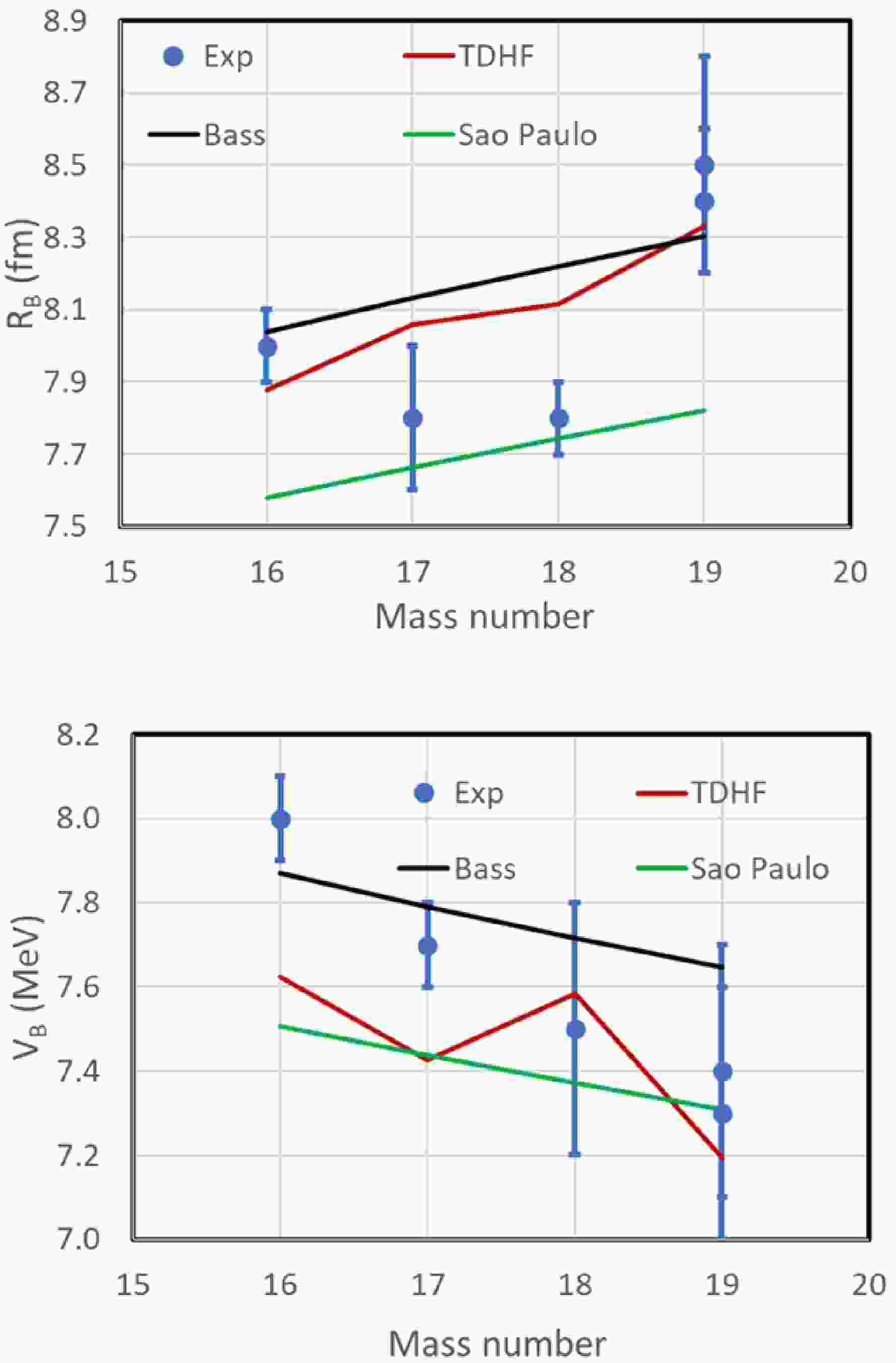 Figure 15. (color online) (Upper panel) Coulomb barrier radius (RB) vs. the projectile mass number for the 16,17,18,19O+12C fusion reaction; (Lower panel) Coulomb barrier height (VB) vs. the projectile mass number. The green, black and dark red lines represent the theoretical prediction of São-Paulo potential, Bass potential and TDHF, respectively.