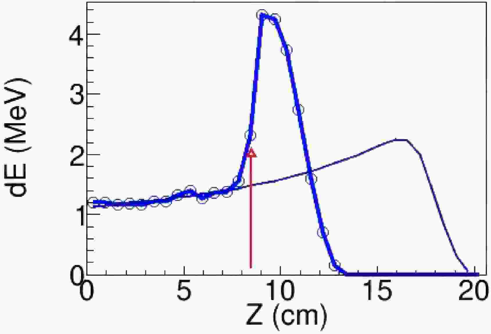 $dE(i)$ represents the energy loss in the$i-{\rm{th}}$ column. The recorded events were classified into two categories, reacted events and un-reacted events, based on the condition$dE(i) > 1.3 \, dE(i-1)$ , with i ranging from 1 to 31. The location of the i-th column was then identified as the reaction position, and the i-th column was labeled as the react_column in this paper. An example of the reaction vertex determination is shown in Fig. 4. The exact 3D location of the reaction vertex was determined by the intersection of tracks of the beam particle and reaction products.