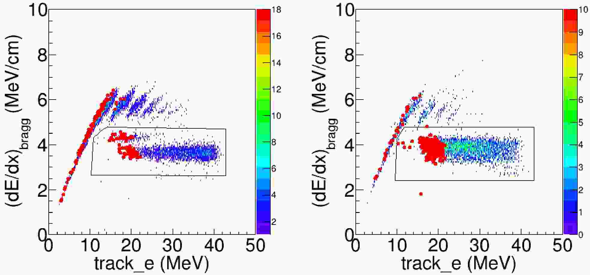 $(dE/dx)_{\mathrm{Bragg}}$ versus the summed energies of the reaction-product tracks with laboratory scattering angles less than$10^\circ$ (left panel) and between$10^\circ$ and$20^\circ$ (Right panel). The red dots indicates reaction events on the 18th pad. The black box denotes the non-fusion events. -