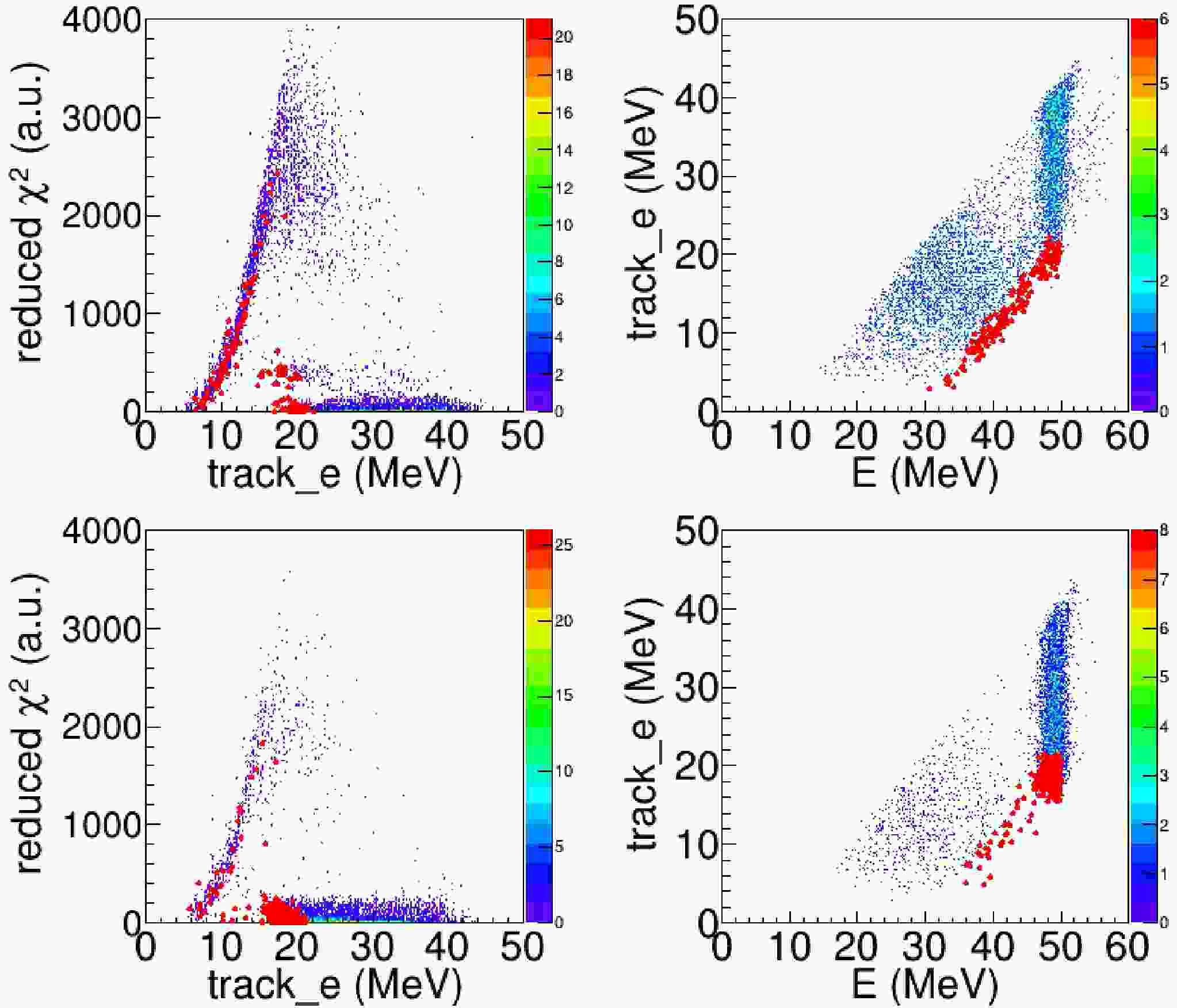 $\chi^2$ vs. the summed energy of the reaction-product track for the reacted events with scattering angles less than$10^{\circ}$ ; (Upper right panel) The summed energy of the reaction-product track vs. the total energy deposition in the TPC for the events with scattering angles less than$10^{\circ}$ . The lower left and right panels are identical to the upper left and right panels except for the reacted events with scattering angles between$10^{\circ}$ and$20^{\circ}$ . The red dots indicates the candidates for the fusion reaction, identified by the cut shown in Fig. 7 on the 18th pad.Here we take the reaction events occurring on the 18th pad as an example to illustrate our analysis of the fusion events. These events have the lowest reaction energy,