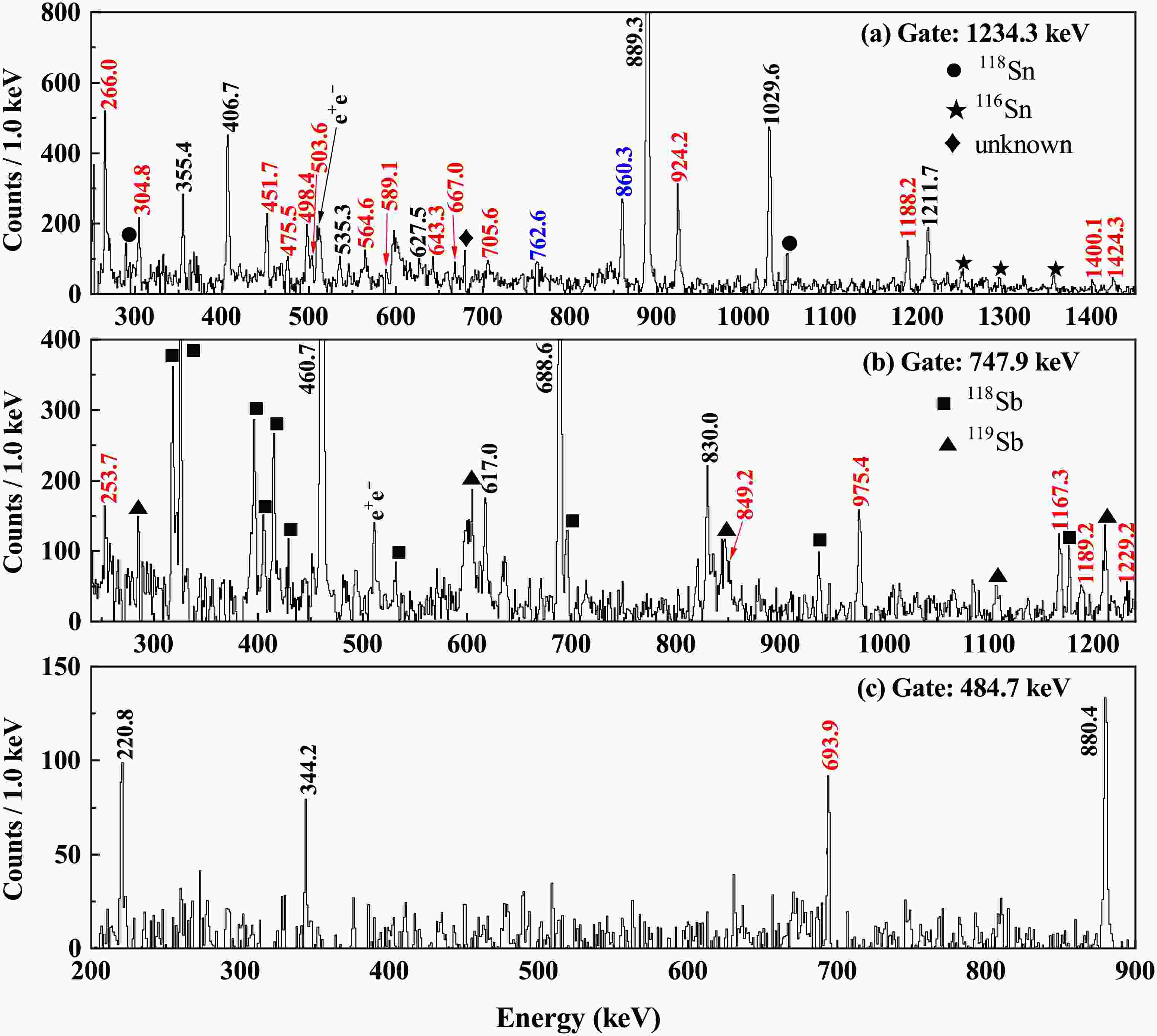 Figure 3. (color online) γ-ray coincidence spectra gated on the (a) 1234.3 keV, (b) 747.9 keV, and (c) 484.7 keV transitions in