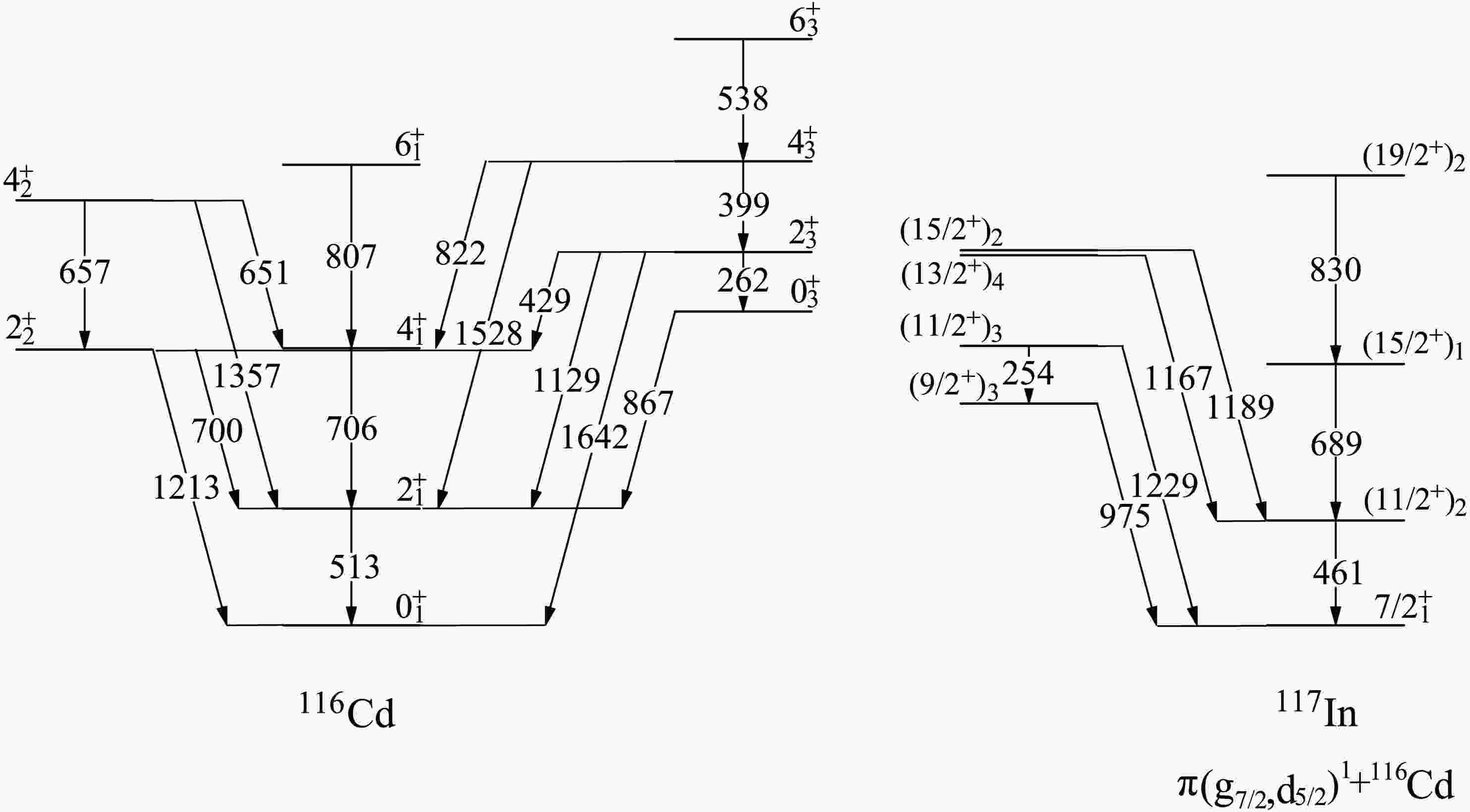 $ \Delta I = 0 $ dipole transition. Based on the assumption that spin increases with excitation energy, it is assigned as a quadrupole transition. Therefore, the spin-parities of the 2376.4 and 2398.3 keV levels are assigned as (13/2+) and (15/2+), respectively. Because these four levels do not form a clear band structure, only tentative interpretations based on the current level scheme are proposed in the present work. Figure 4 displays a comparison between the low-lying excited states in$ ^{116} {\rm{Cd}}$ [43, 44] and the levels in structure A of$ ^{117} {\rm{In}}$ . The energy of the$ 7/2^+_1 $ level in$ ^{117} {\rm{In}}$ is set as 0 for the convenience of comparison. As shown in Fig. 4, the (9/2+)3, (11/2+)3 and (13/2+)4, (15/2+)2 states in$ ^{117} {\rm{In}}$ exhibit similar energies and decay behaviors to the 22+ and 42+ states in$ ^{116} {\rm{Cd}}$ , respectively. Therefore, the (9/2+)3, (11/2+)3 and (13/2+)4, (15/2+)2 states in$ ^{117} {\rm{In}}$ are tentatively interpreted as two sets of multiplets originating from the$ \pi (g_{7/2},d_{5/2}) \otimes $ ($ ^{116} {\rm{Cd}}$ , 22+) and$ \pi (g_{7/2},d_{5/2}) \otimes $ ($ ^{116} {\rm{Cd}}$ , 42+) configurations, respectively. The 22+ and 42+ states in$ ^{116} {\rm{Cd}}$ have been explained as originating from collective vibration [44]. Thus, the (9/2+)3, (11/2+)3 and (13/2+)4, and (15/2+)2 levels in$ ^{117} {\rm{In}}$ may also originate from vibrational excitations. -