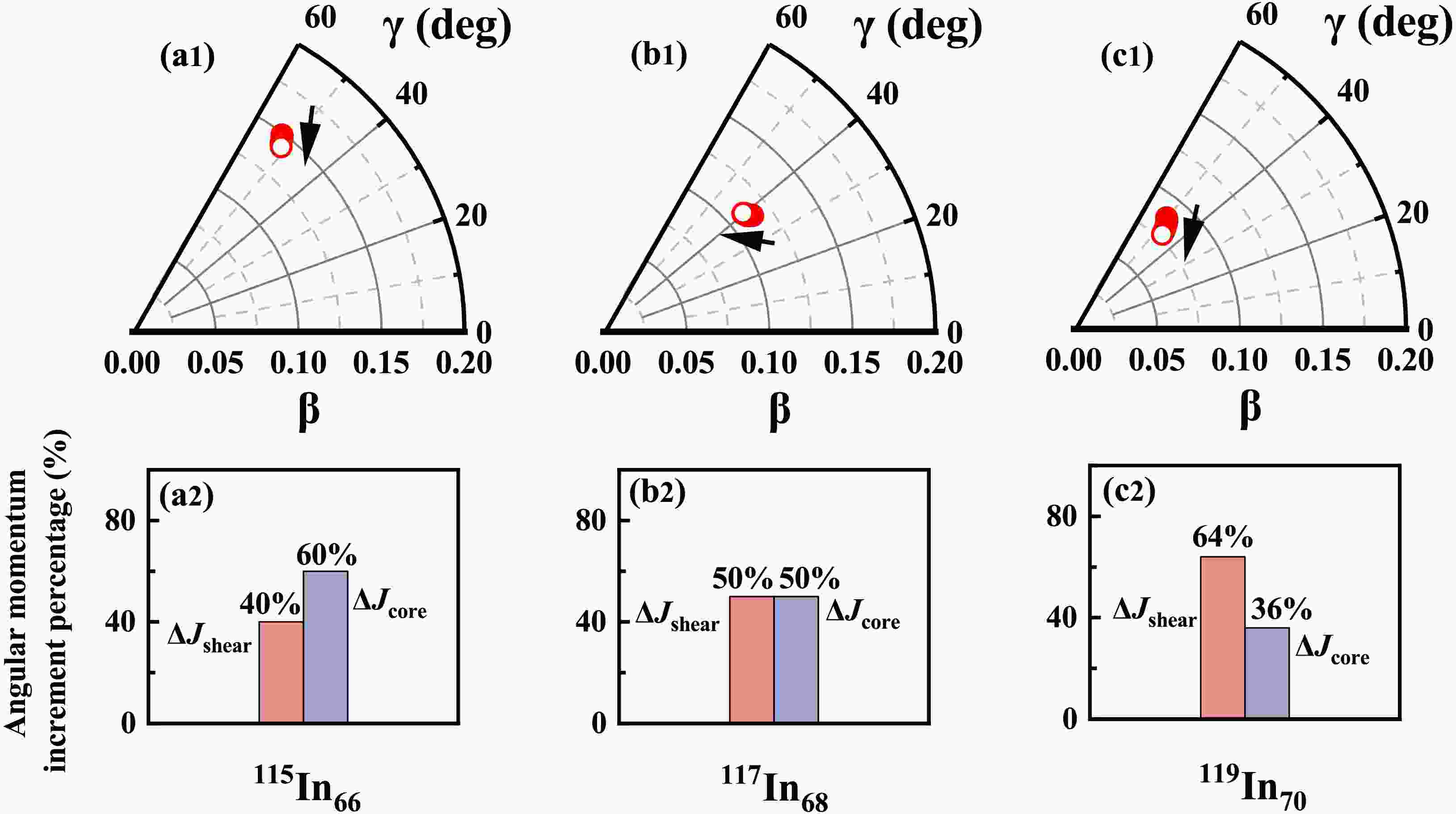 $ \beta_2 $ and γ driven by increasing rotational frequency in the TAC-CDFT calculations for the "stapler" bands of (a1)$ ^{115} {\rm{In}}$ , (b1)$ ^{117} {\rm{In}}$ , and (c1)$ ^{119} {\rm{In}}$ . The arrow indicates the increasing direction of the rotational frequency from 0.08 to 0.36 MeV. The percentages of the contributions to the total angular momentum increment for the rotational frequency of 0.08 to 0.36 MeV from the shears mechanism$ \Delta J\mathrm{_{shear}} $ and core rotation$ \Delta J\mathrm{_{core}} $ in the "stapler" bands of (a2)$ ^{115} {\rm{In}}$ , (b2)$ ^{117} {\rm{In}}$ , and (c2)$ ^{119} {\rm{In}}$ . -