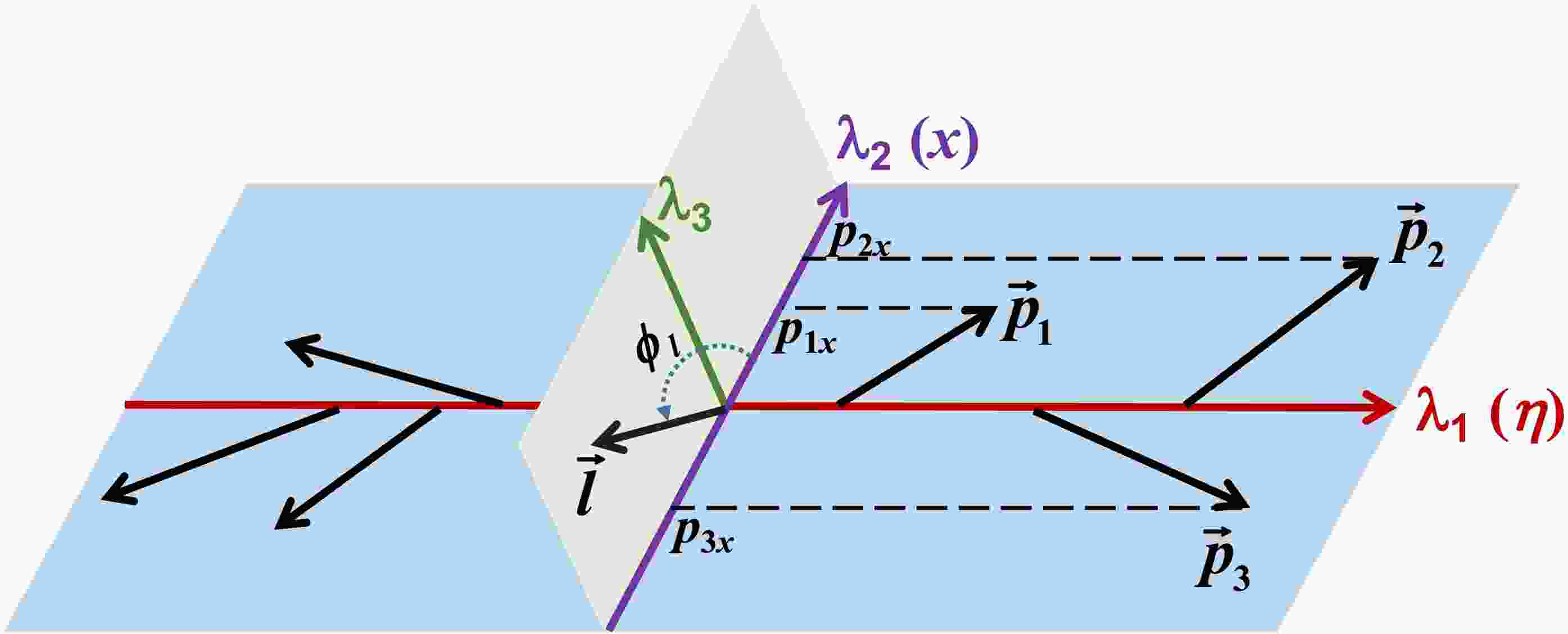 $ {\bf{p}}_{i} $ denotes the three-momentum of jet i, and the summation is performed over all final state jets in an event. Here,$ j,k=1,2,3 $ correspond to the three spatial components. The symmetric 3$ \times $ 3 matrix S has three real eigenvalues and three mutually orthogonal eigenvectors corresponding to these eigenvalues. The determination of these eigenvalues involves solving the characteristic equation of S, which is a cubic equation and the roots can be analytically solved using the Shengjin Formula [86] (see Appendix A). For Euclidean space, considering only the cases with real solutions is sufficient. These three eigenvalues can be ordered as$ \lambda_{1} \geqslant \lambda_{2} \geqslant \lambda_{3}\geqslant 0 $ , with$ \lambda_{1} + \lambda_{2} + \lambda_{3}=1 $ , such that$ \lambda_1 $ is constrained within the range$ \left[\dfrac{1}{3}, 1\right] $ . Events in which all hard partons are closely aligned in a collinear direction (the back-to-back limit) correspond to$ \lambda_1 \approx 1 $ , whereas an approximately isotropic event corresponds to$ \lambda_1 \approx {1}/{3} $ .$ \lambda_{2} $ is restricted to the interval$ \left[0, \dfrac{1}{2}\right] $ . In a planar event, the plane is defined by the eigenvectors corresponding to$ \lambda_{1} $ and$ \lambda_{2} $ .$ \lambda_{3} $ is bounded between$ \left[0, \dfrac{1}{3}\right] $ . It measures the transverse momentum component out of the event plane: a planar event has$ \lambda_{3}=0 $ , whereas an approximately isotropic event has$ \lambda_{3} \approx {1}/{3} $ .We define the modified planarity