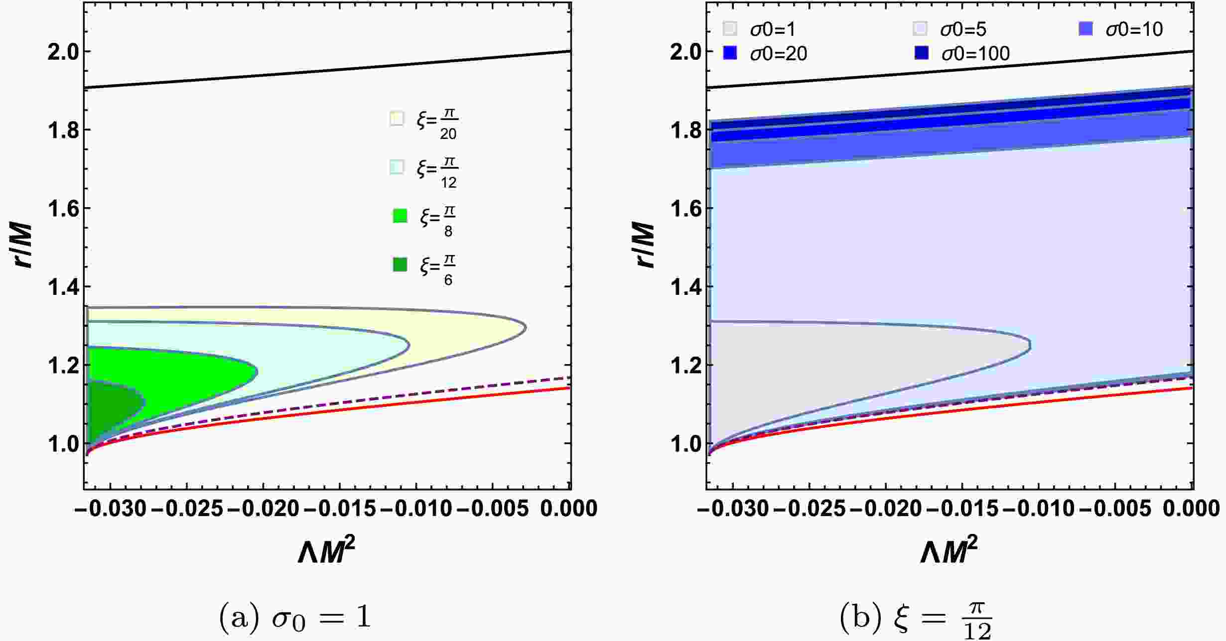 $ \Lambda M^2-r/M $ satisfying the energy extraction condition$ \epsilon^\infty_{-}<0 $ with$ a/M=0.99 $ . Red solid curves, black solid curves, and purple dashed curves represent the radii of the outer event horizon$ r_+ $ , outer ergosphere boundary$ r_{\rm{E}} $ , and circular corotating photon orbit$ r_{{\rm{LR}}} $ , respectively. (a)$ \sigma_0=1 $ with$ \xi=\dfrac{\pi}{6} $ ,$ \dfrac{\pi}{8} $ ,$ \dfrac{\pi}{12} $ ,$ \dfrac{\pi}{20} $ . (b)$ \xi=\dfrac{\pi}{12} $ with$ \sigma_0 $ =1, 5, 10, 20, 100.