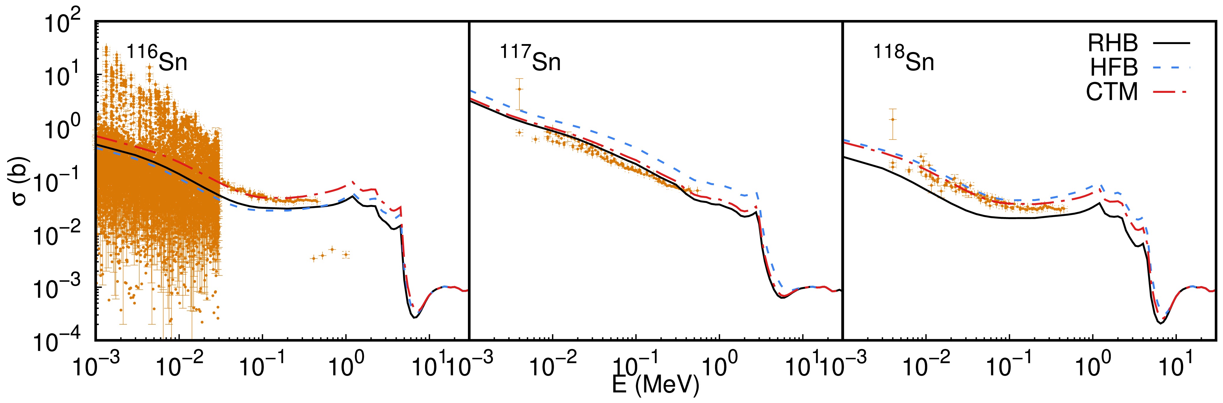 Abstract: Nuclear level density (NLD) plays a crucial role in describing the statistical properties of excited nuclei and is a key input for models of compound nuclear reactions, such as those used in nuclear astrophysics and reactor physics. In this work, we construct microscopic nuclear level densities for Sn isotopes by combining single-particle spectra, pairing correlations, and deformation parameters from relativistic Hartree–Bogoliubov (RHB) calculations with the combinatorial method. We examine the energy dependence and isotopic systematics of the calculated level densities. In particular, we analyze their variation with excitation energy and neutron number, and compare them to available experimental data, including cumulative low-lying levels and s-wave neutron resonance spacings ($ D_0 $). The resulting level densities are further employed as input to Hauser–Feshbach calculations of radiative neutron capture $ (n,\gamma) $ cross sections [