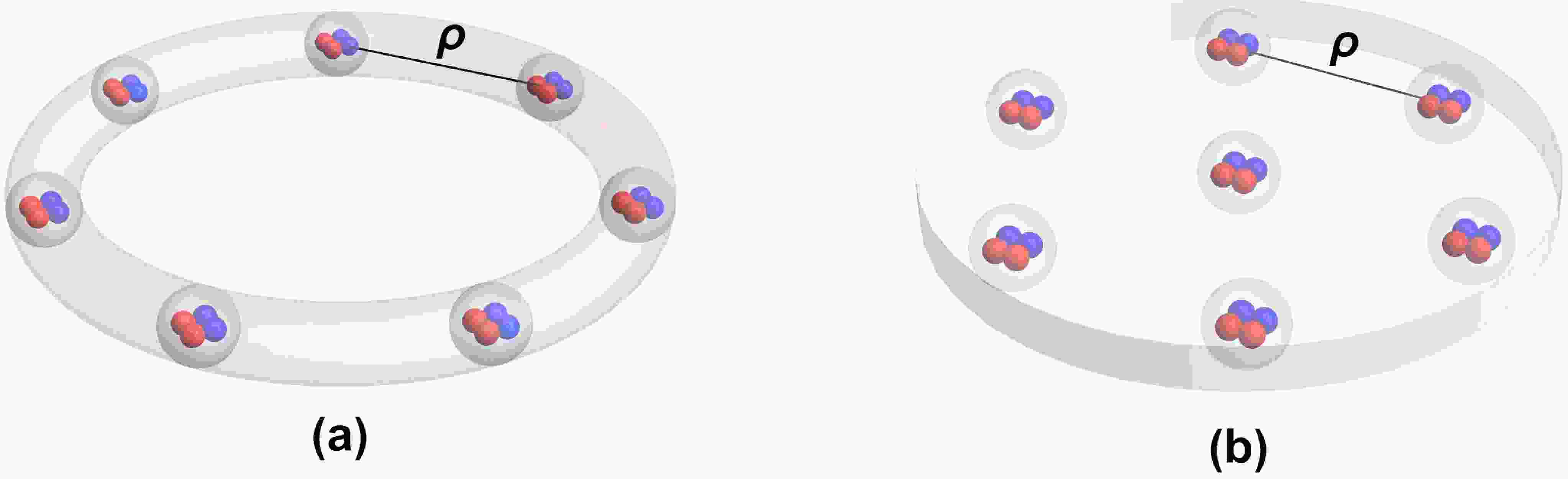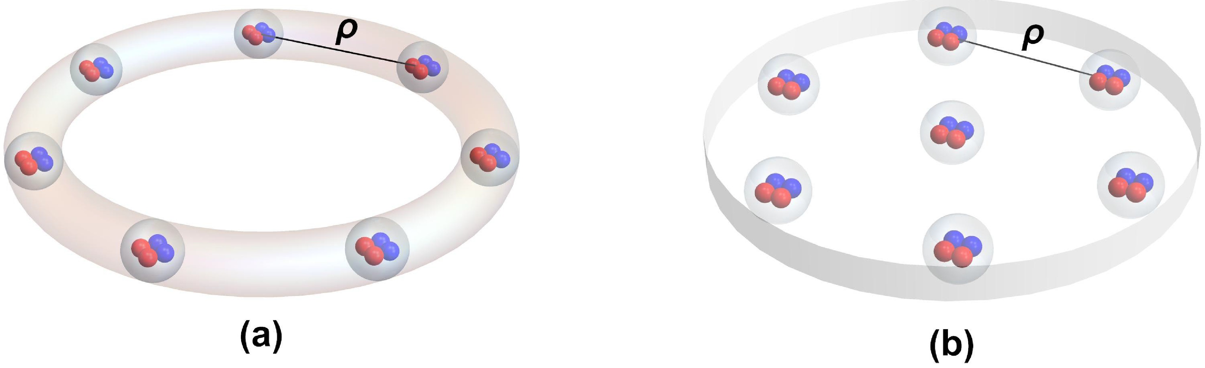 Figure 1. (color online) Geometric arrangements of the 7α clusters: (a) toroidal configuration; (b) disk-like configuration.