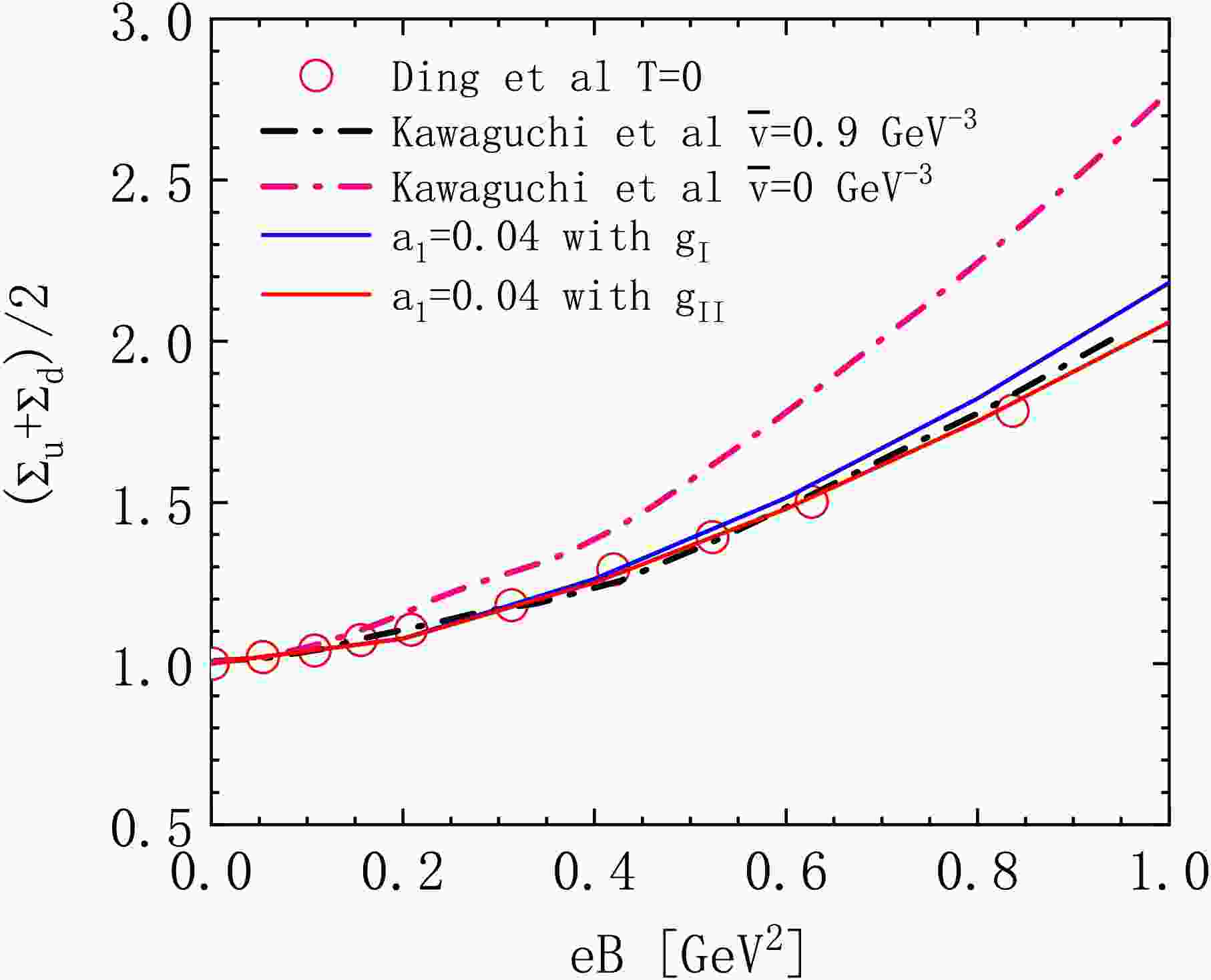 $\Lambda^{2}_{\rm QCD}$ =200 MeV$ ^2 $ ,$ g_{\rm{I}} $ is the coupling constant at$ eB=0 $ , and the free parameters$ D_{1} $ and$ D_{2} $ are fixed to obtain reasonable results for the lattice average$ (\Sigma_{u}+ \Sigma_{d})/2 $ [38]. This ansatz effectively incorporates the magnetic field dependence of the coupling while keeping the numerical computation tractable. We note that the consistency with the quark propagator treatment is ensured by the fact that the same coupling constant g enters both the gluon propagator and the quark-gluon vertex in the DSE, and the subtracted quark condensates are in good agreement with lattice QCD data. In our work [34], the subtracted quark condensate is given by$ \begin{aligned}[b] \frac{\left(\Sigma_{u}+\Sigma_{d}\right)}{2} =\;& 1-\frac{a_{1}}{eB}\frac{m_{L}}{m_{\pi}^{2}f_{\pi}^{2}} \Big\{\left[\langle \bar{u}u\rangle_{eB}-\langle \bar{u}u\rangle_{eB=0}\right]\\&+\left[\langle \bar{d}d\rangle_{eB}-\langle \bar{d}d\rangle_{eB=0}\right]\Big\}, \end{aligned} $