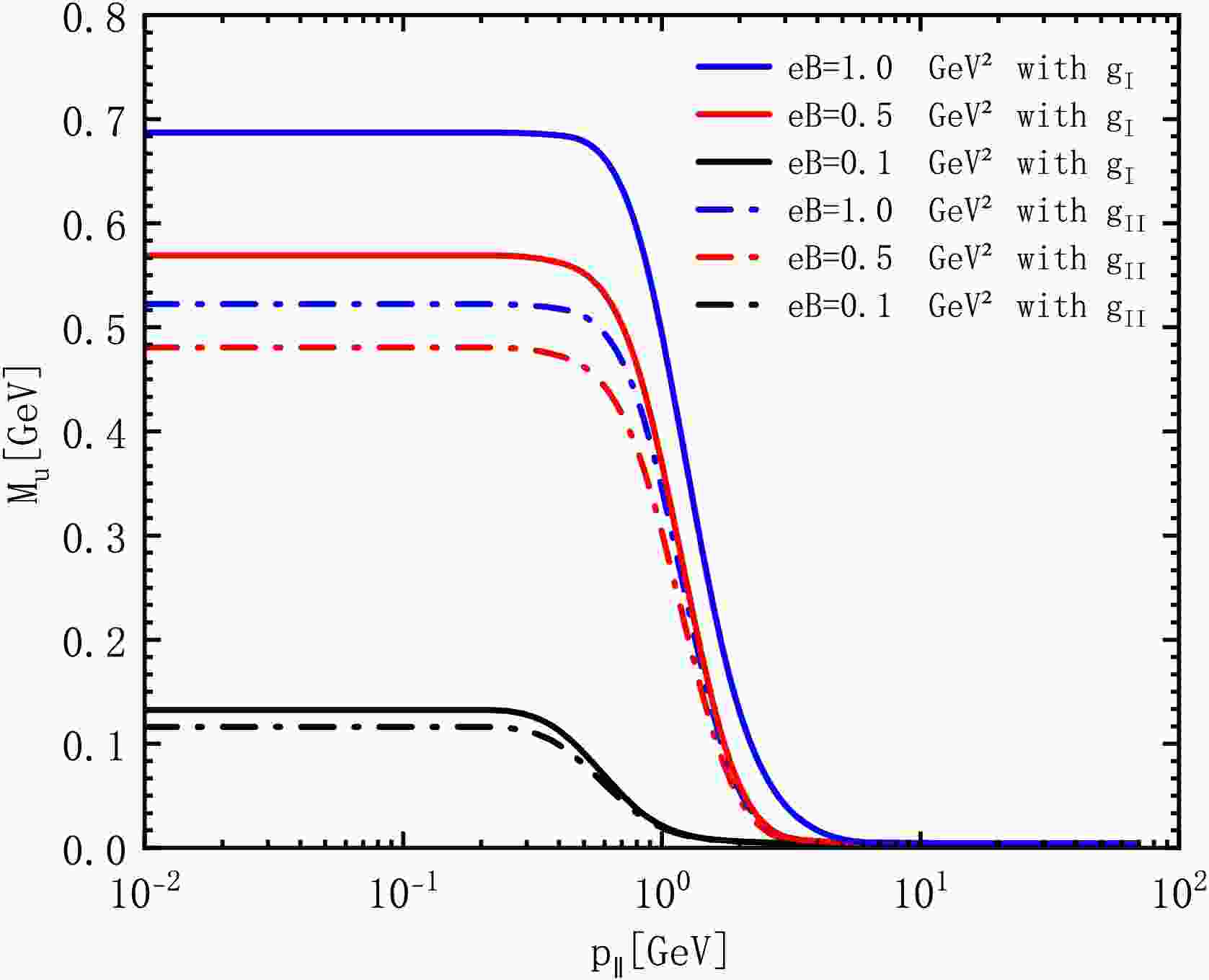 $g_{\rm{I}}$ and$g_{\rm{II}}$ : constituent quark mass$M_{u}$ as a function of the momentum$p_{\parallel}$ for$m_{u} = 6$ MeV at$eB = 0.1$ ,$0.5$ ,$1.0$ GeV2.To demonstrate the finite volume effect, we use the MRE formalism and then solve the DSEs in the presence of magnetic fields with the same parameters. Fig. 3(a) and (b) is a supplement to Fig. 2. We display the momentum and finite volume dependence of the constituent quark mass for
