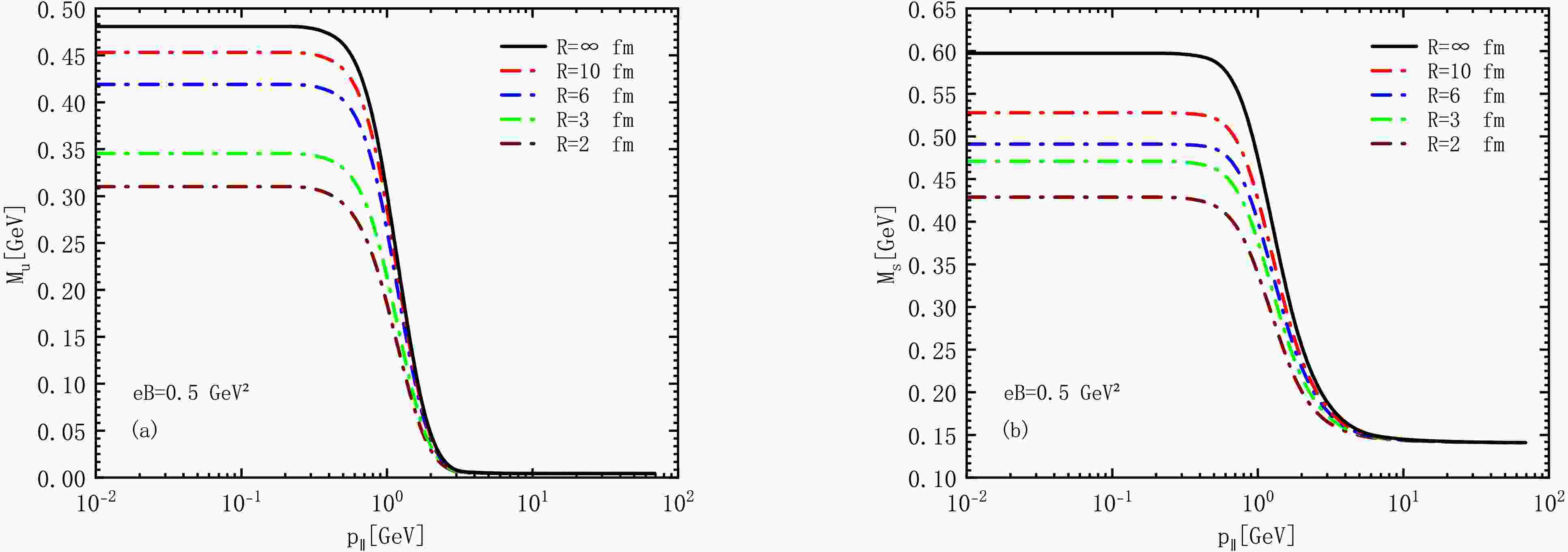 $M_{u}$ as a function of the momentum$p_{\parallel}$ for$m_{u} = 6$ MeV in (a) and for$m_{s} = 199$ MeV in (b) for different radii R.To examine the finite volume effects impacting the constituent quark mass, we calculate the partial derivative of M with respect to radius R,