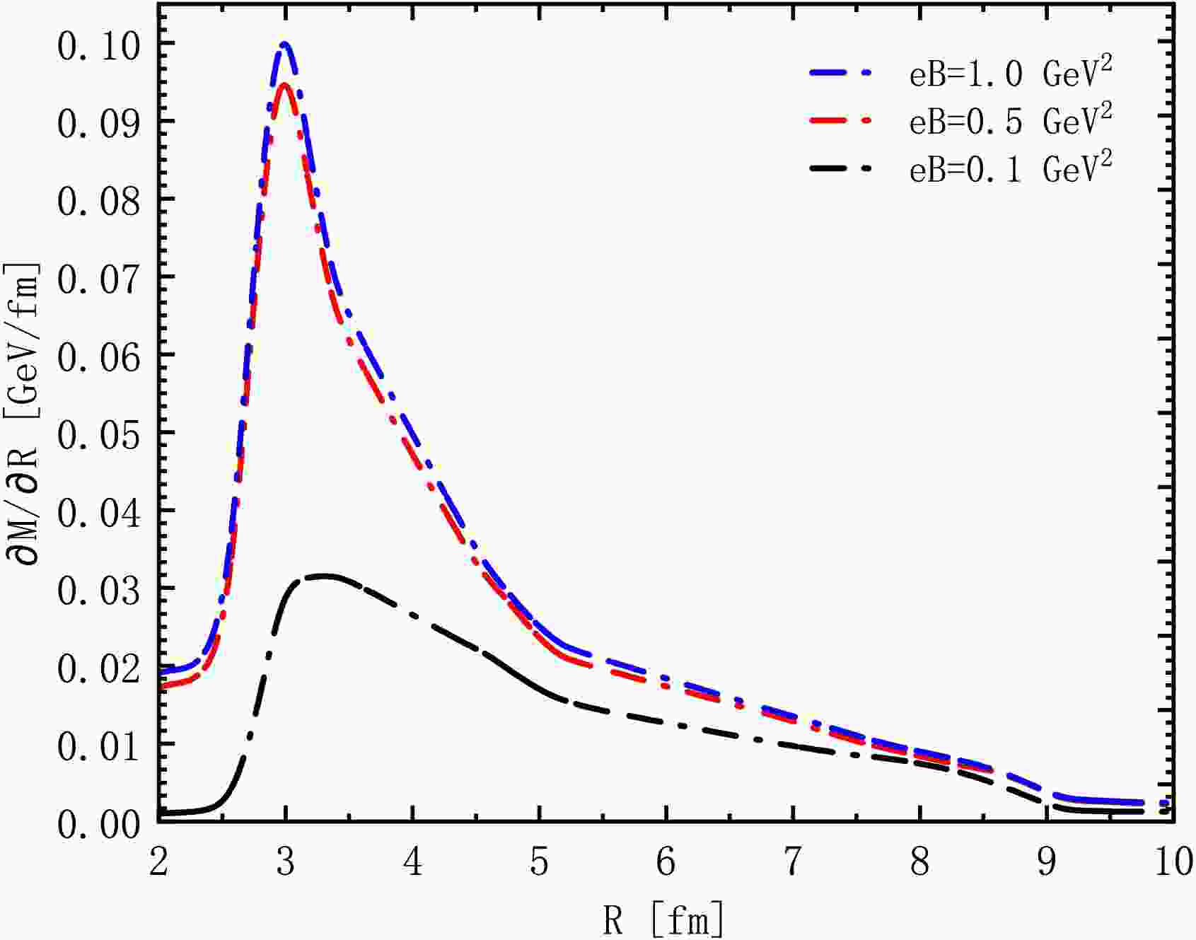 $ \partial M/\partial R $ , for$ m_{u} = 6 $ MeV at$ eB = 0.1,\; 0.5,\; 1.0\; {\rm{GeV}}^{2} $ , which shows how the range of radius affects M. From Fig. 4, we can see the constituent quark mass M varies with the radius R, and M varies more sharply at stronger magnetic fields. Once again, when$ R \gt 5 $ fm, the thermodynamic quantities of the system become invalid [19], leading to an almost zero gradient of mass outside the larger volume. The location of the protrusion in Fig. 4 indicates a sharp variation in the constituent quark mass M for most cases when the radius is confined within a narrow range, approximately between 2 and 6 fm. The narrow range can be increased by the magnetic field, meaning that the strong magnetic field can enhance the finite volume effect. -