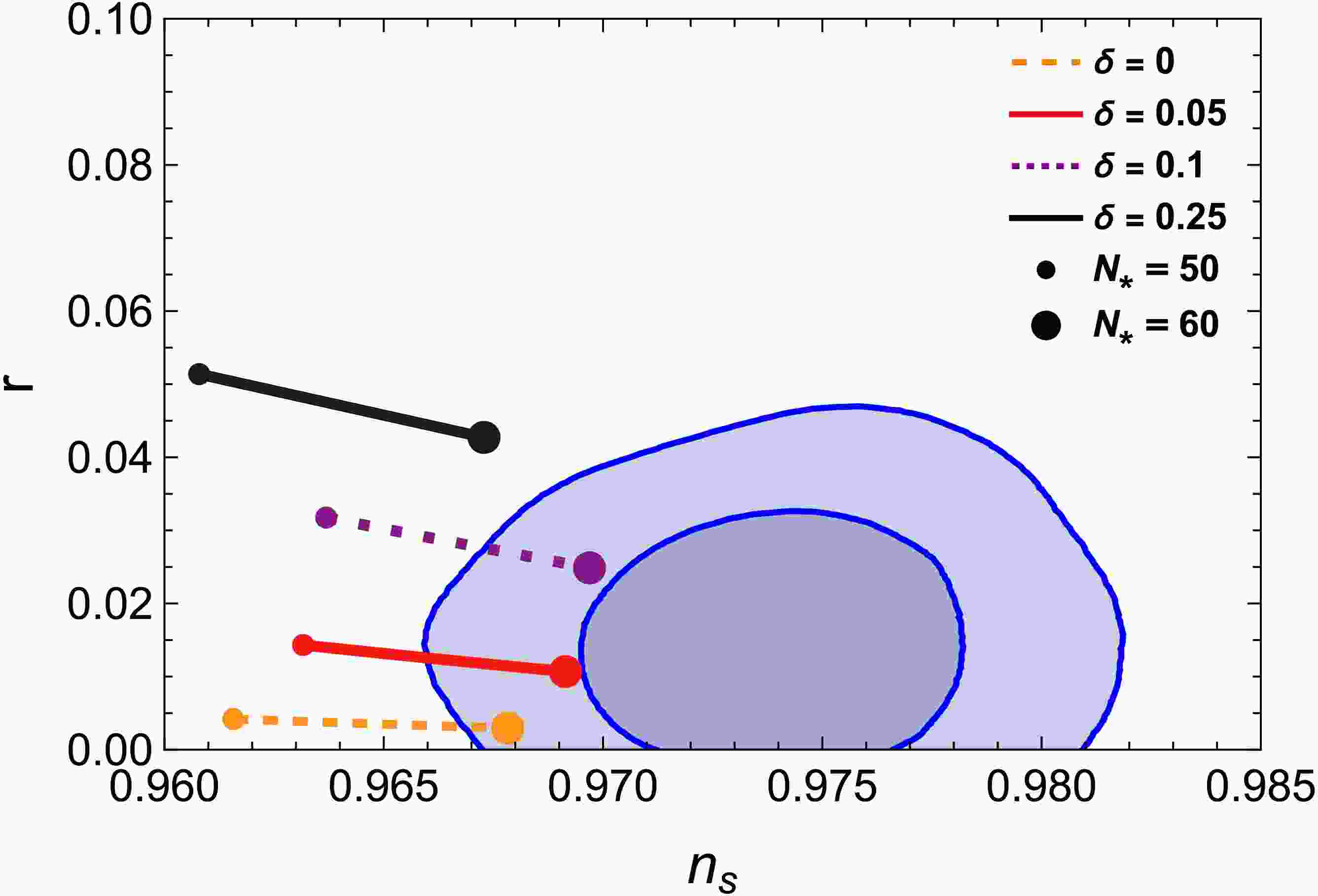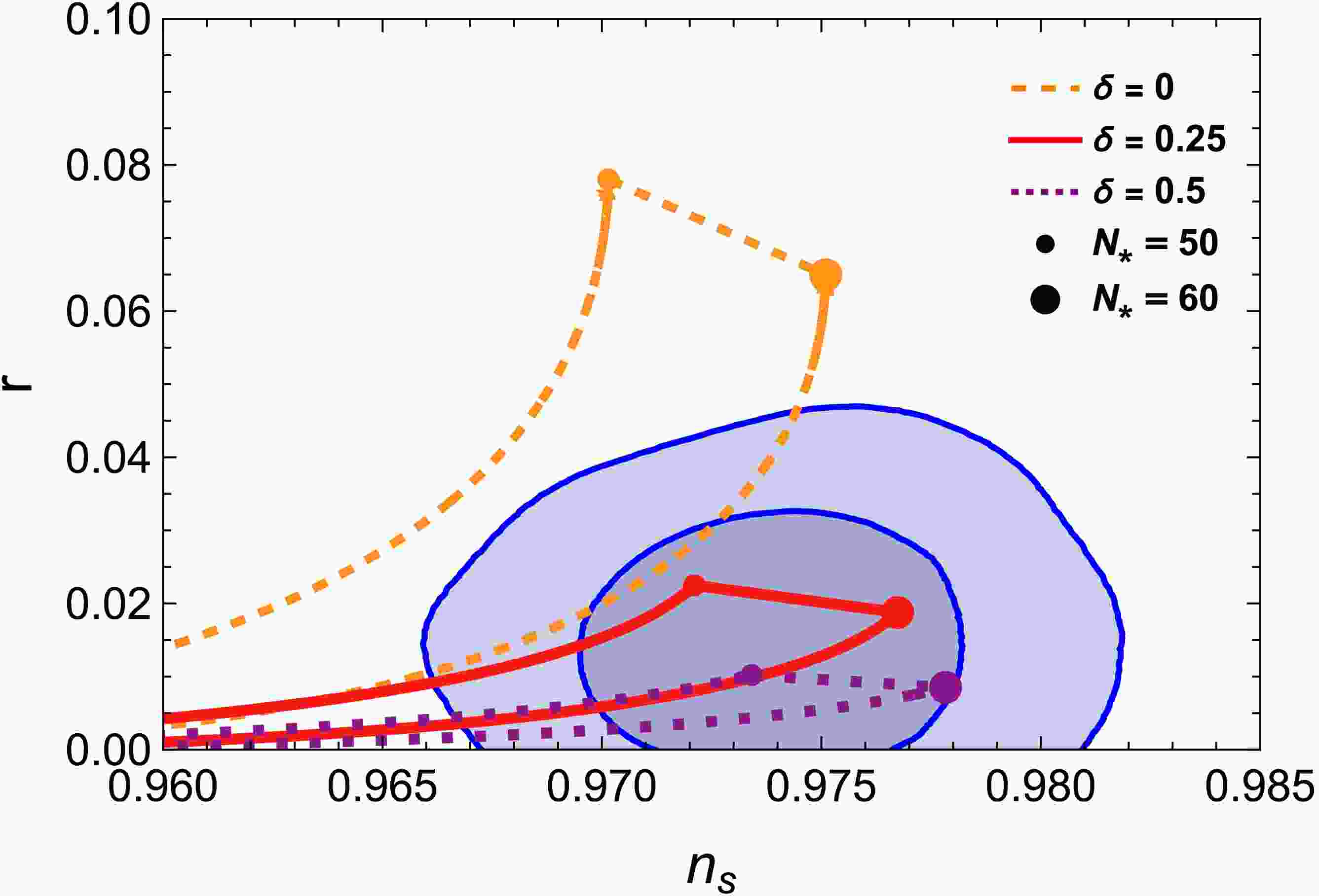 $ n_s $ and r as n and δ vary. Each curve corresponds to a variation in the number of e-folds$ N_* $ from$ 50 $ to$ 60 $ . The dark and light blue shaded regions represent the$ 1\sigma $ and$ 2\sigma $ confidence intervals from the combined P-ACT-LB-BK$ 18 $ data [9, 10]. -