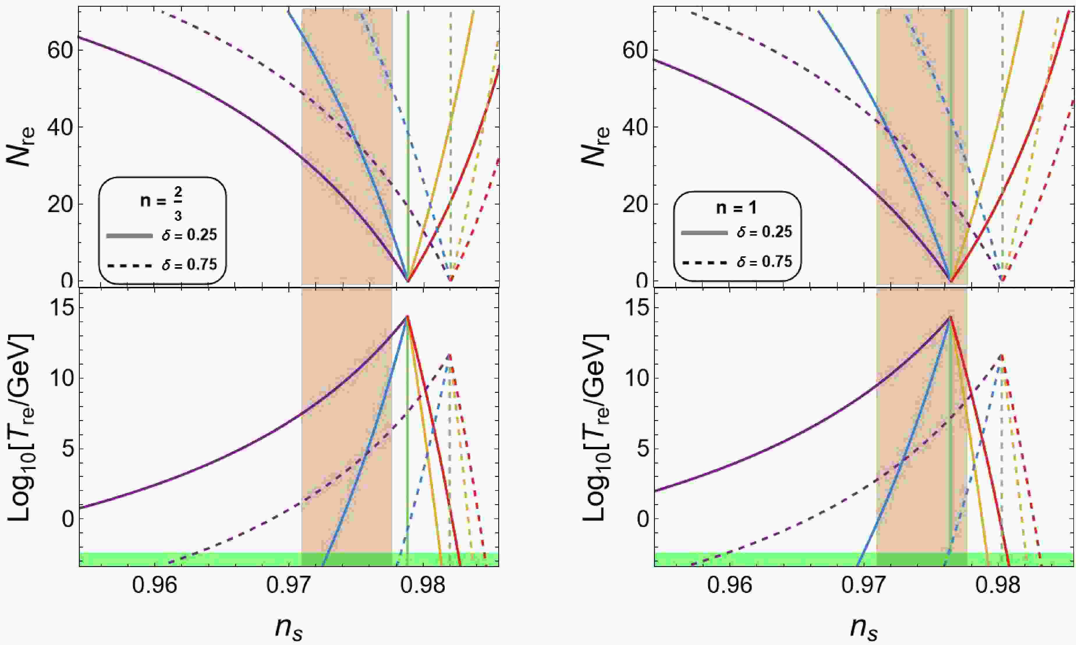 $ N_{{\rm{re}}} $ and the reheating temperature$ T_{{\rm{re}}} $ as functions of the spectral index$ n_s $ . For the$ n=2/3 $ potential, which is favored by the data: