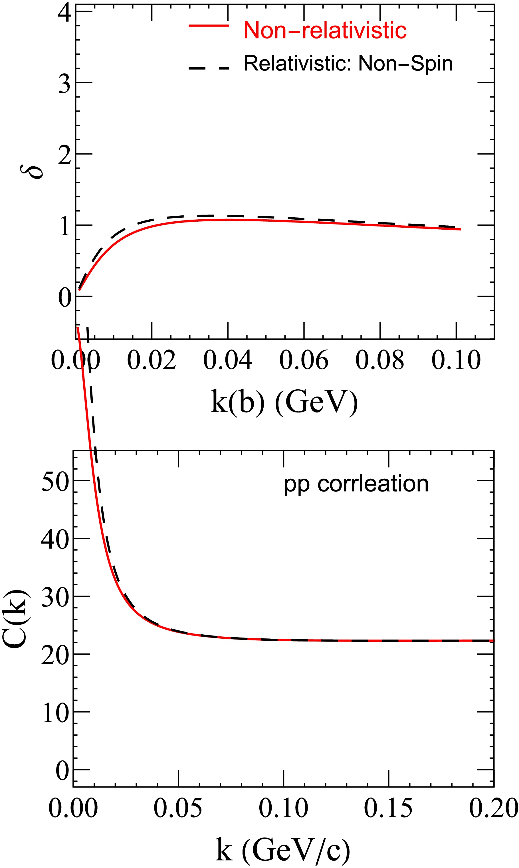 Figure 2.  (color online) (Top panel) Scattering phase as a function of k. (Bottom panel) The correlation function. The black dashed lines represent the non-relativistic case, while the red solid lines correspond to the relativistic case without spin-dependent potentials.