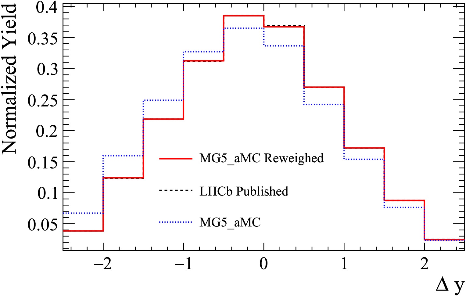 $ pp \to b\bar{b}+X $ and$ pp \to c\bar{c}+X $ are generated independently. The DPS$ BD $ sample is obtained by randomly pairing events from the single-$ B^\mp $ and single-$ D^\pm $ samples. In the DPS approximation, the kinematic properties of the B and D mesons are largely governed by their respective single-particle distributions. However, the single-particle rapidity spectra predicted by$ {\mathtt{MG5\_aMC}} $ may differ from those observed in data. To reduce this model dependence, the DPS sample is reweighted on an event-by-event basis according to the rapidity difference$ \Delta y = y_B - y_D $ , using a reference$ \Delta y $ distribution constructed from the LHCb Run 2 measurements of the B- and D-meson single-particle$ d\sigma/dy $ spectra [24, 25], as illustrated in Fig. 1.