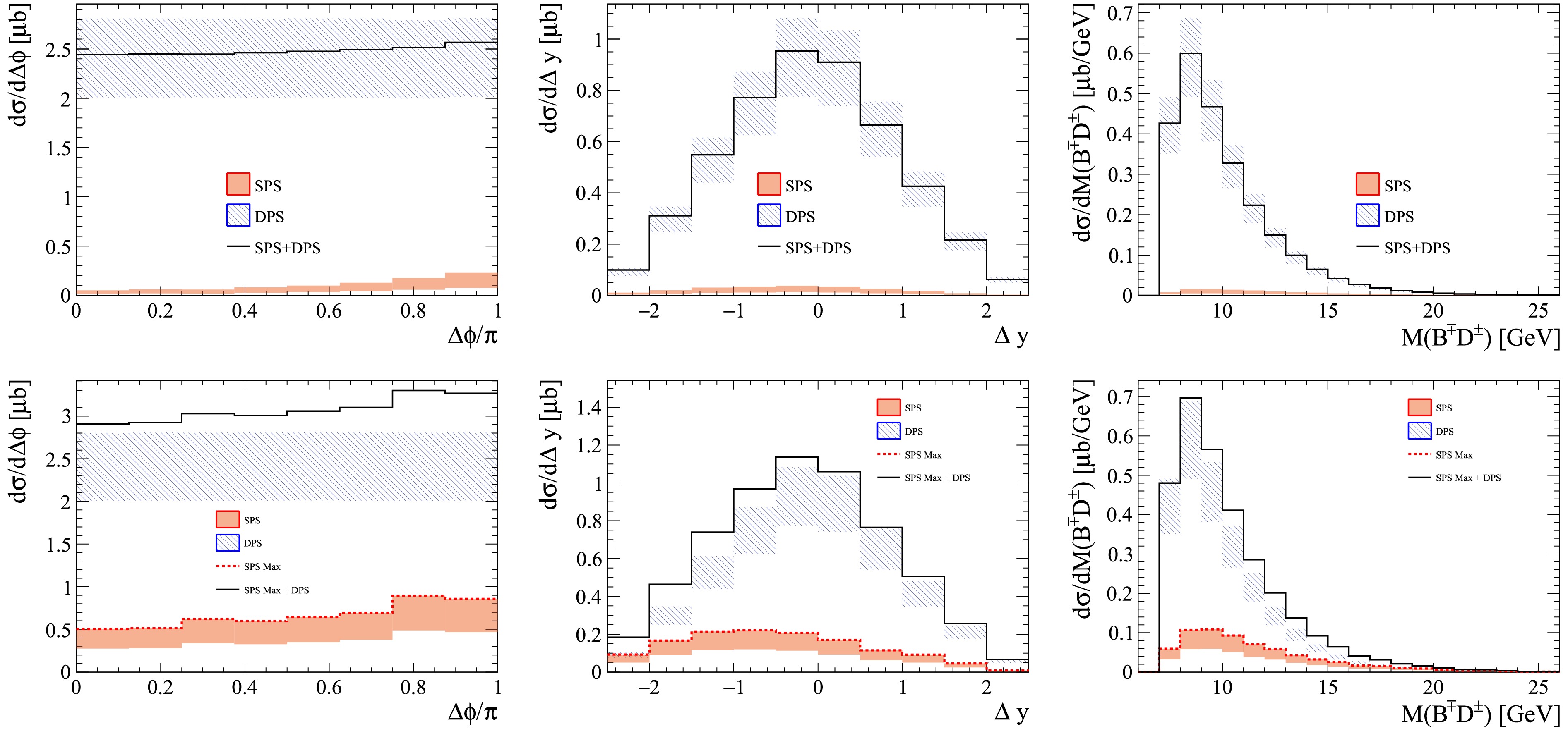 $ B^\mp D^\pm $ production via SPS, DPS, and their combination (SPS+DPS) are shown in Fig. \ref{fig:sps_dps_eff15}. The upper panels correspond to the NLO SPS prediction in the 3FNS, while the lower panels show the LO SPS prediction in the 4FNS. The shaded bands denote the combined statistical and systematic uncertainties. For both SPS and DPS, statistical uncertainties are estimated from the event samples. The DPS systematic uncertainty originates from the uncertainties on$ \sigma_{B^\mp} $ and$ \sigma_{D^\pm} $ , whereas the SPS systematic uncertainty is dominated by variations of the renormalization and factorization scales in the perturbative calculations.In the SPS mechanism, the azimuthal angle difference distribution,