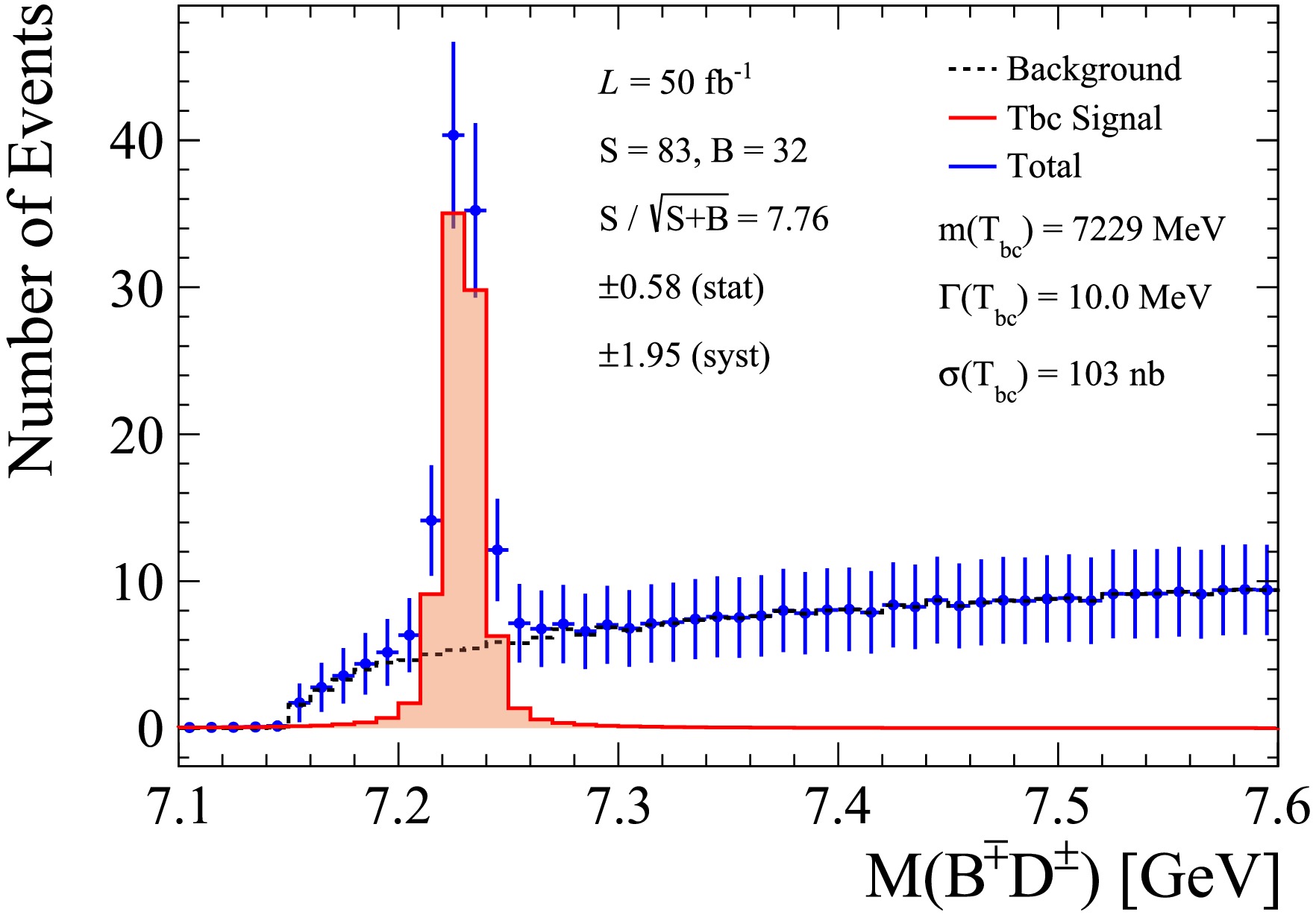 $ T_{bc} $ signal and background in the$ BD $ invariant-mass spectrum, assuming an effective DPS cross section$ \sigma_{{\rm{eff}}} = 15\; {\rm{mb}} $ ,$ m(T_{bc}) = 7229\; {\rm{MeV}} $ , and$ \Gamma(T_{bc}) = 10\; {\rm{MeV}} $ . The black curve represents the$ B^\mp D^\pm $ background, the red curve the$ T_{bc} $ signal, and the blue curve their sum. -