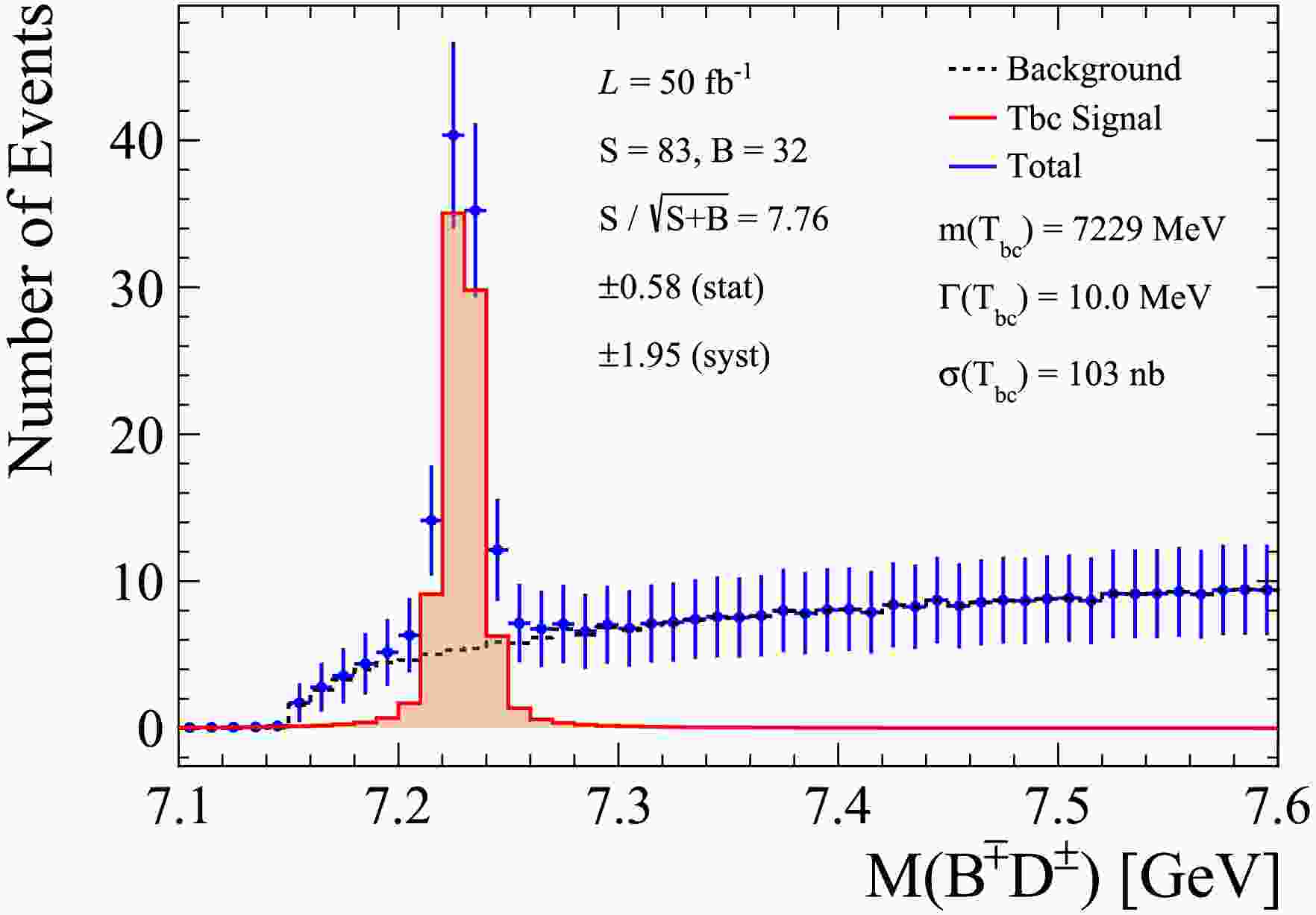 $ \sigma=\sigma(T_{bc}) $ , whereas for the background it is the sum of the SPS and DPS contributions:$ \sigma = \sigma_{B^\mp D^\pm}^{{\rm{DPS}}} + \sigma_{B^\mp D^\pm}^{{\rm{SPS}}} $ . In this study, we neglect the dependence of σ on the$ pp $ center-of-mass energy between 13 TeV and 14 TeV.●