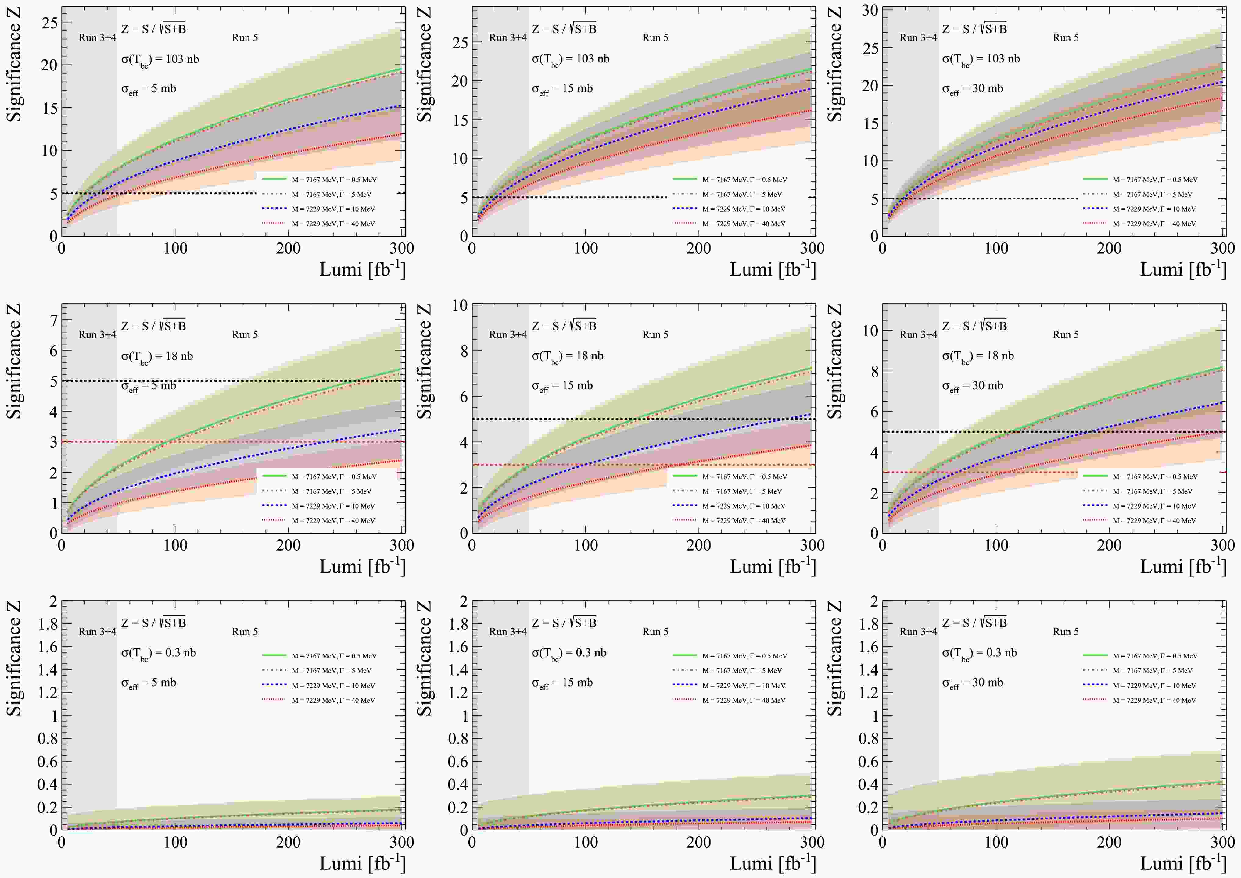 $ \sigma(T_{bc})=103\; {\rm{nb}} $ (top panels), Fig. 5 and Table 1 show the minimum integrated luminosity required for a$ 5\sigma $ discovery. For most parameter sets, this is achievable with$ 50\; {\rm{fb}}^{-1} $ (Run 2 + Run 3 + Run 4). A comparison between baseline and conservative background scenarios indicates that this requirement is robust against SPS modeling uncertainties. For the intermediate estimate of$ \sigma(T_{bc})=18\; {\rm{nb}} $ , the discovery potential is reduced relative to the optimistic case. Table 2 shows the minimum integrated luminosity required for$ 3\sigma $ evidence and$ 5\sigma $ discovery. At$ 300\; {\rm{fb}}^{-1} $ , corresponding to the full LHCb dataset up to Run 5, the significance exceeds$ 3\sigma $ for most parameter sets, and only the most favorable scenarios reach$ 5\sigma $ . In the most pessimistic scenario with$ \sigma(T_{bc}) = 0.3\; {\rm{nb}} $ , the statistical significance remains well below$ 3\sigma $ for all parameter sets considered, even with$ 300\; {\rm{fb}}^{-1} $ . Under this pessimistic assumption, no significant signal is expected.