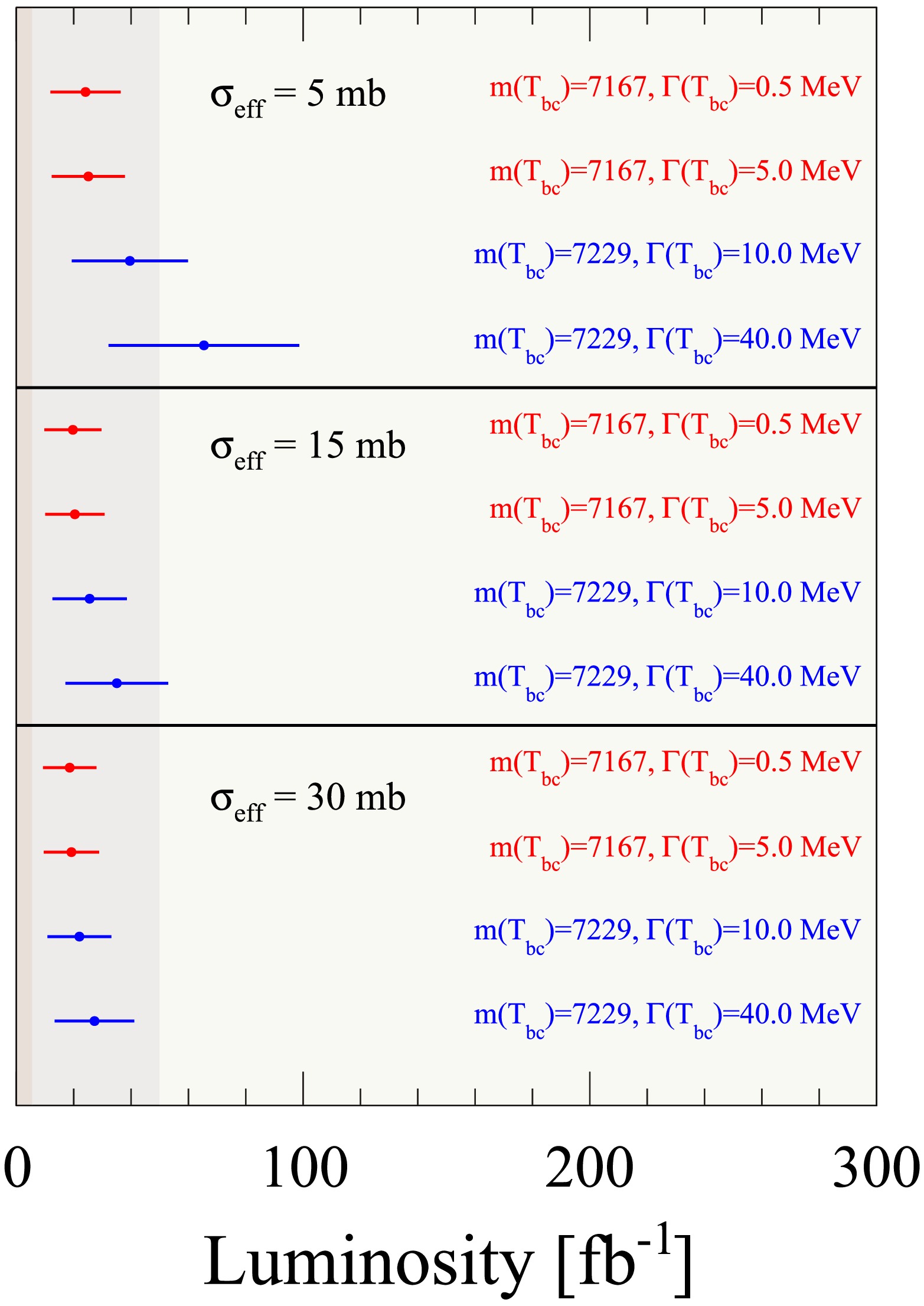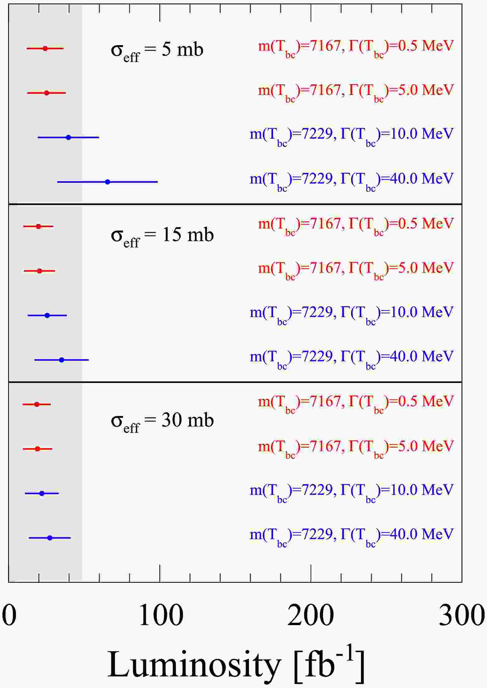 $ T_{bc} $ as a function of integrated luminosity for different$ T_{bc} $ mass and width parameters, assuming the baseline background scenario with$ \sigma(T_{bc}) = 103\; {\rm{nb}} $ and$ {\cal{B}}(T_{bc}\to B^-D^+)=0.5 $ .DPS $ \sigma_{{\rm{eff}}} $ [mb]m( $ T_{bc} $ ), Γ($ T_{bc} $ ) [MeV]$ {\cal{L}}_{{\rm{int}}} $ [$ {\rm{fb}}^{-1} $ ] (NLO SPS 3FNS)$ {\cal{L}}_{{\rm{int}}} $ [$ {\rm{fb}}^{-1} $ ] (LO SPS 4FNS, max)5 7167, 0.5 24 ± 12 25 ± 13 7167, 5.0 25 ± 13 26 ± 13 7229, 10 40 ± 20 40 ± 21 7229, 40 66 ± 33 68 ± 34 15 7167, 0.5 20 ± 10 20 ± 10 7167, 5.0 21 ± 10 21 ± 10 7229, 10 26 ± 13 26 ± 13 7229, 40 35 ± 18 37 ± 19 30 7167, 0.5 19 ± 9 19 ± 10 7167, 5.0 19 ± 10 20 ± 10 7229, 10 22 ± 11 23 ± 11 7229, 40 27 ± 14 29 ± 15 Table 1. The integrated luminosity required for a