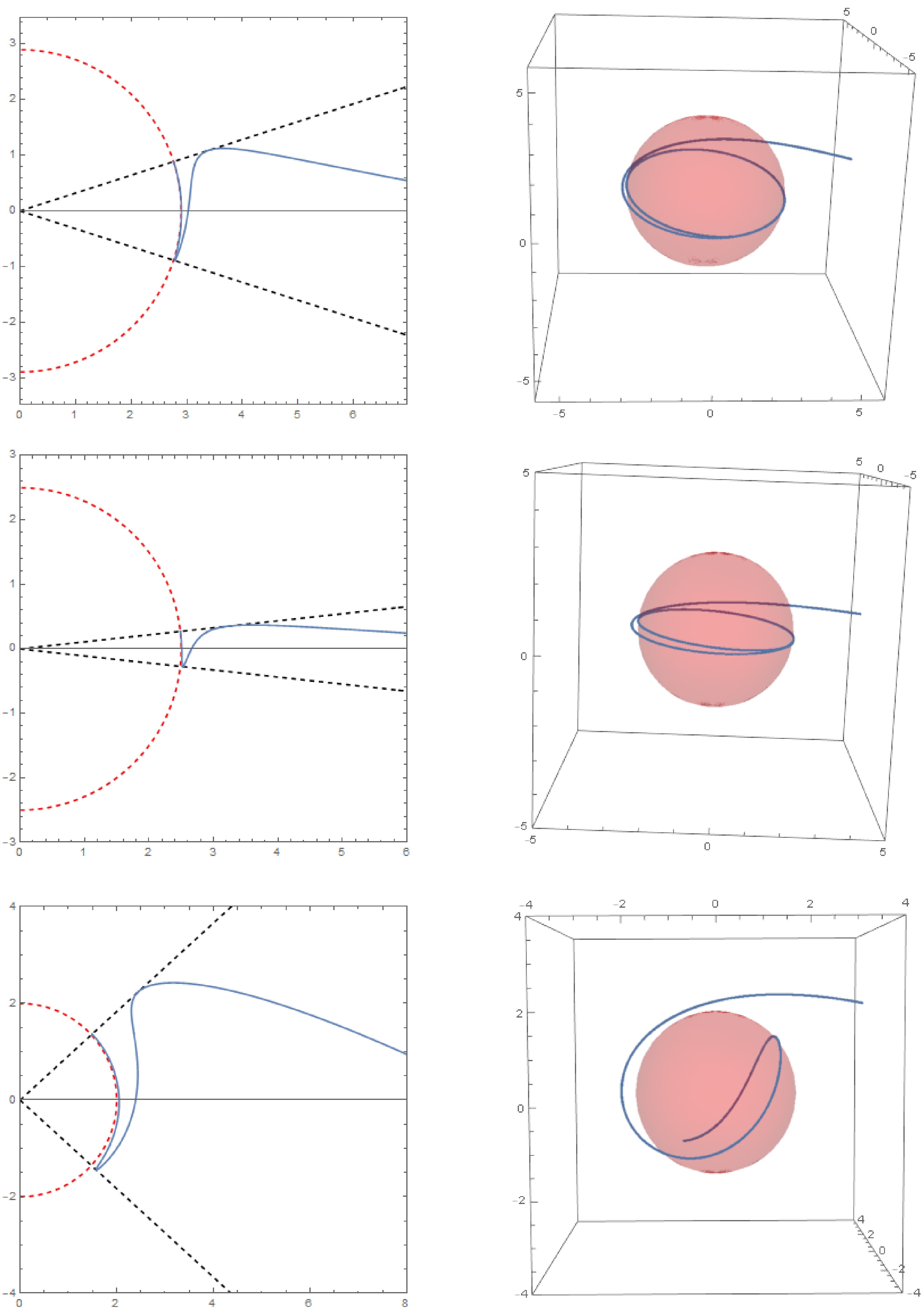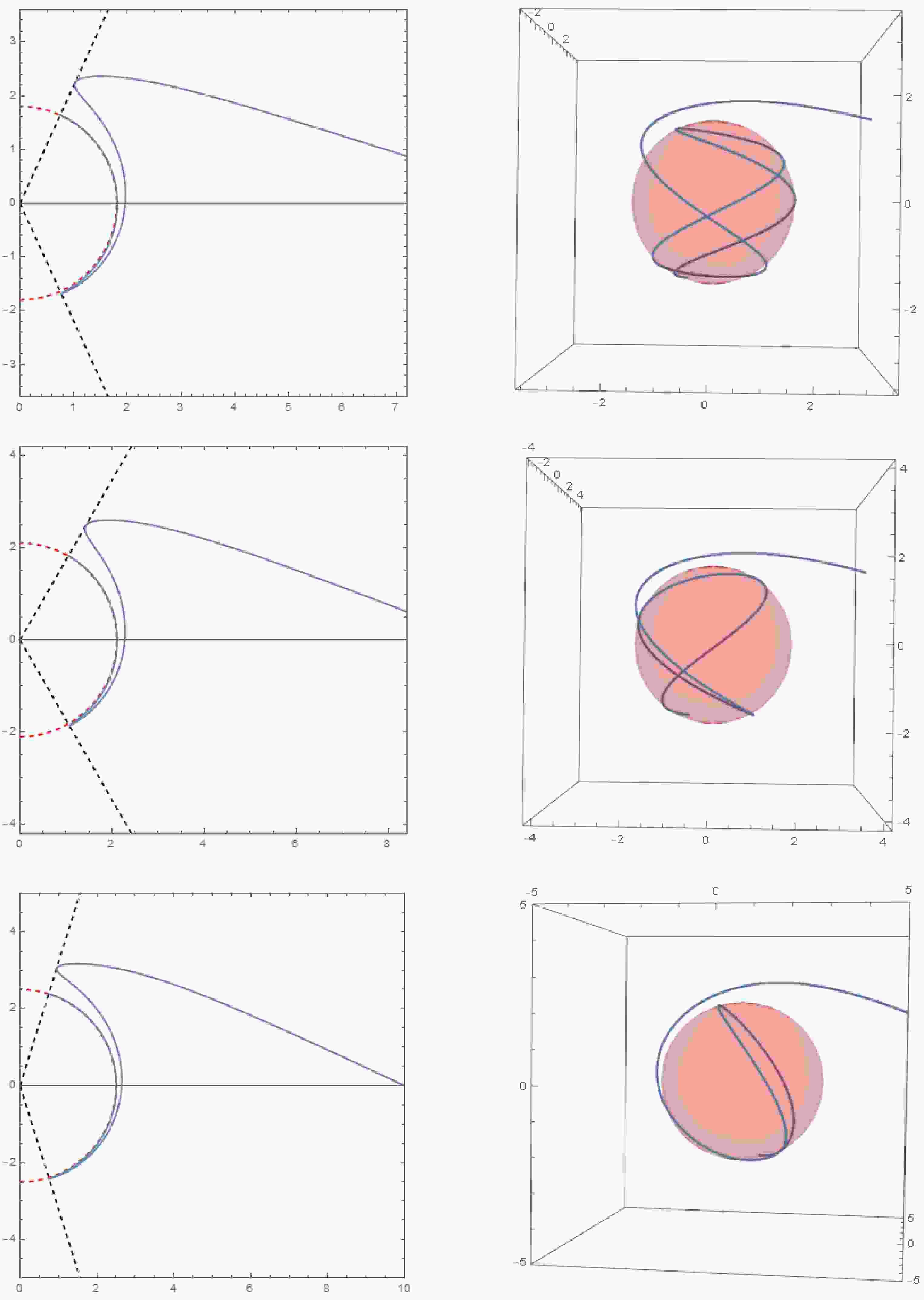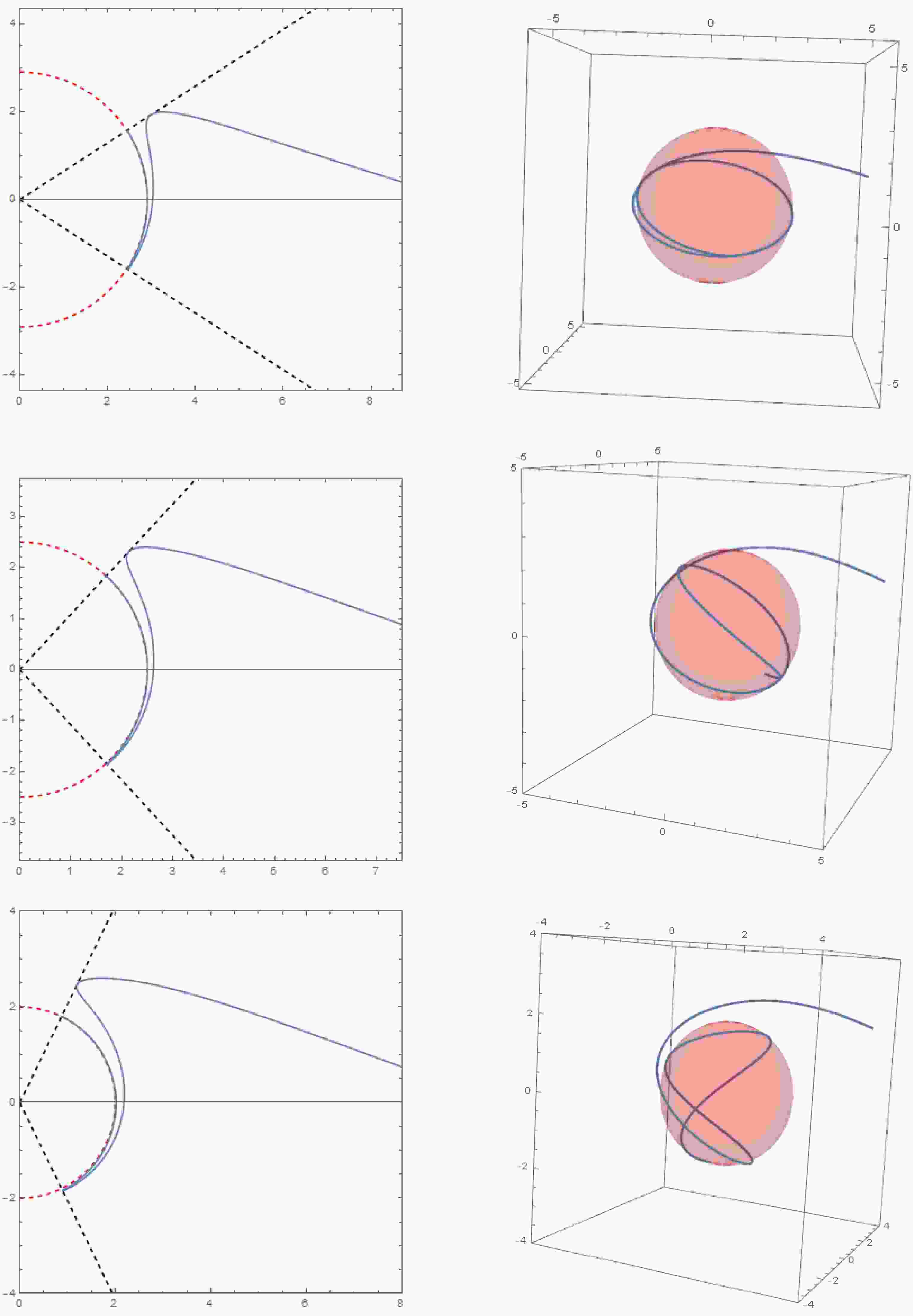 $ (r,\theta) $ plane, while the right diagram shows the corresponding trajectory in three-dimensional space. The initial conditions are$ r_{i} = 10,\mu_{i} = 0,\varphi_i = 0 $ . The parameter sets for each row of images (from top to bottom) are$ a = 0.8, r_c = 1.8, Q = 0.5, \tilde{e} = 1.1, \chi = 1.1; a = 0.8, r_c = 2.1, Q = 0.3, \tilde{e} = 1.3, \chi = 1.3; a = 0.4, r_c = 2.5, Q = 0.6, \tilde{e} = 1.5, \chi = 1.5 $ . -