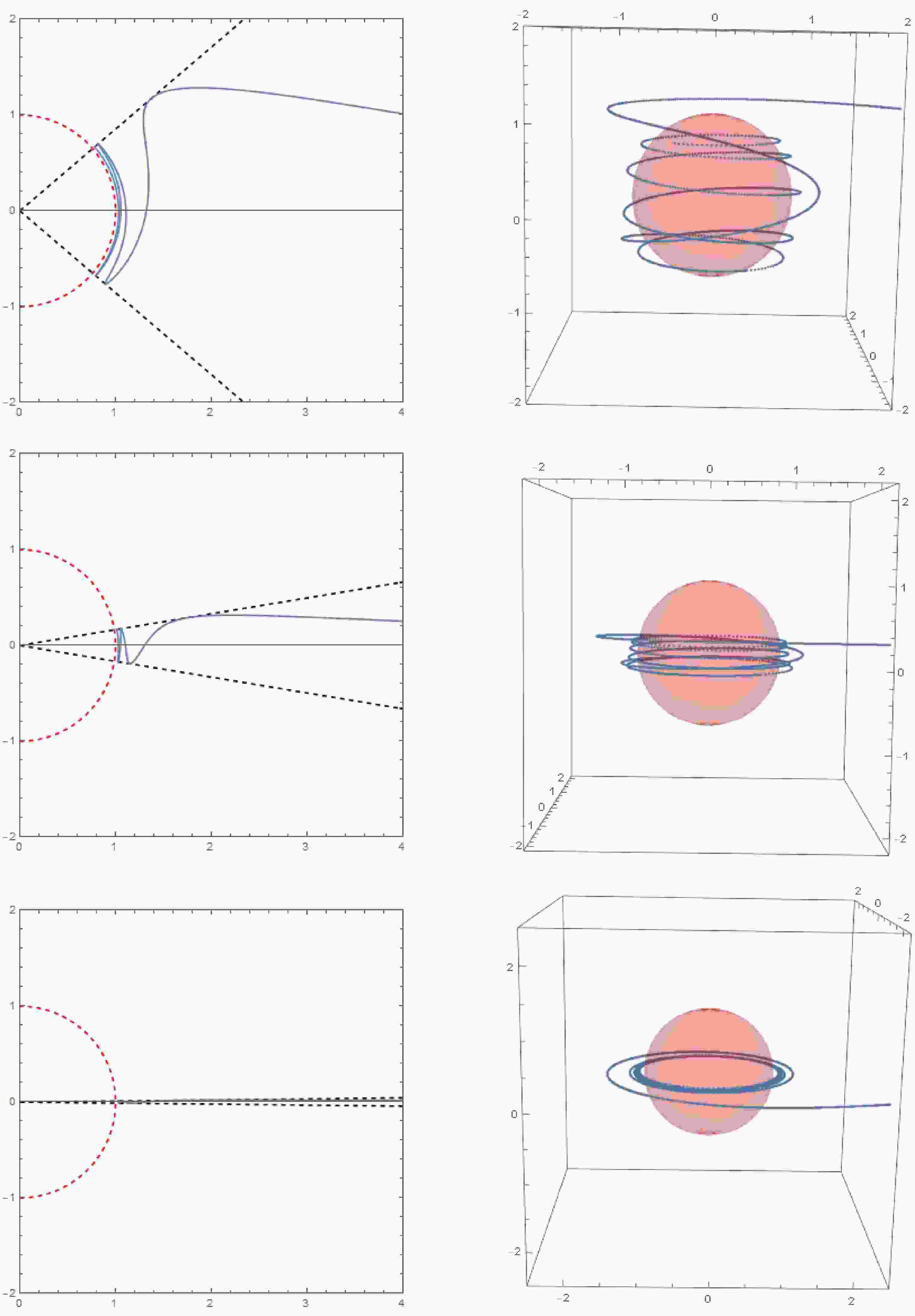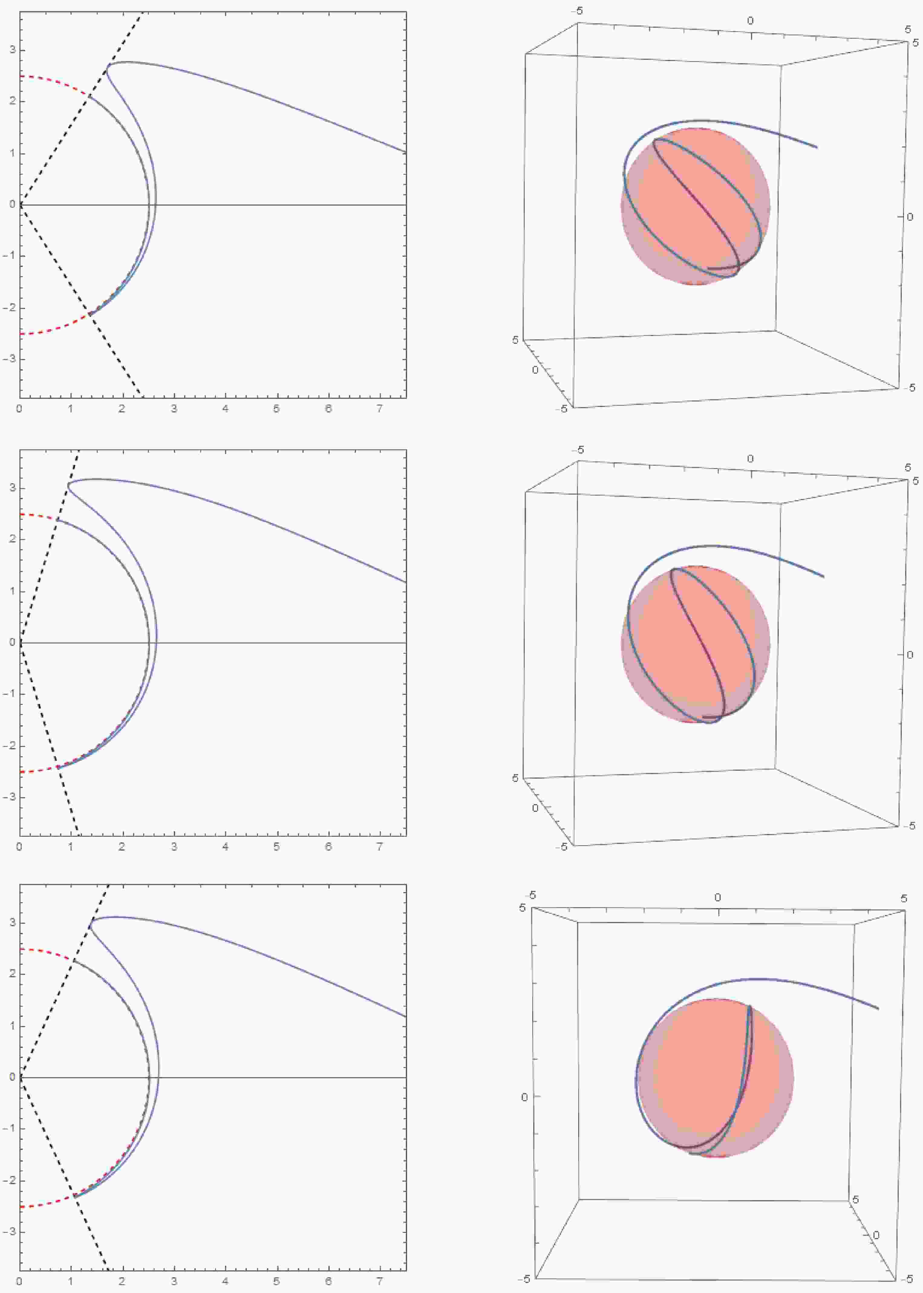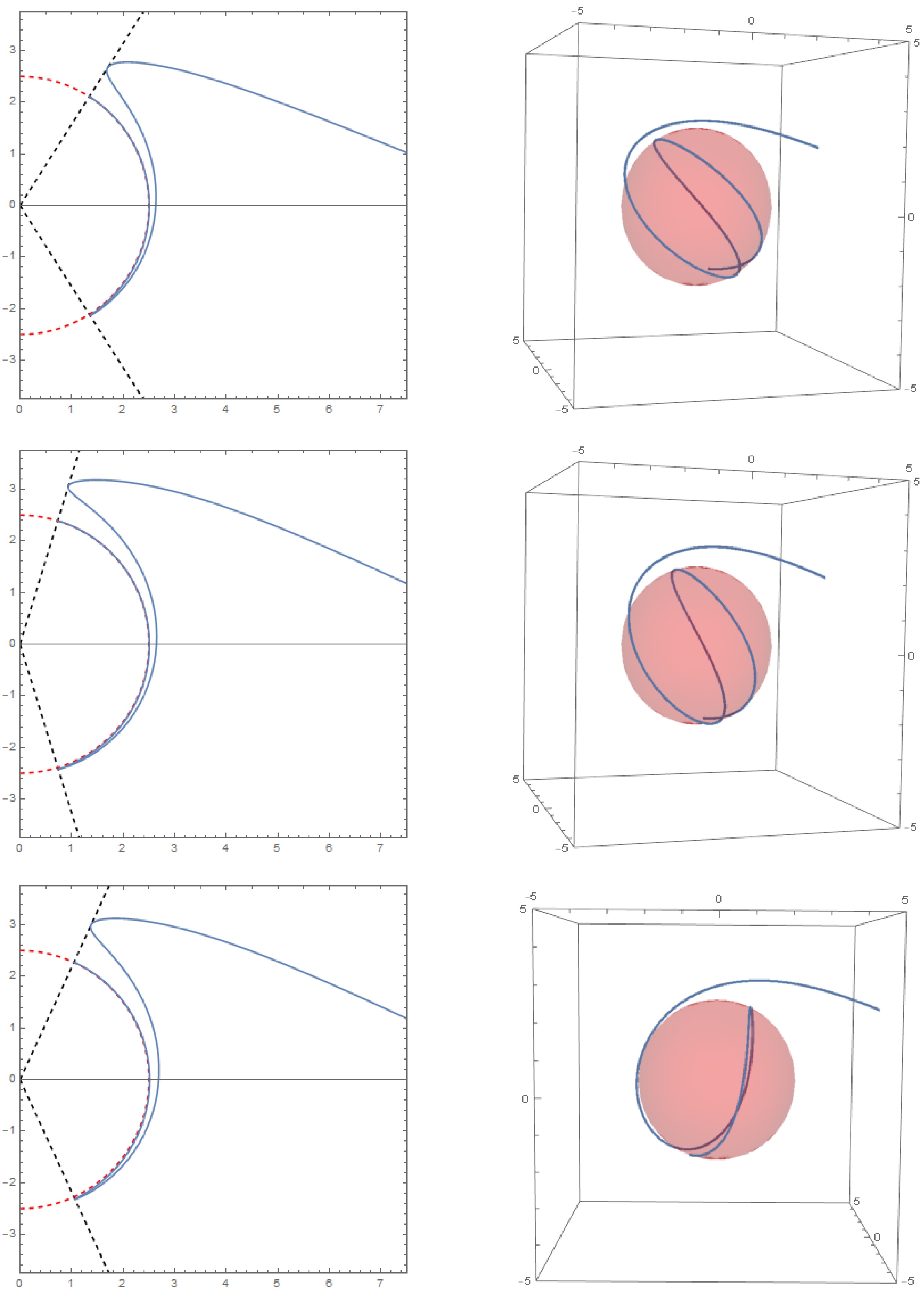 $ (r,\theta) $ plane, while the right diagram shows the corresponding trajectory in three-dimensional space. The initial conditions are$ r_{i} = 10,\mu_{i} = 0,\varphi_i = 0 $ . The parameter sets for each row of images (from top to bottom) are$ a = 0.8, r_c = 1.8, Q = 0.5, \tilde{e} = 1.1, \chi = 1.1; a = 0.8, r_c = 2.1, Q = 0.3, \tilde{e} = 1.3, \chi = 1.3; a = 0.4, r_c = 2.5, Q = 0.6, \tilde{e} = 1.5, \chi = 1.5 $ . -