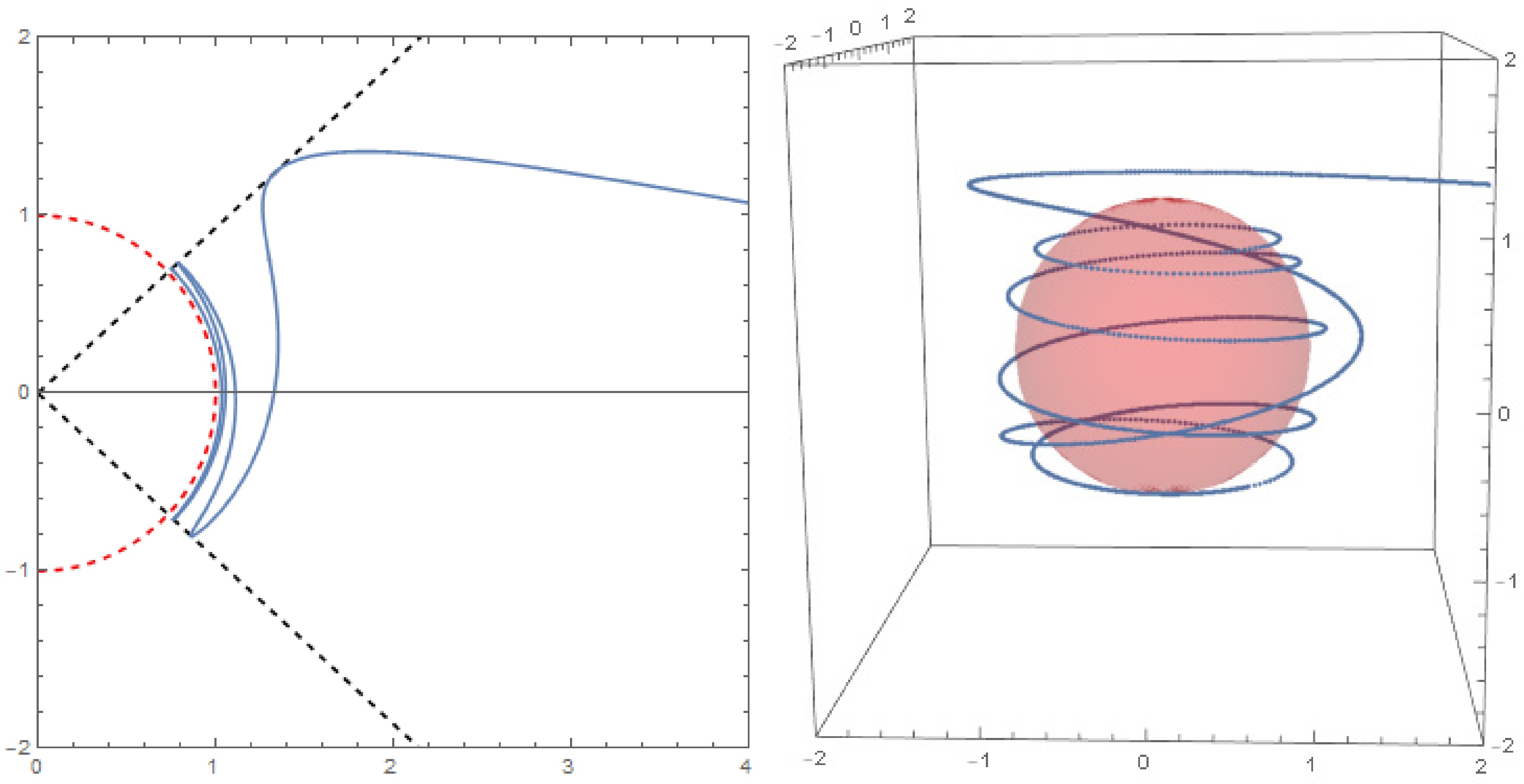 Figure 8. Critical timelike geodesics in Kerr spacetime. The left diagram illustrates the trajectory of a timelike geodesic in the