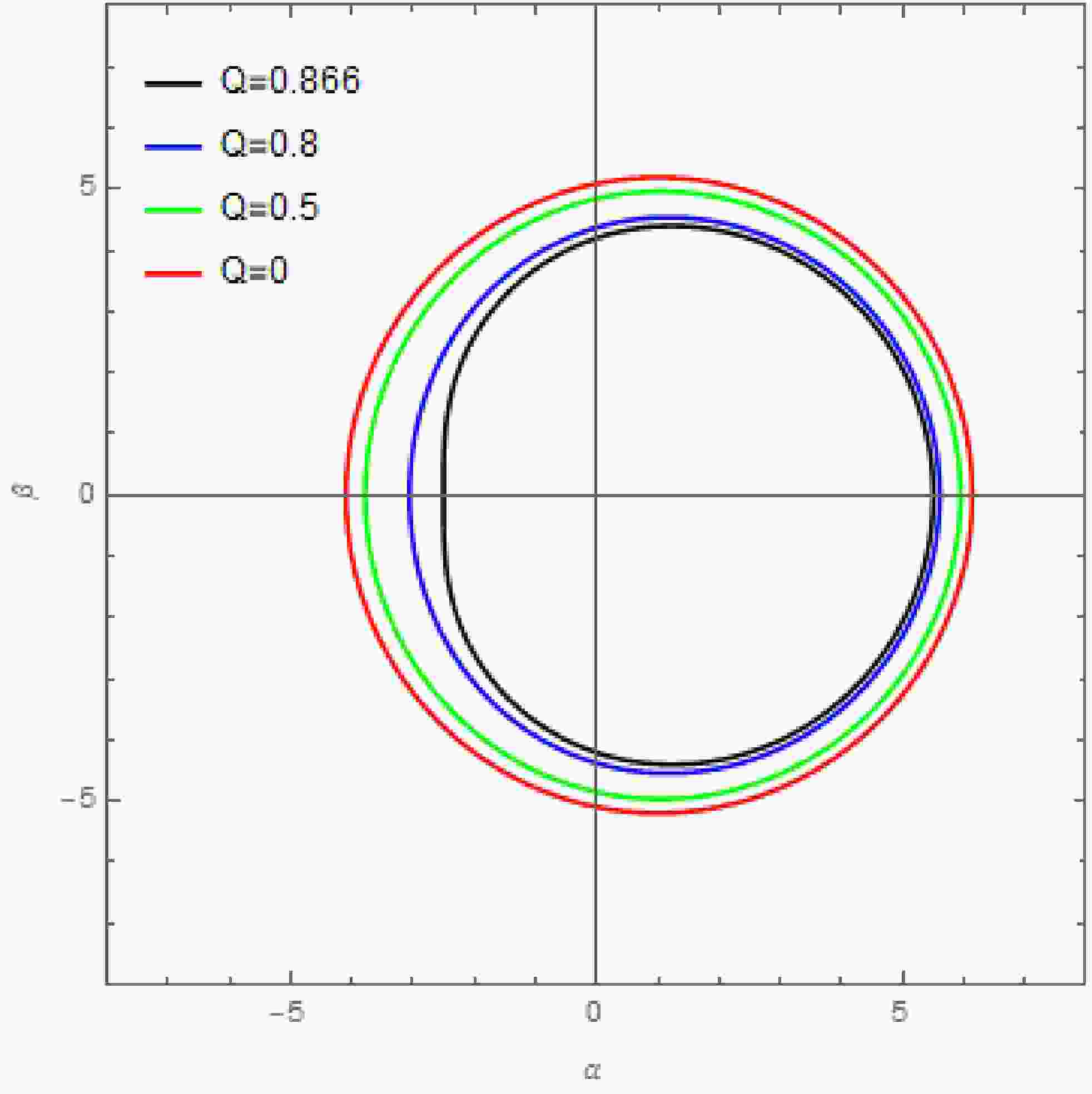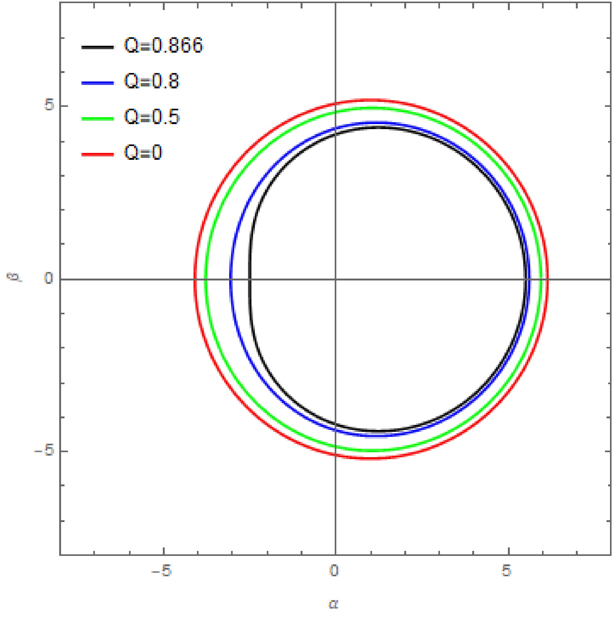 (126) As in the previous section, we compute the black hole shadow as seen by an observer in the equatorial plane. Figure 9 illustrates how the new parameter Q affects the black hole shadow.