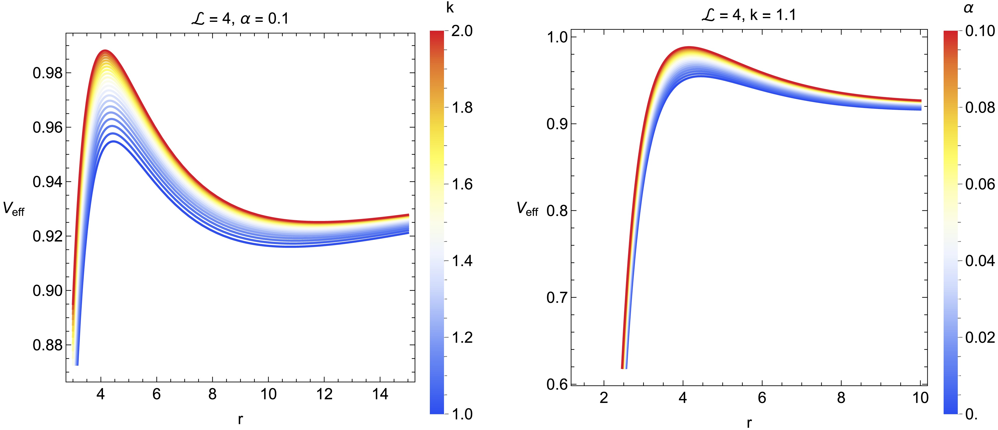 $ \epsilon=1 $ corresponds to time-like particles and$ \epsilon=0 $ to light-like particles. Here, the dot indicates differentiation with respect to τ. Finally, using the normalization condition$ p^\alpha p_\alpha=-1 $ , the effective potential takes the form$ V_{{\rm{eff}}}(r,\theta) = \left(1+\frac{{\cal{L}}^{2}}{r^{2}}\csc^{2}\theta\right) \left(1-\frac{2}{r}-\frac{\alpha}{r^{k}}\right). $
