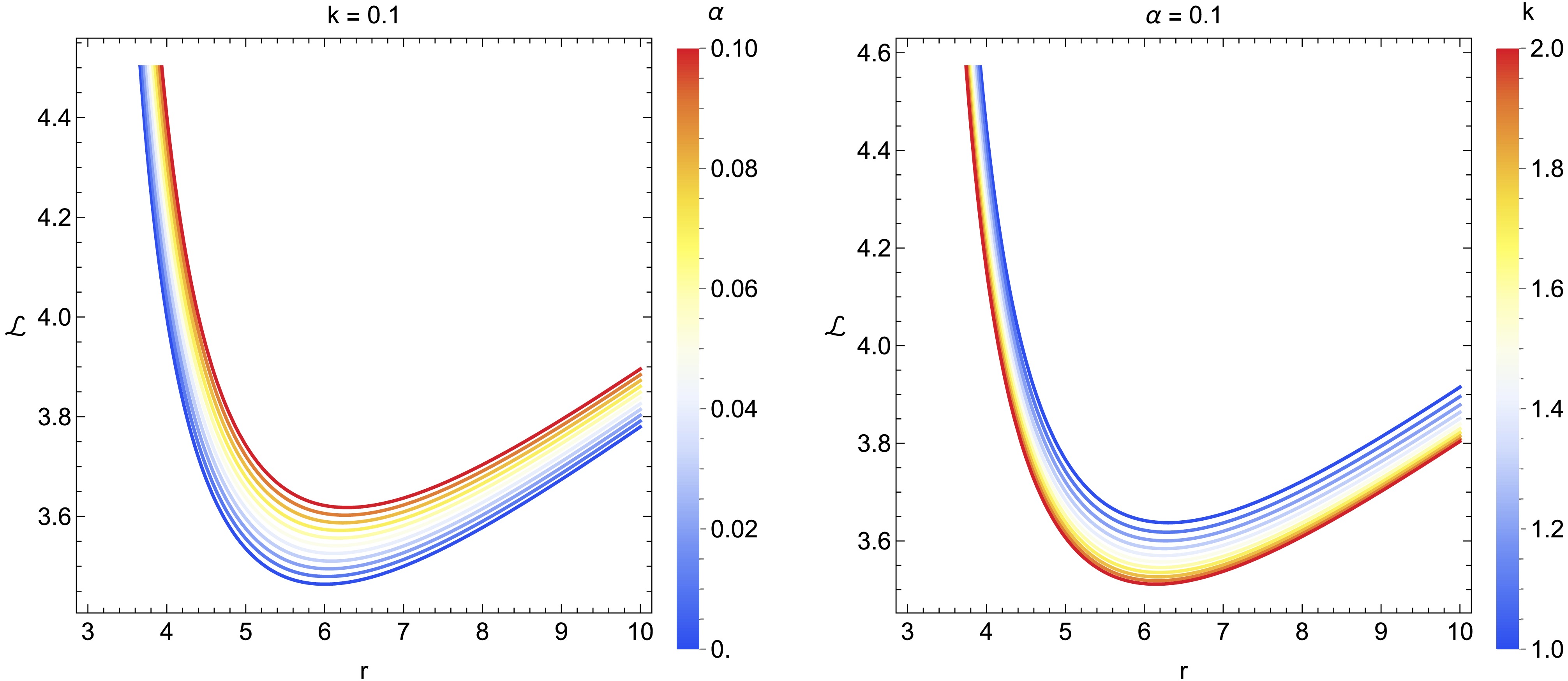 $ {\cal{L}} $ of equatorial circular orbits as a function of the radial coordinate r in non-local gravity. (i) Left panel:$ {\cal{L}}(r) $ for fixed$ k = 1.1 $ and varying$ \alpha = 0, 0.02, 0.04, 0.06, 0.08, 0.10 $ . (ii) Right panel:$ {\cal{L}}(r) $ for fixed$ \alpha = 0.1 $ and different values of$ k = 1.0, 1.2, 1.4, 1.6, 1.8, 2.0 $ . Also, the angular momentum increases with r, grows with α, and decreases as k increases.● In this case, Figure (4) presents the variation of the energy