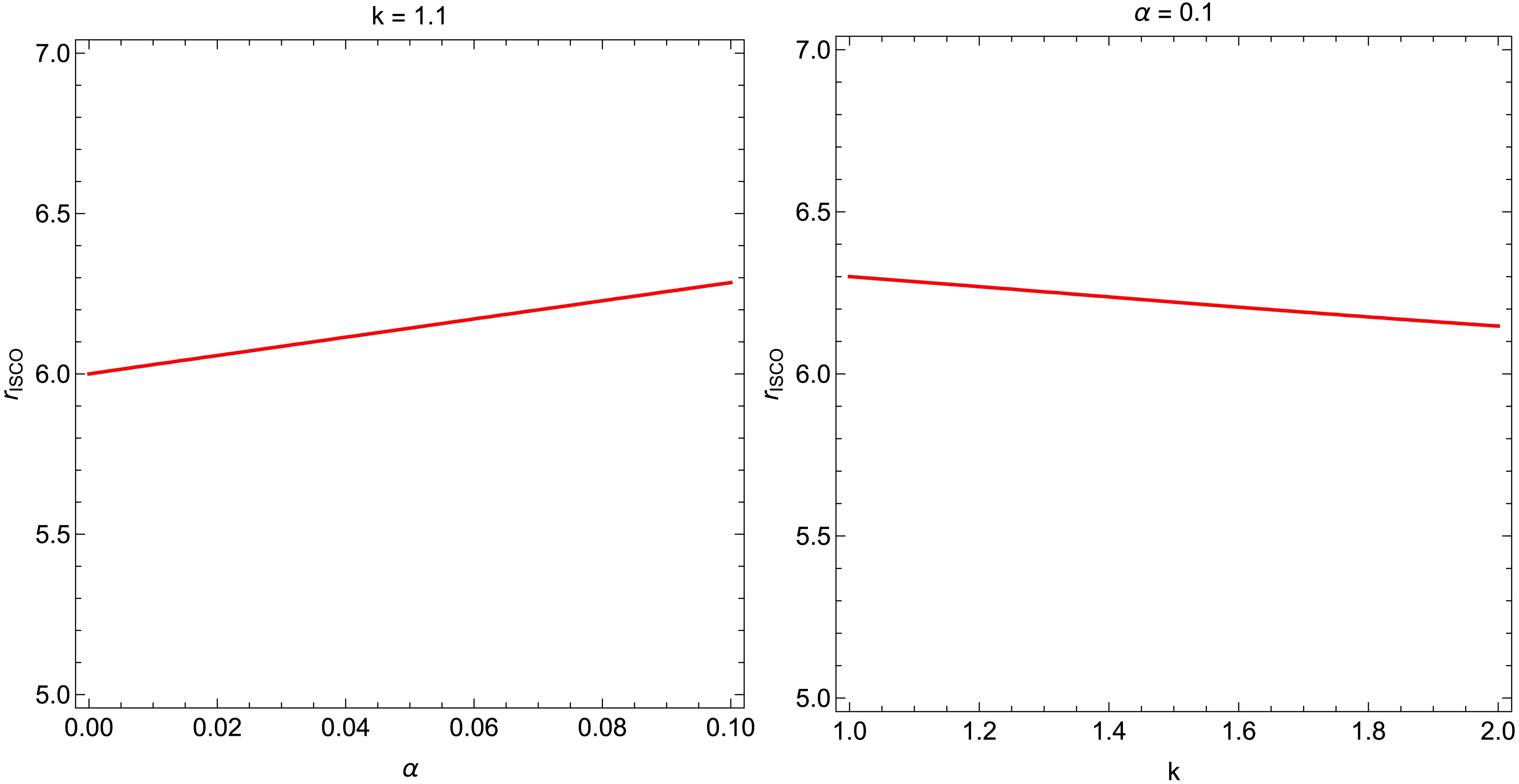 $ {{\cal{L}}} $ increases with α but decreases with k, while$ {{\cal{E}}} $ shows non-monotonic dependence on α.● The ISCO radius grows with α and shrinks with k, deviating from the fixed Schwarzschild value
