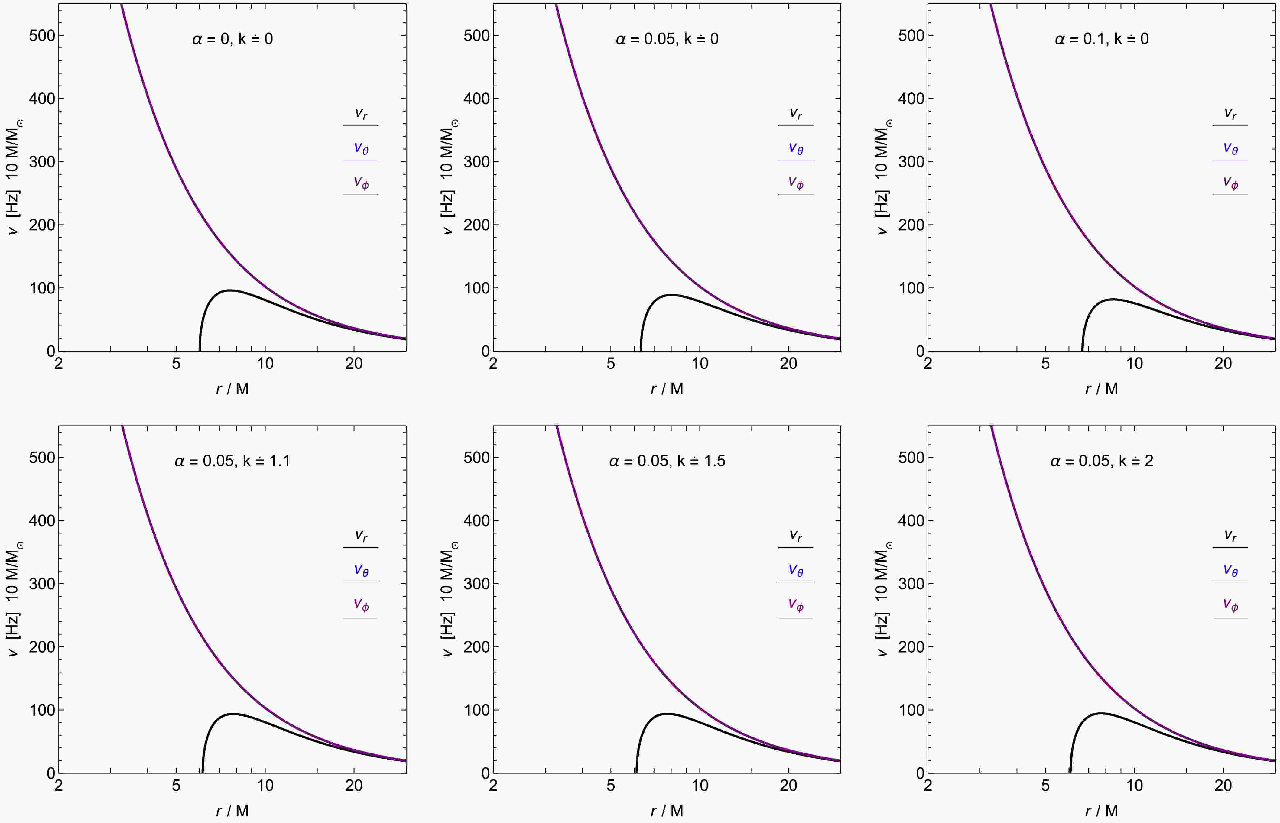 $ (\nu_r, \nu_\theta, \nu_\phi) $ of neutral test particles measured by a distant observer for a BH of mass$ M = 10,M_\odot $ in non-local gravity. The frequencies are shown as functions of the radial coordinate$ r/M $ . (i) Top left panel: Schwarzschild limit ($ \alpha = 0 $ ). (ii) Top right and middle panels: Fixed k with increasing values of α. (iii) Bottom panels: Fixed$ \alpha = 0.05 $ and varying$ k = 1.1, 1.5, 2.0 $ . The orbital and vertical frequencies coincide, while the radial frequency is strongly affected by the non-local parameters. -