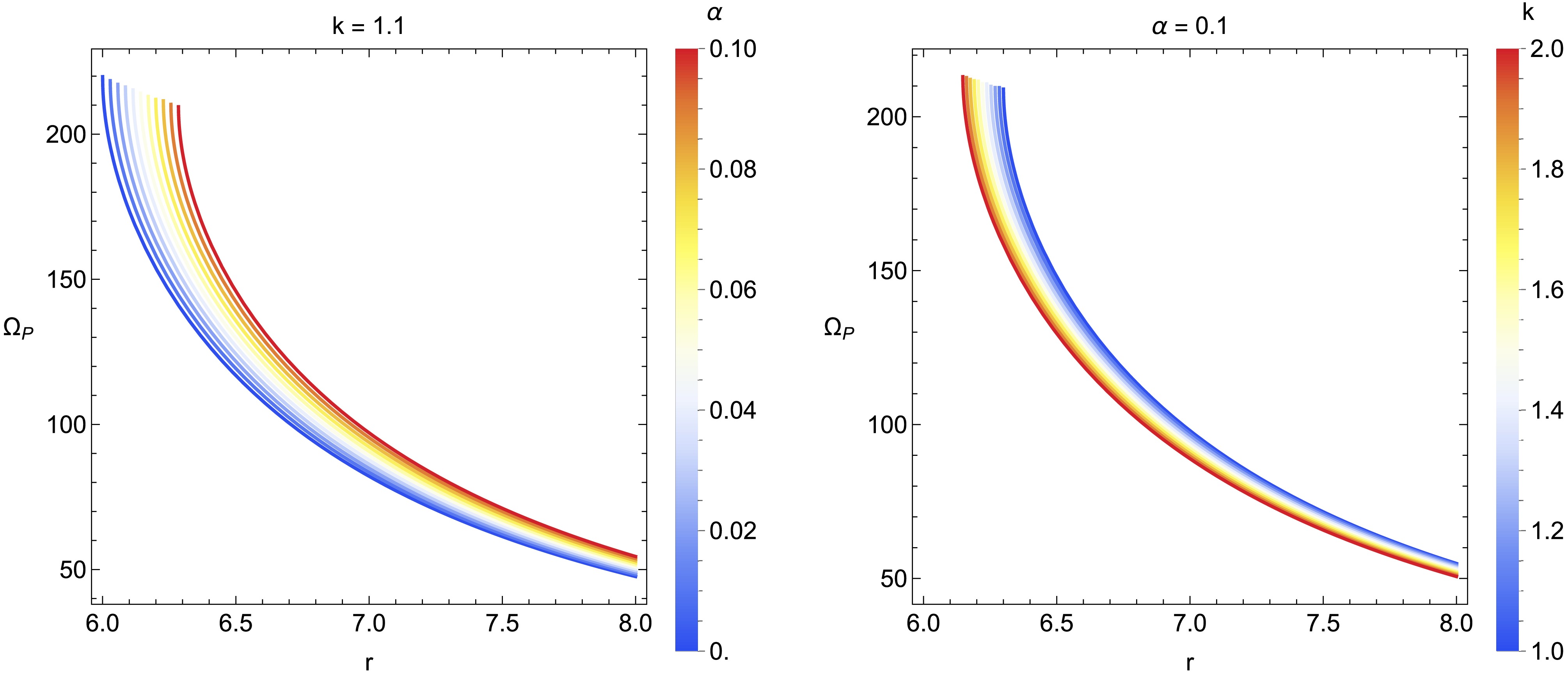 $ \Omega\_{P} $ with different values of the parameter α, while the second panel presents the case for different values of k. The increase in k reduces the frequency of the periastron, whereas the larger values of α improve it. In addition,$ \Omega\_{P} $ also decreases as the radial distance r increases.