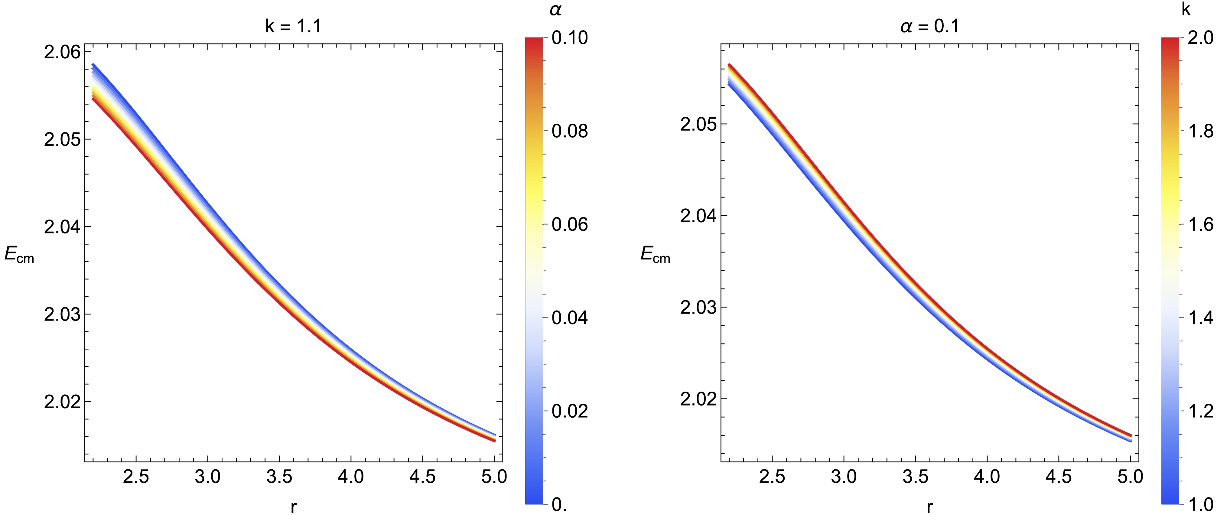 $ {{\cal{E}}} $ corresponding to circular equatorial orbits in the same background. Also, the plot indicates that for circular orbits, the energy initially increases when the BH parameter α increases, but after a certain stage it starts to decline for larger α. A comparable trend is obtained when the parameter is changed k. In addition to this, the figure also shows that the energy$ {{\cal{E}}} $ of the particles grows as the orbital radius r increases.