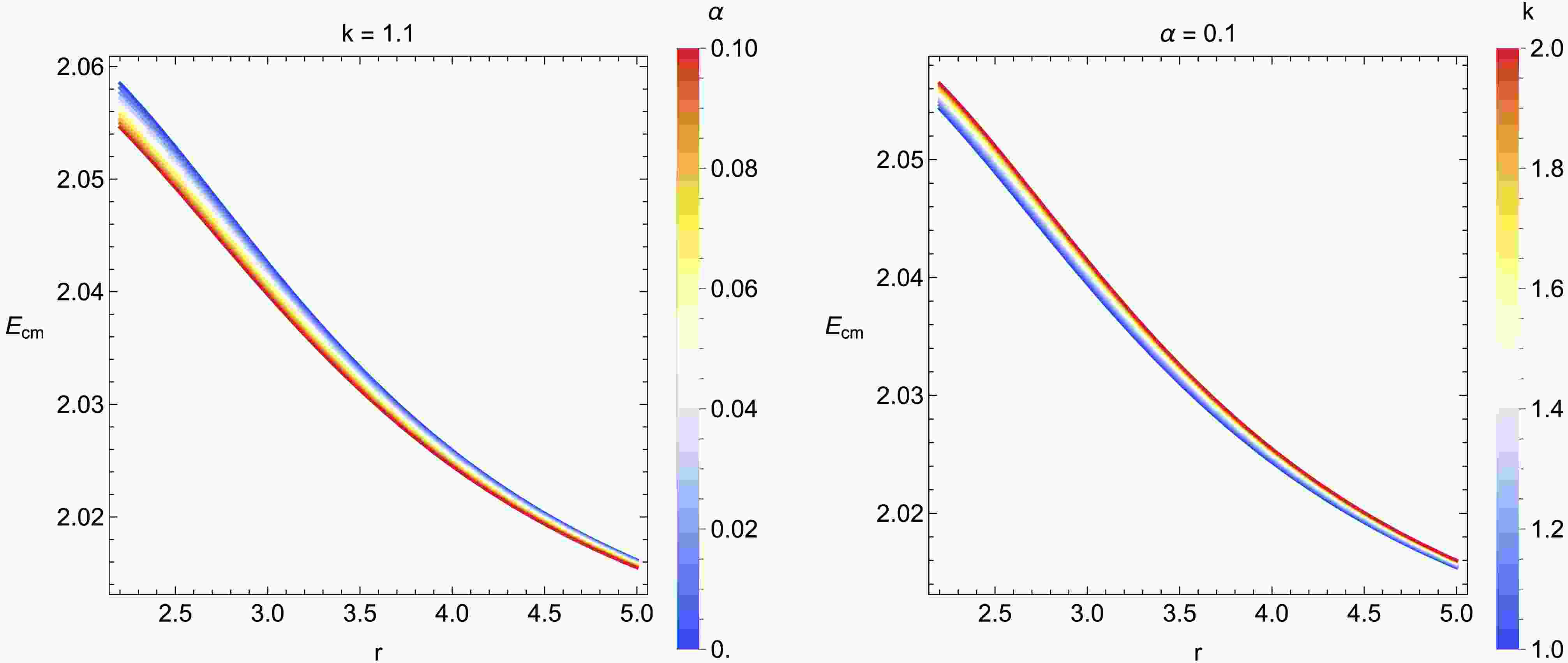(47) ● Figure 9 illustrates how the CME behavior with the radial distance r for a non-rotating BH in non-local gravity. Also, collisions near the horizon can be seen to generate large energies. In this case, increasing the parameter k raises the CME, while larger values of α reduce it. In addition, as the distance r increases, the radial profile of the CME decreases steadily.
