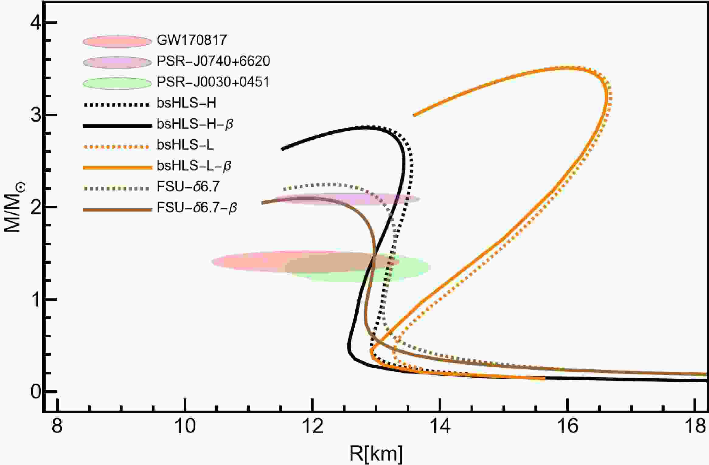 In order to show the rationality of the above discussions, we also plot the M-R relations in beta equilibrium matter—a more realistic case but beyond the present framework—in Fig. 3. One can see that the maximum mass of a NS doesn't change much, while the M-R relations all become more compact, favored by observations. So, the inclusion of beta equilibrium matter doesn't change the main conclusion drawn above.