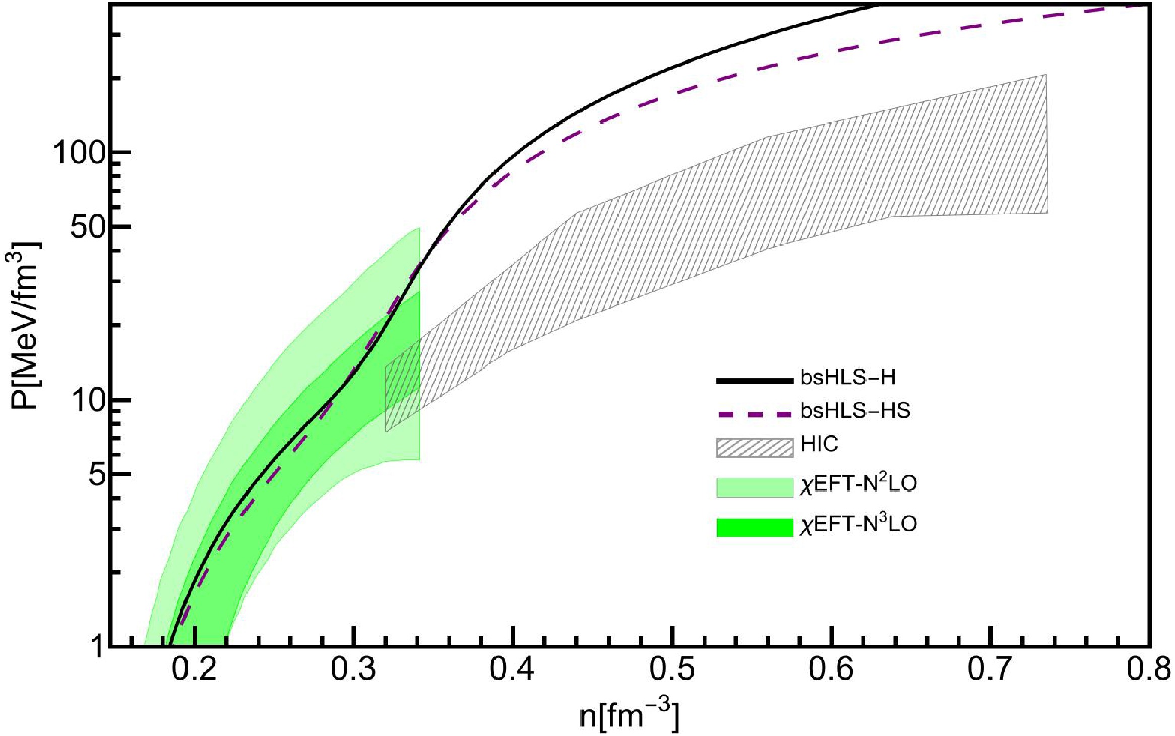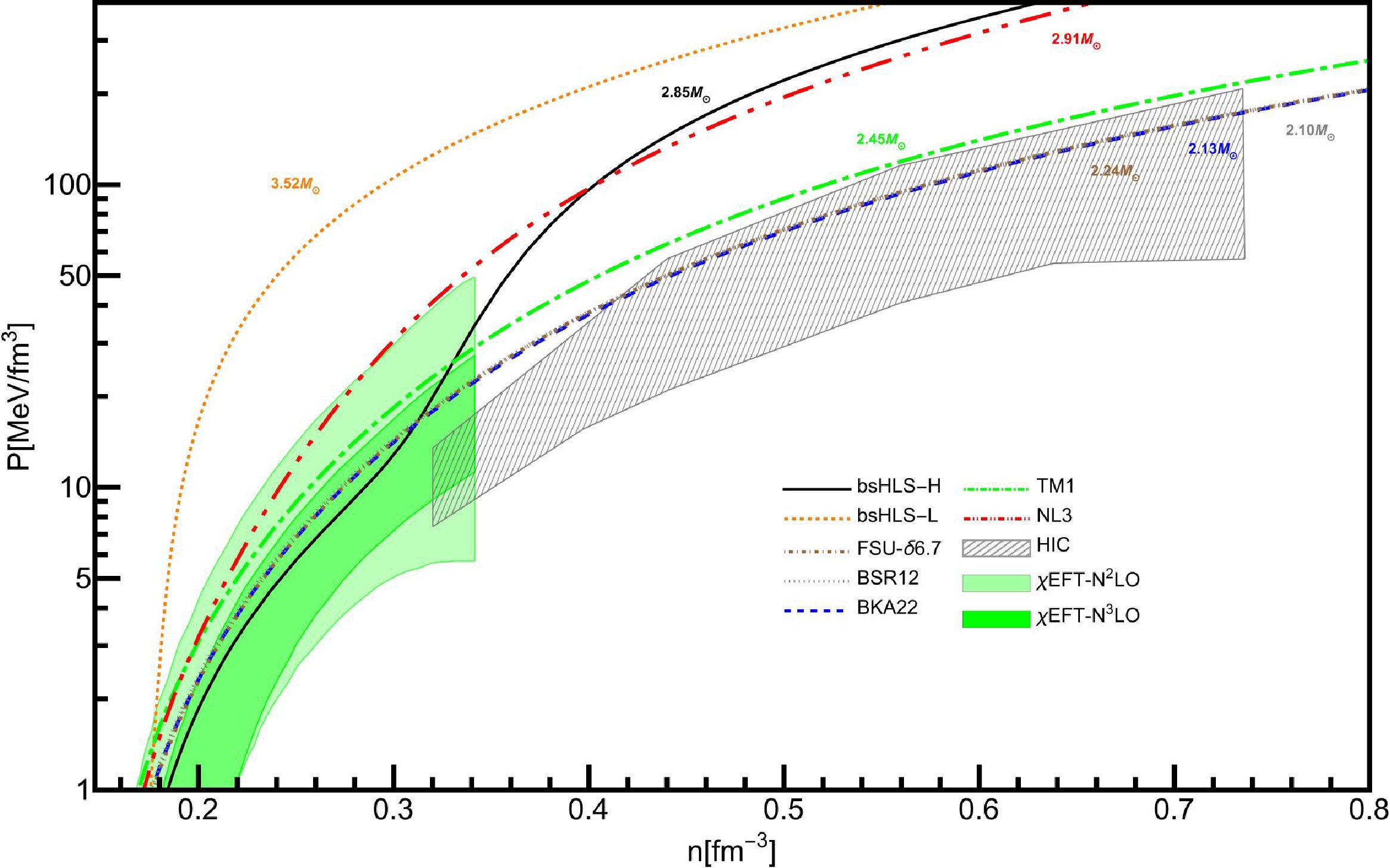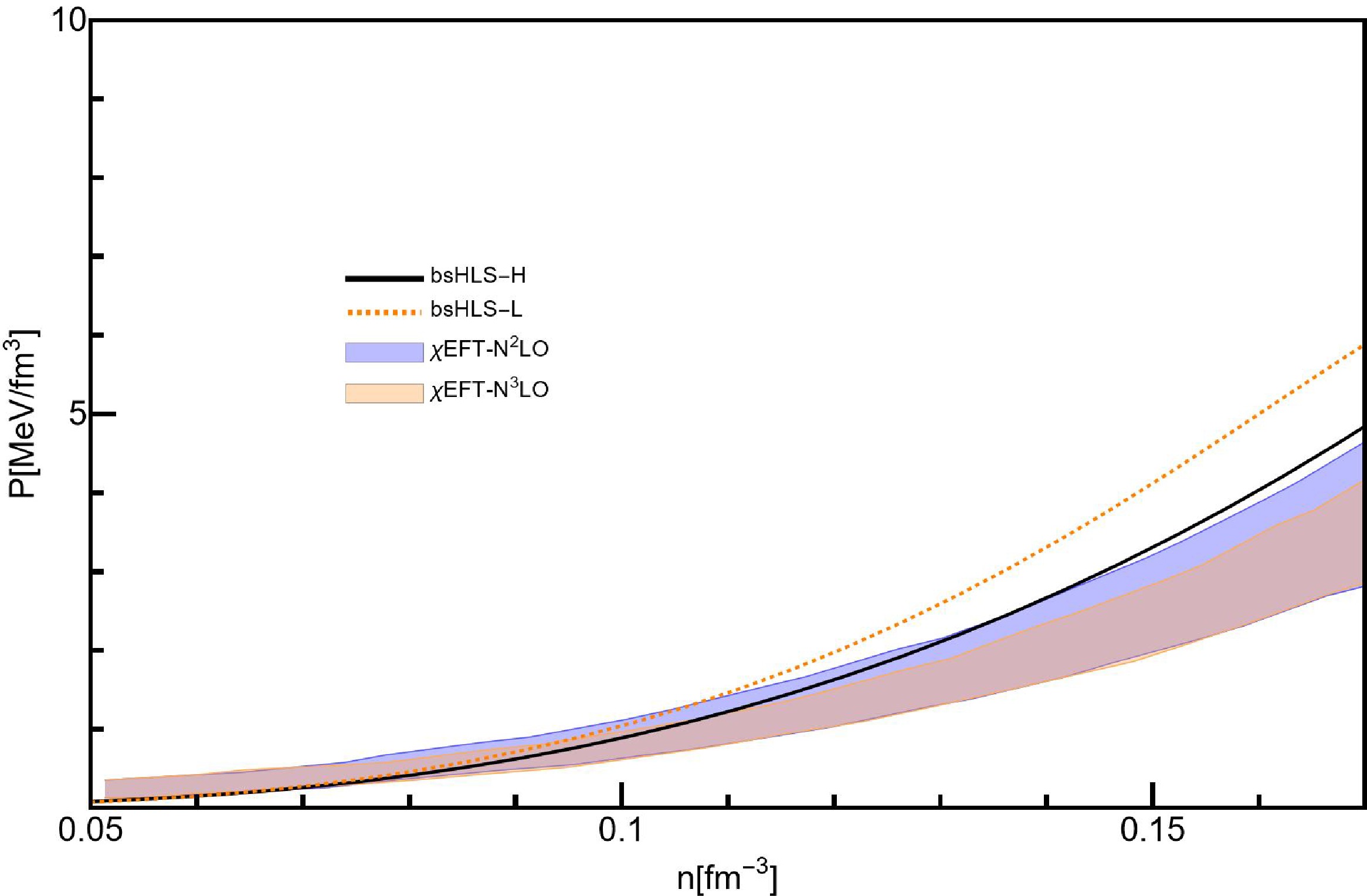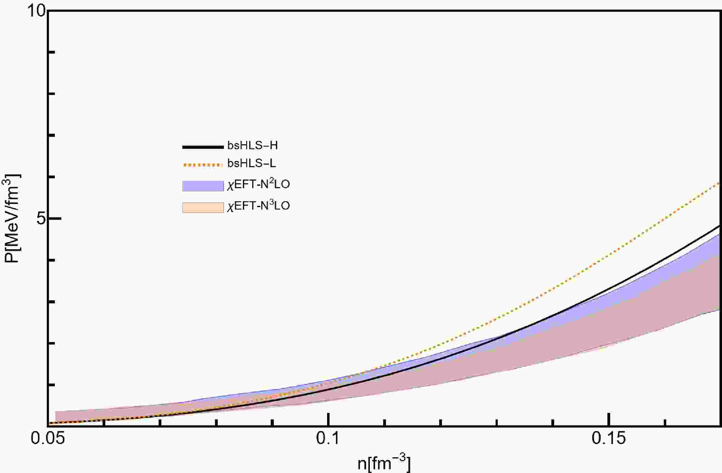 • The difference between bsHLS-L and bsHLS-H becomes significant in the M-R relation, as shown in Fig. 2 and discussed in the previous section, though it is not distinguishable from the NM properties around saturation density. In order to understand these more deeply, the pressure of PNM is calculated around and below saturation density, and compared with the results of the conventional chiral nuclear force, as shown in Fig. 4. One can see that the pressure of bsHLS-H can align with the constraints up to saturation density, while bsHLS-L is a little higher around $n_0$. But at low densities, below $0.1 {\rm{fm}}^{-3}$, the chiral nuclear force and bsHLS results are consistent with each other due to the fact that the mesons can be integrated out at this region in the description of nucleon interactions, leading to the equivalence of the two approaches. It strengthens the solidness of our results.