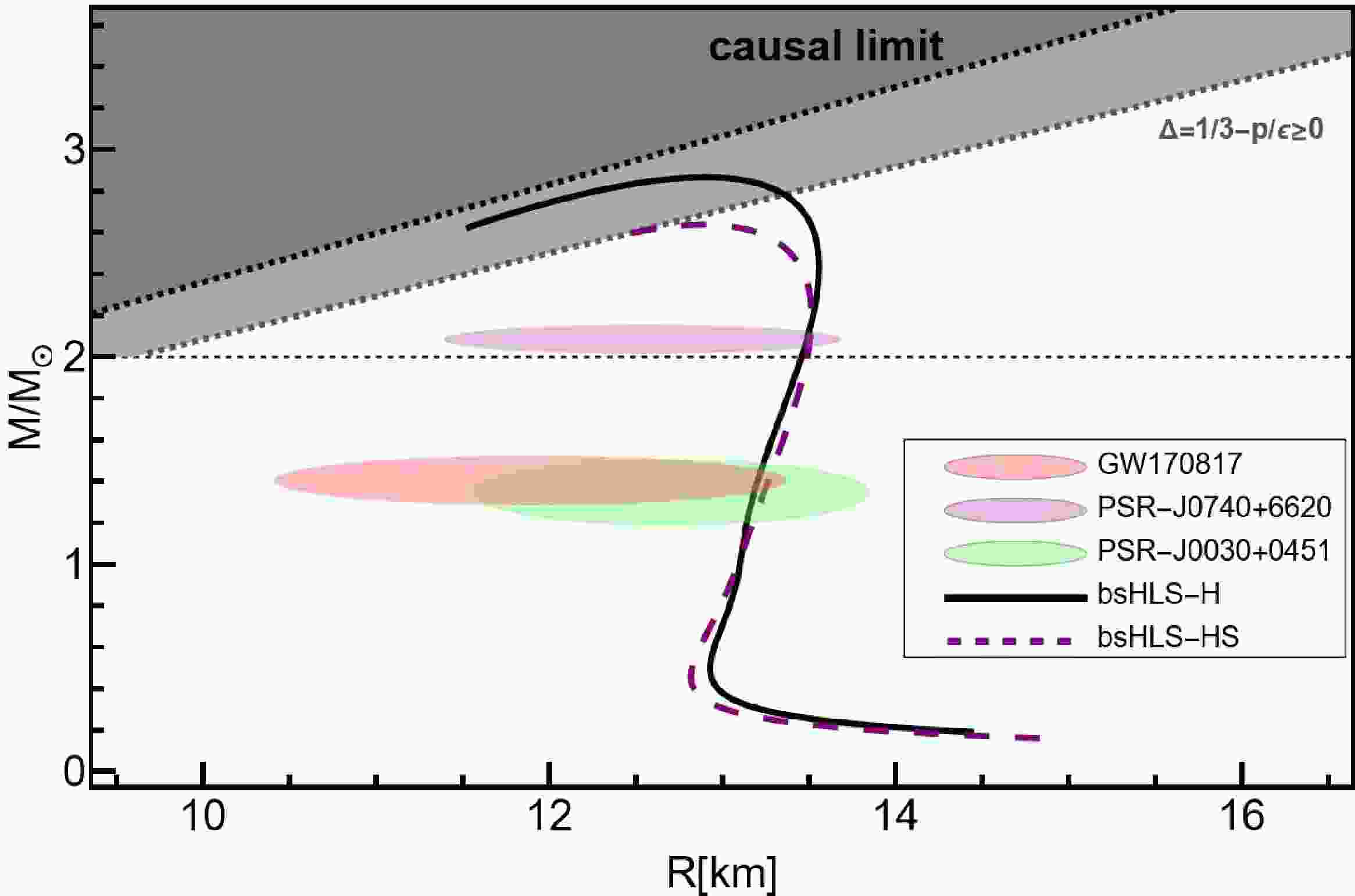 It is found that, as listed in Table 5, the NM properties can be reproduced with the parameter set bsHLS-HS: $M_{\sigma}=2.25\times10^5\ {\rm{MeV}}^2$, $\beta'=1.14$, $g_{\omega NN}=11.5$, $g_{\rho NN}=4.27$, $g^{SSB}_{\omega NN}=8.70$, $g^{SSB}_{\rho NN}=4.85$, $r=0.20 $ and $R=0.02 $. And, as shown in Fig. 6, the M-R relations for PNM are roughly consistent with observational constraints, but there is a decrease of $ M_{\rm{max}} $ compared to bsHLS-H, which makes the M-R relation fall within the positive trace anomaly region.