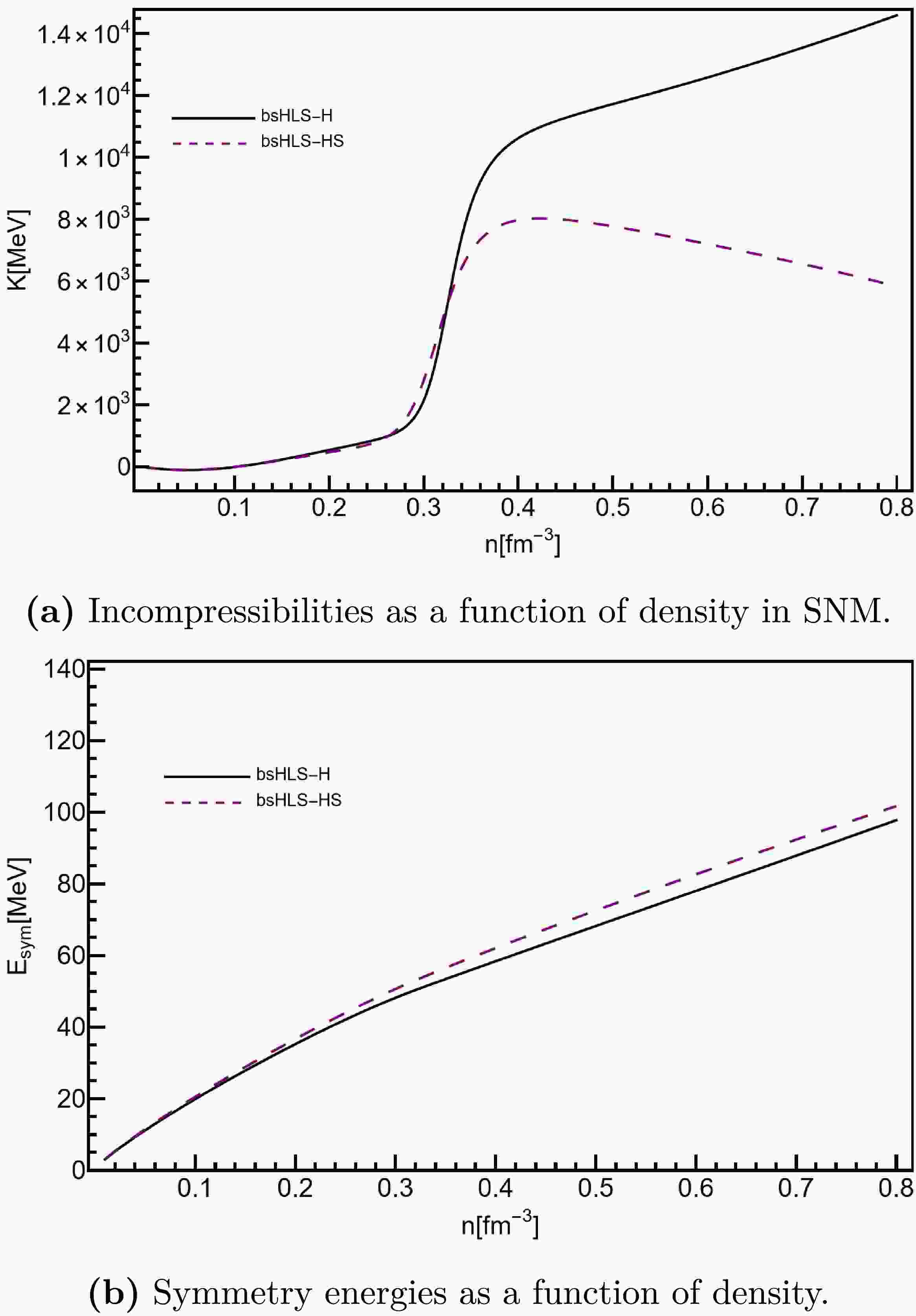 In order to understand the discrepancies in the M-R relations, the incompressibilities and symmetry energies are also calculated for bsHLS-H and bsHLS-HS, shown in Fig. 7.